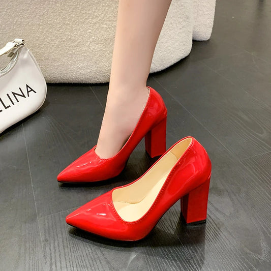 Amay 10cm High Heel Colorful Pumps Women's Shoes Pointed Toe Fashion Red 3.9inch Chunky Heels Patent Leather Female Plus Size 49 50