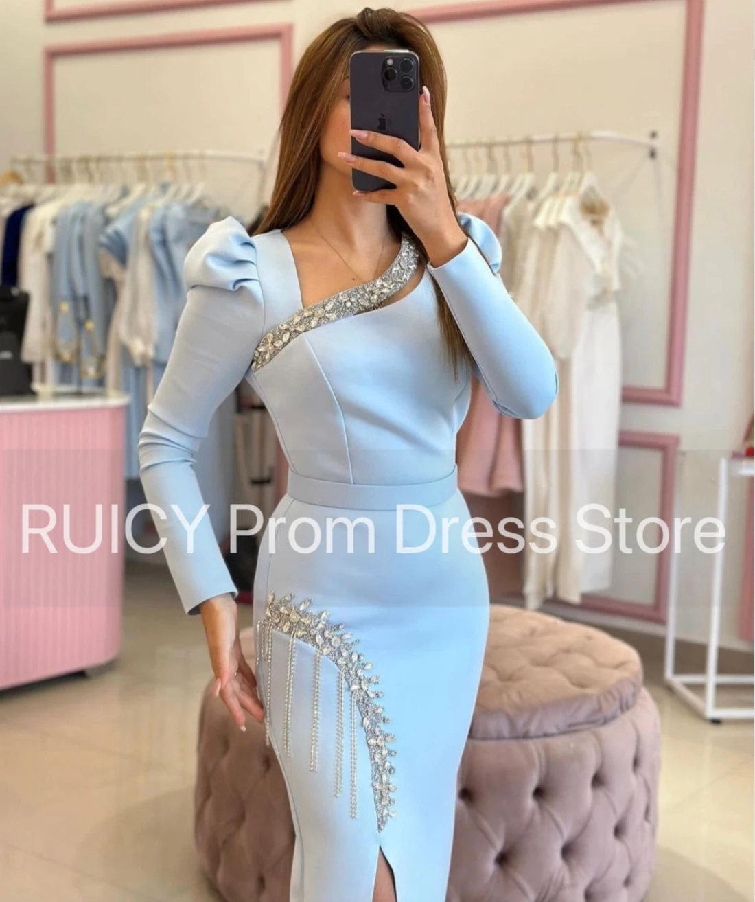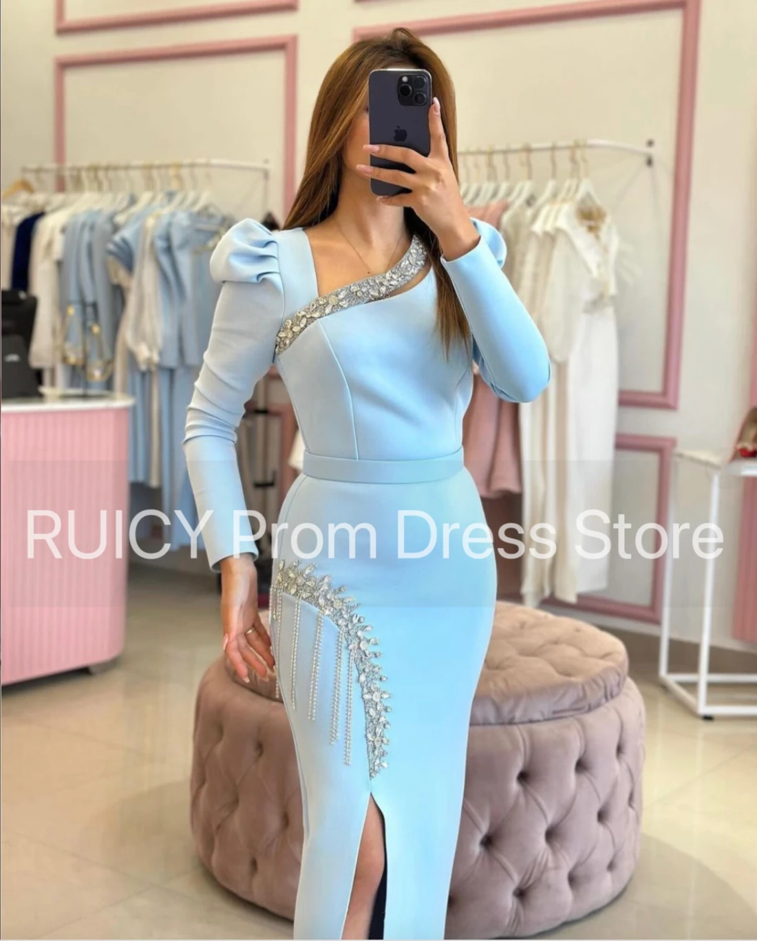 Amay Baby Blue Prom Dresses Long Sleeve Mermaid Crystal Slit Elegant Wedding Guest Party Dress gala Turkey Women Birthday Gown