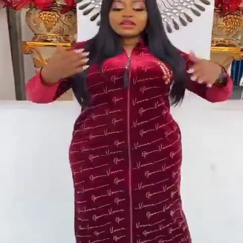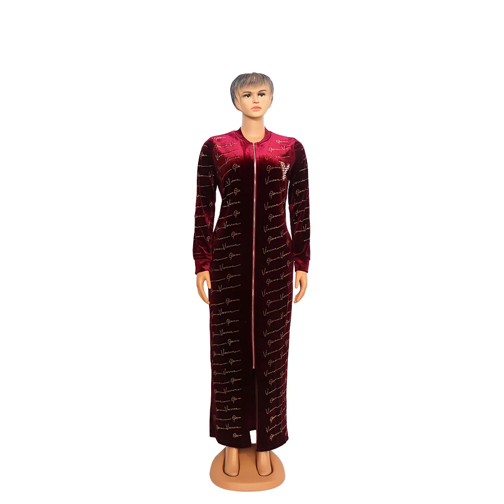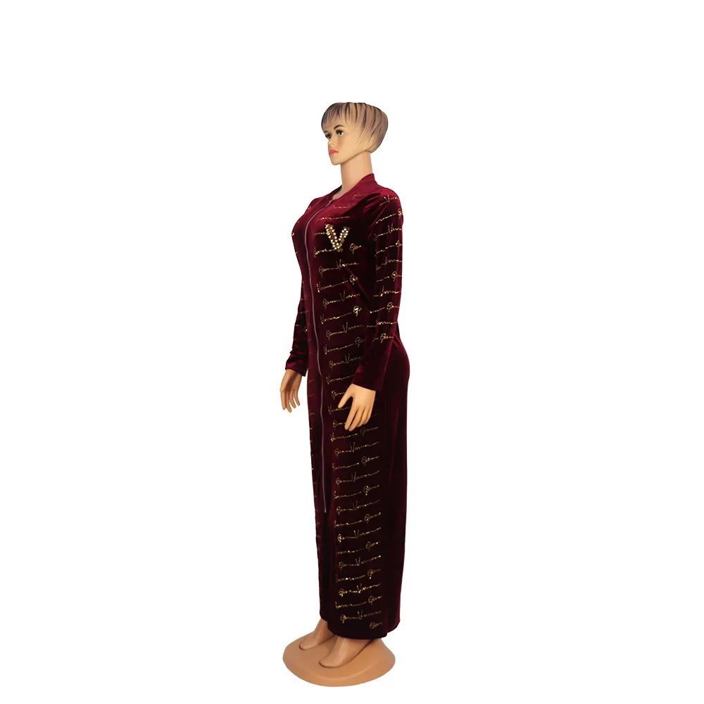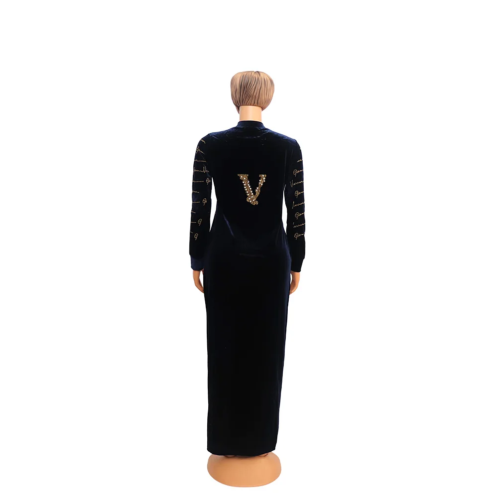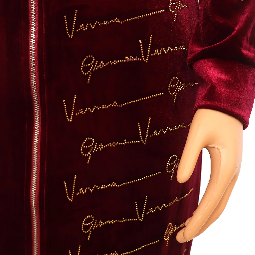 Amay mom fashion dress stretches gold velvet fabric front and back sleeves hot drilling zipper dress