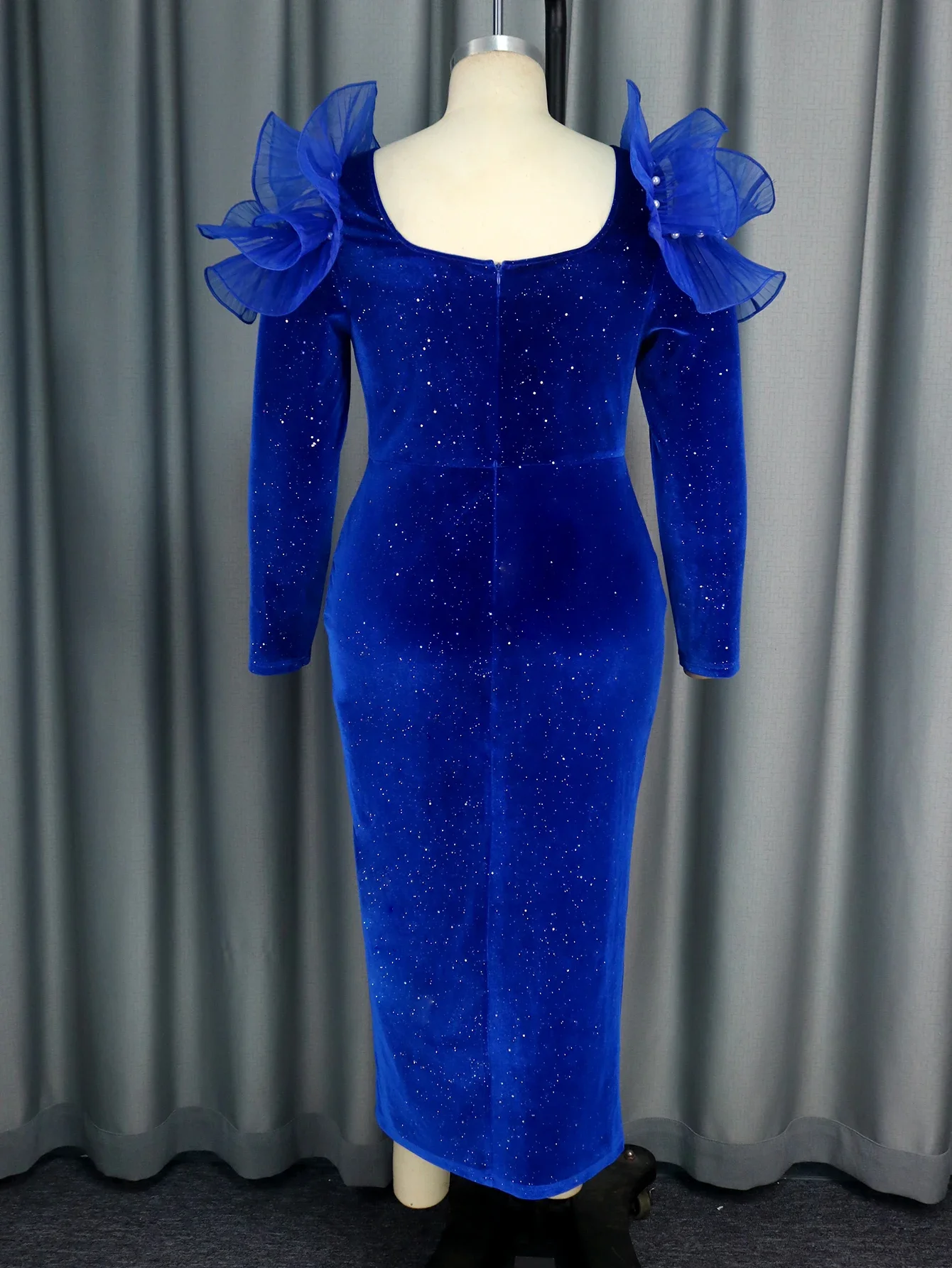 Amay Blue Elegant Party Evening Dress Velvet Winter Wedding Guest Outfit Ruffles Shiny Square Collar Party Long Sleeve Birthday Gowns