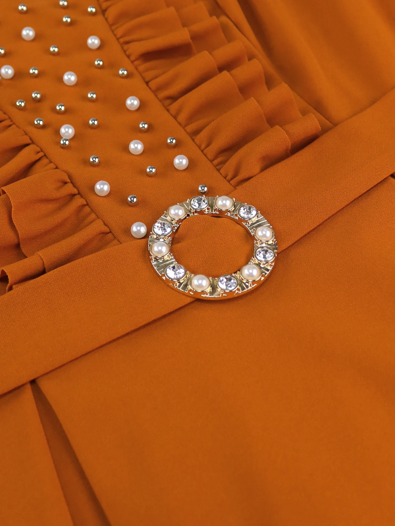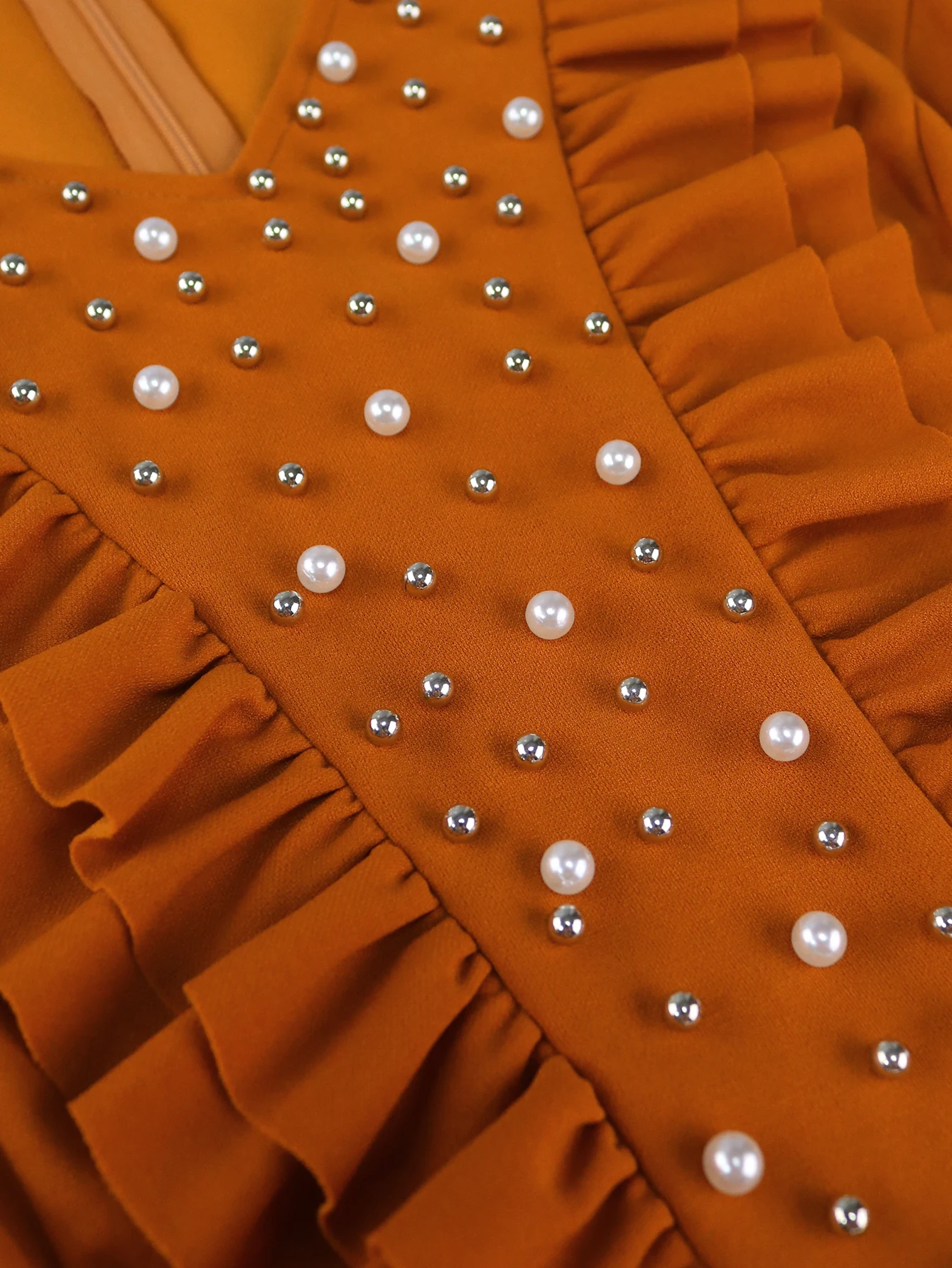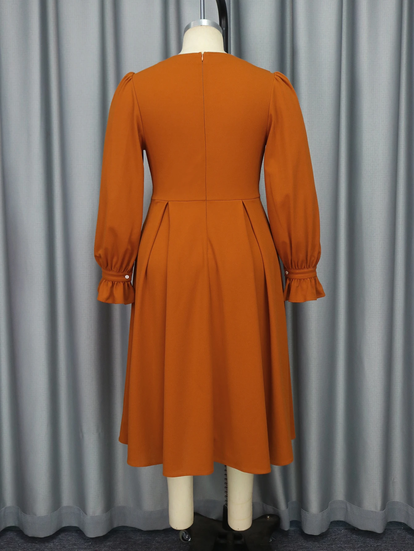 Amay Brown A Line Dresses for Women V Neck Nail Bead Ruffles Long Lantern Sleeve Midi Elegant Fashion Office Lady Daily Party Gowns