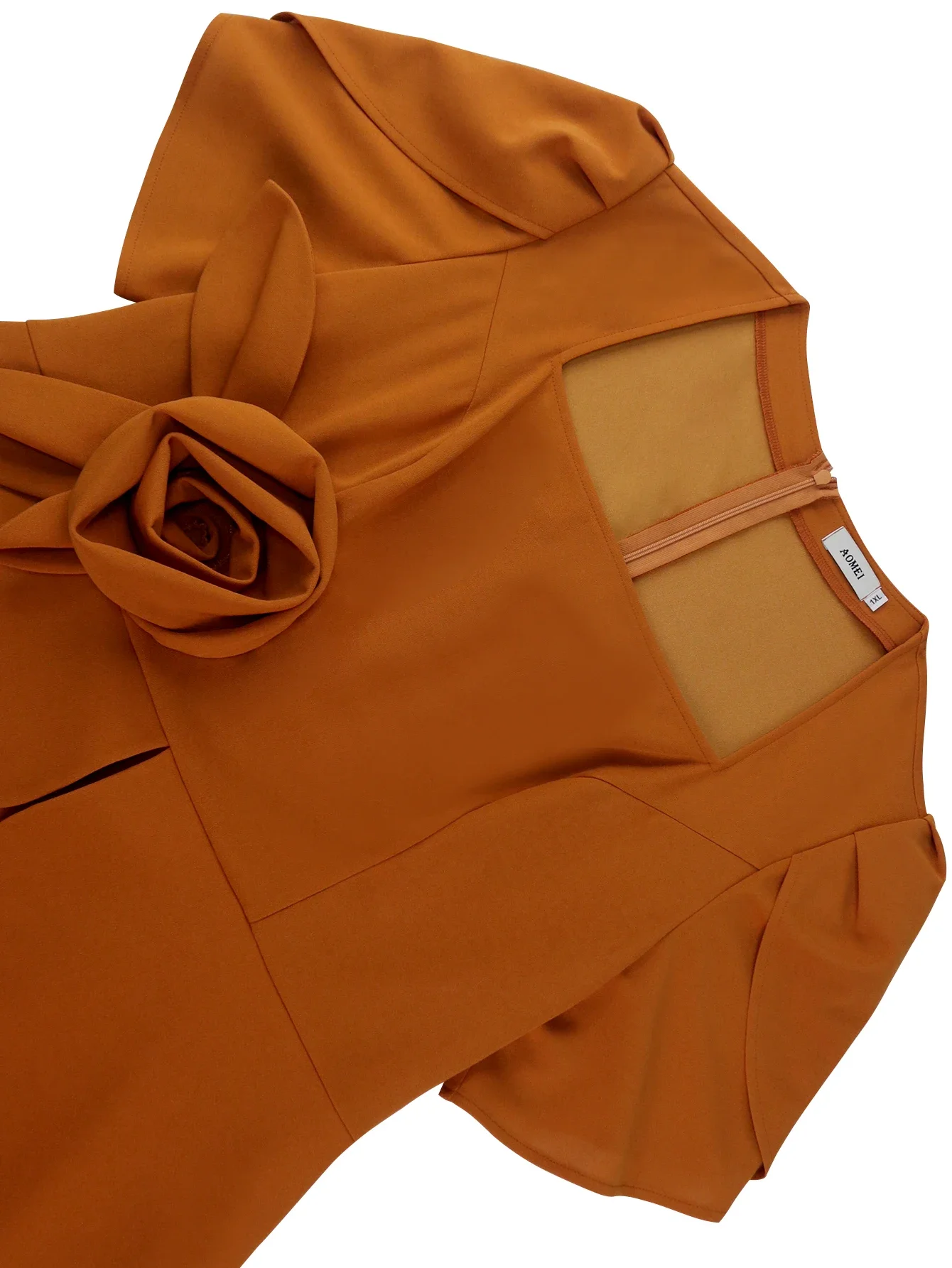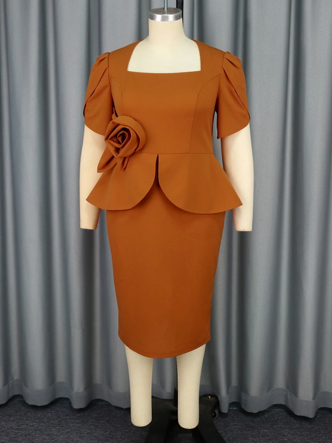 Amay Brown Midi Dresses for Women Square Collar Short Sleeve 3D Flower Ruffles Empire Package Hip Slim Fit Office Work Midi Dress