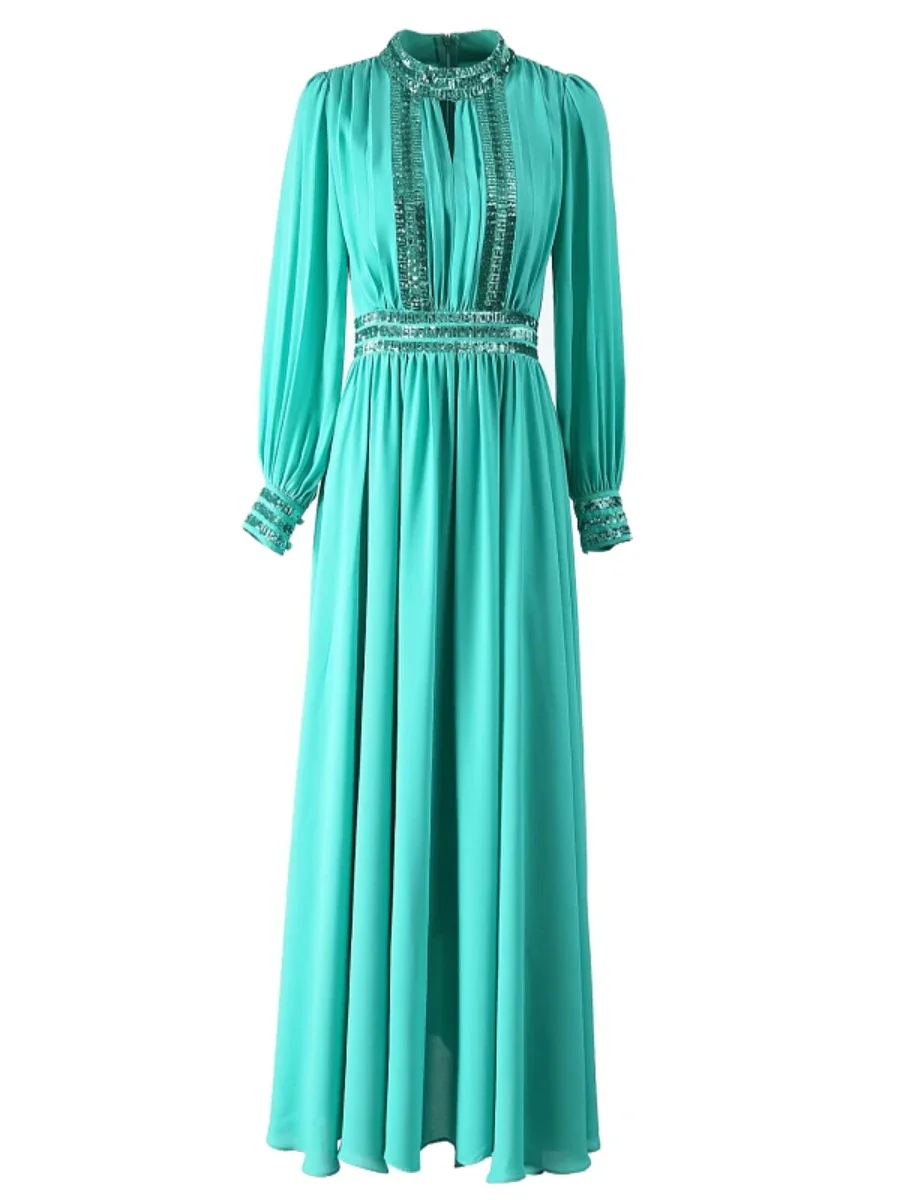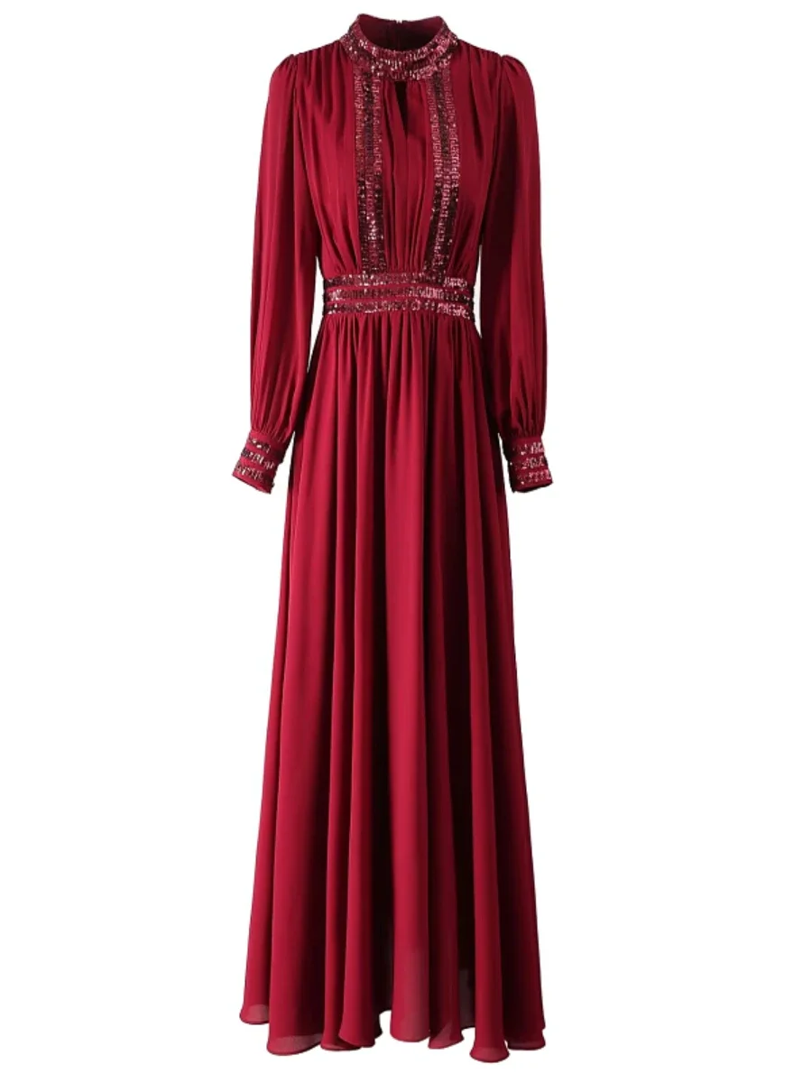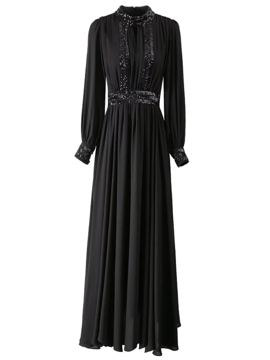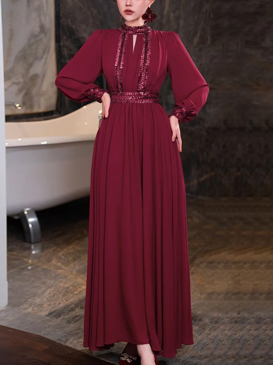 Amay CHICEVER Patchwork Sequined Formal Dresses for Women Stand Collar Hollow Out Long Sleeve High Waist Celebration Dresses Female