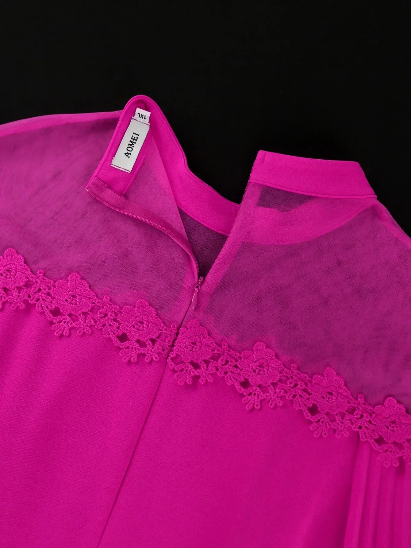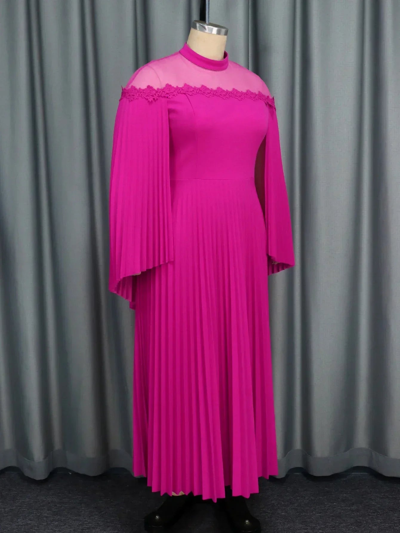 Amay Elegant Long Pleated Dresses Women Half High Collar Cloak Sleeves Mesh Patchwork Fashion Evening Party Maxy Gowns Wedding Guest