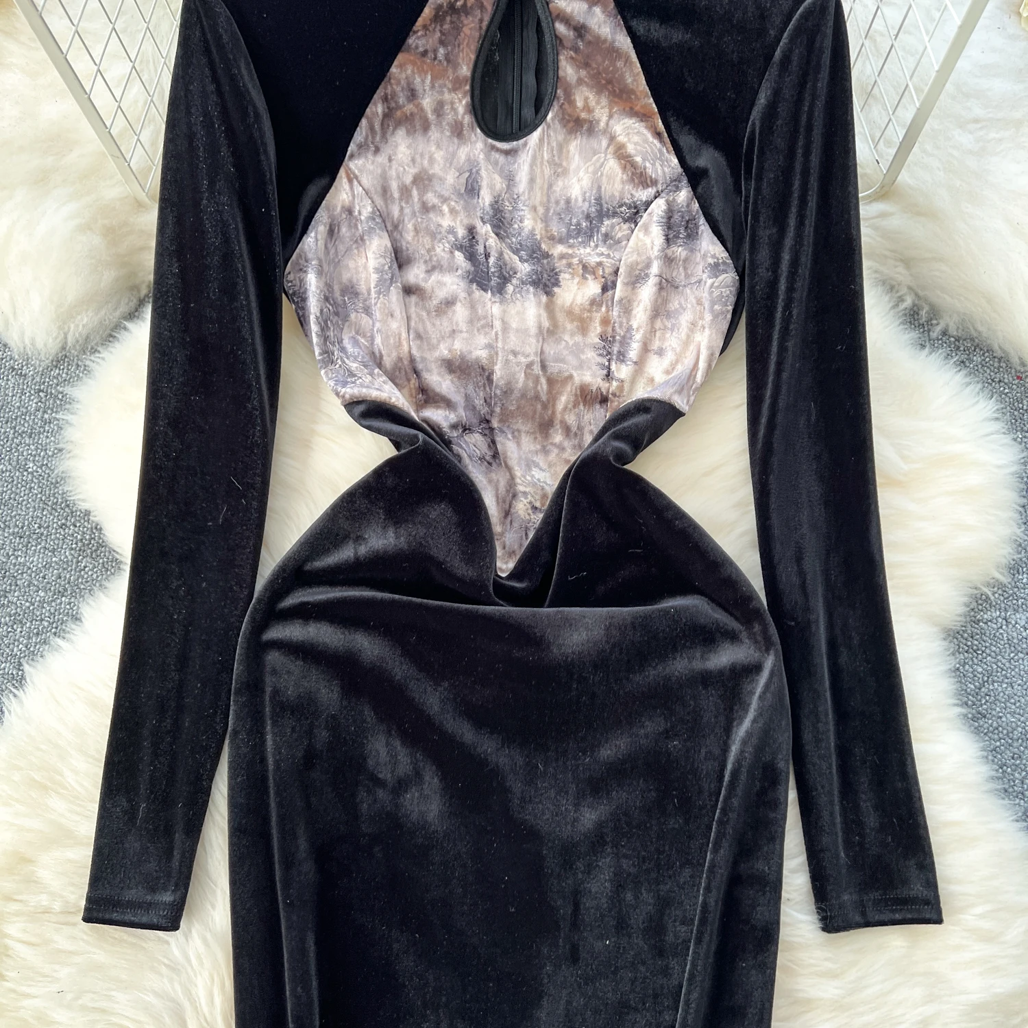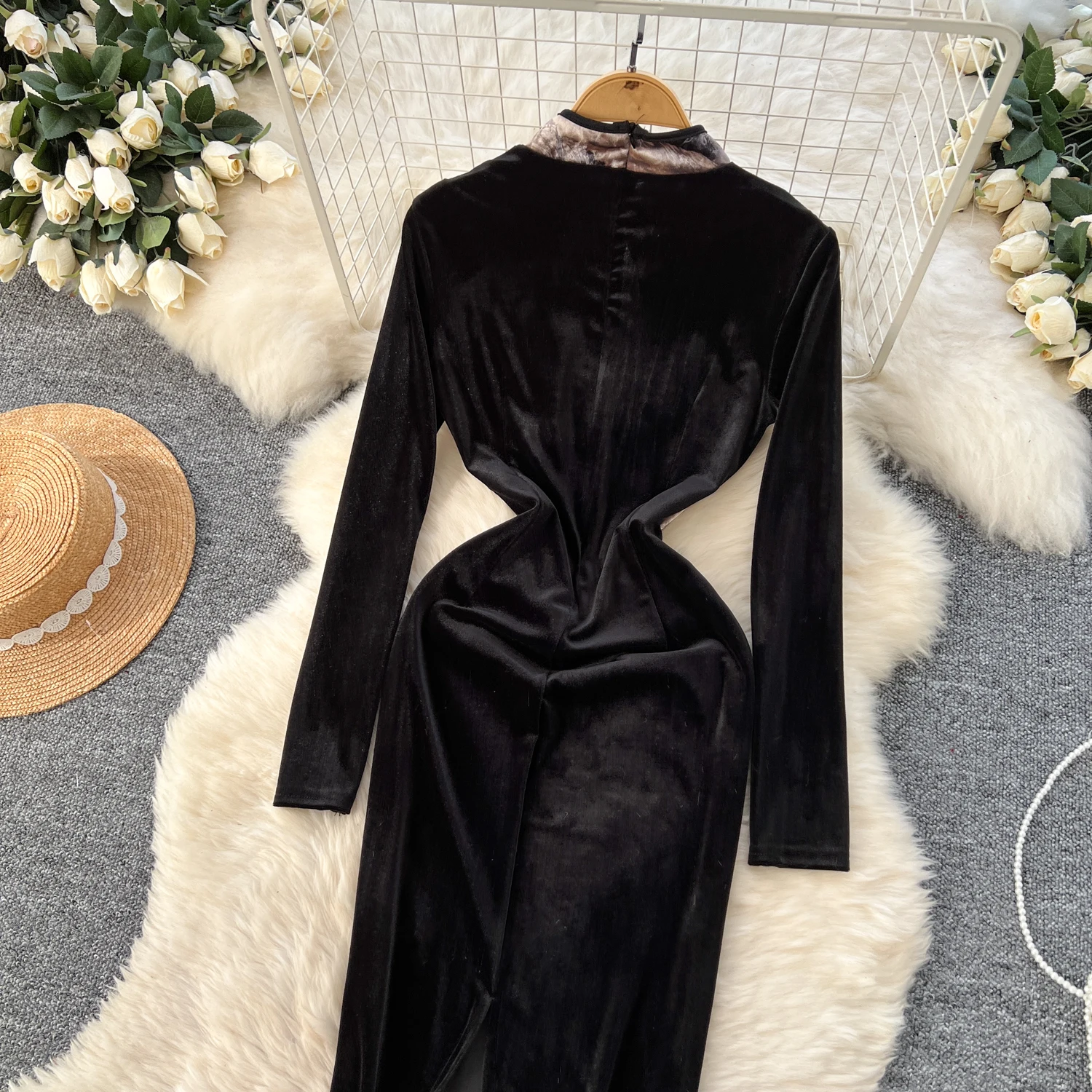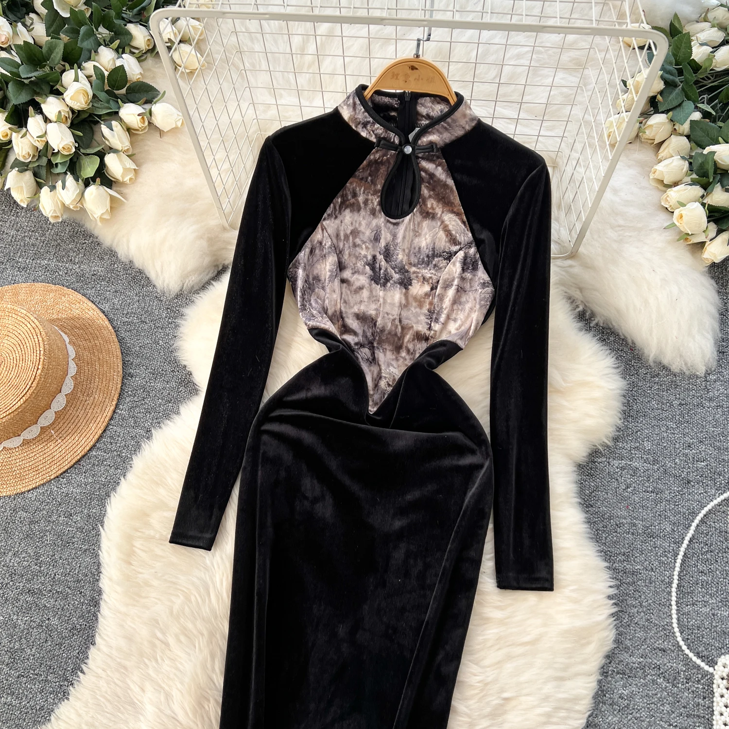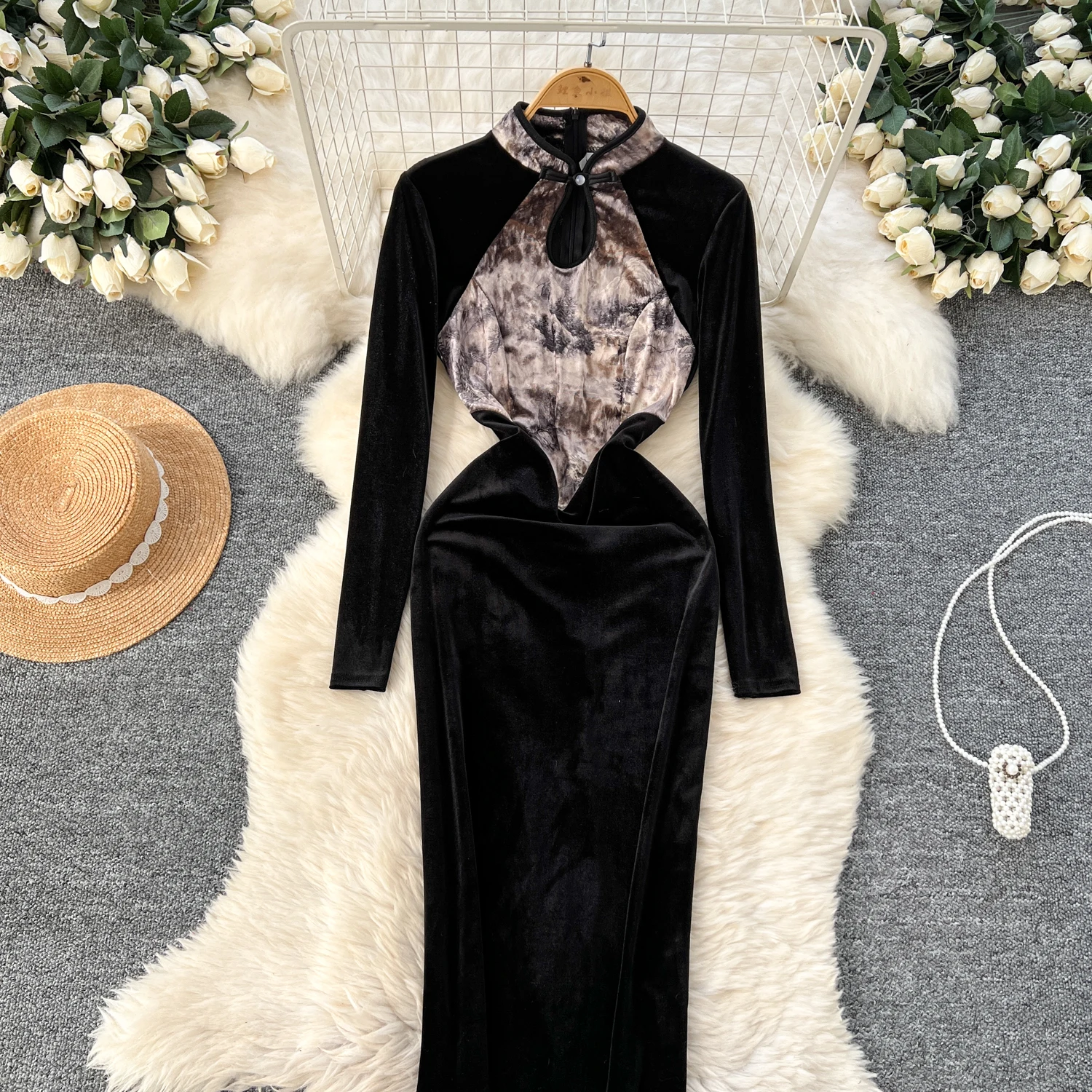 Amay Elegant Long Sleeves Vintage Stand Collar Chic Hollow Out Velour Slim Split Cheongsam Evening High Street Autumn Winter Dresses