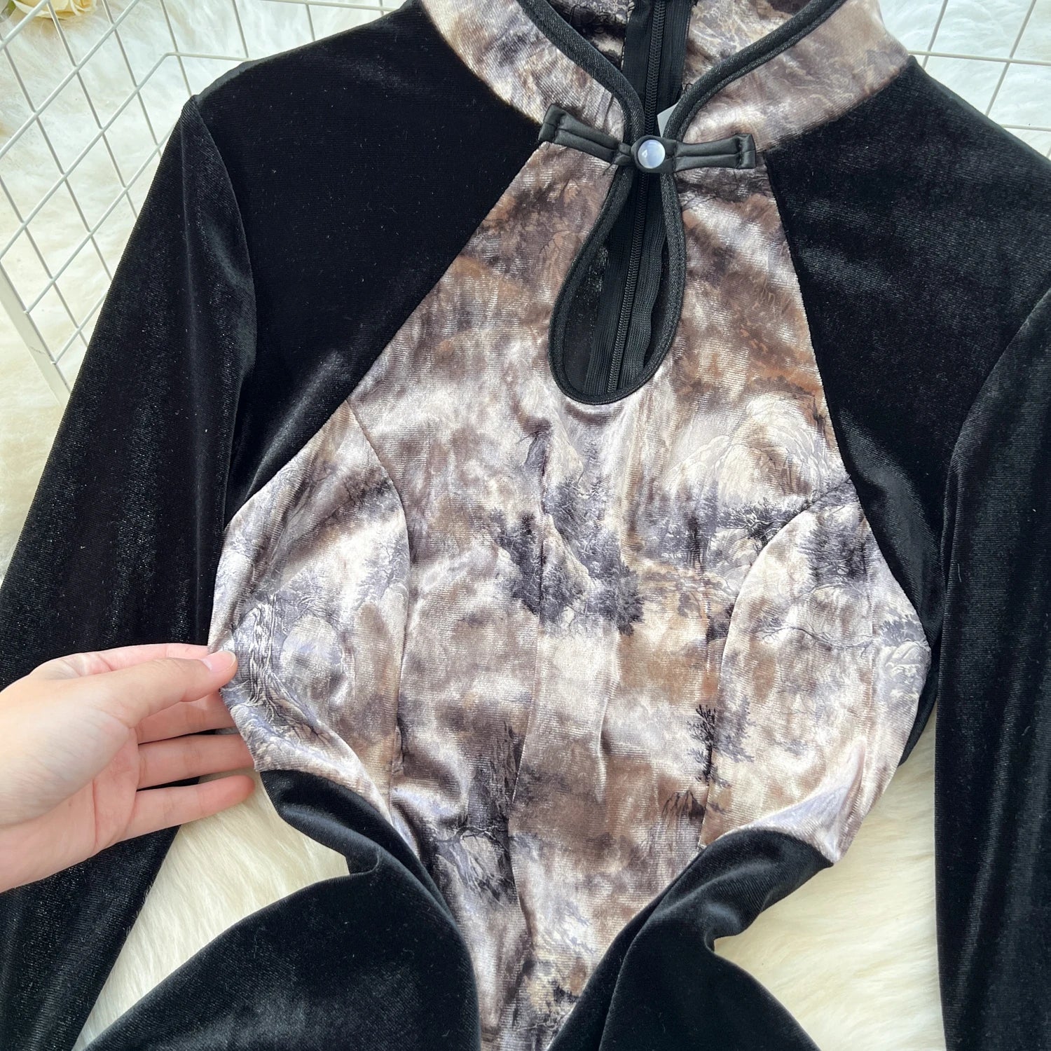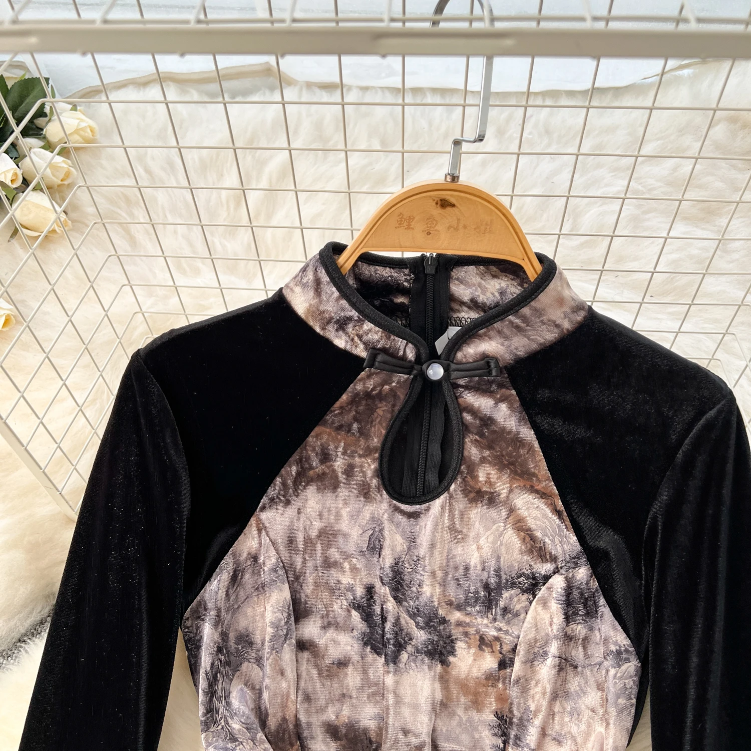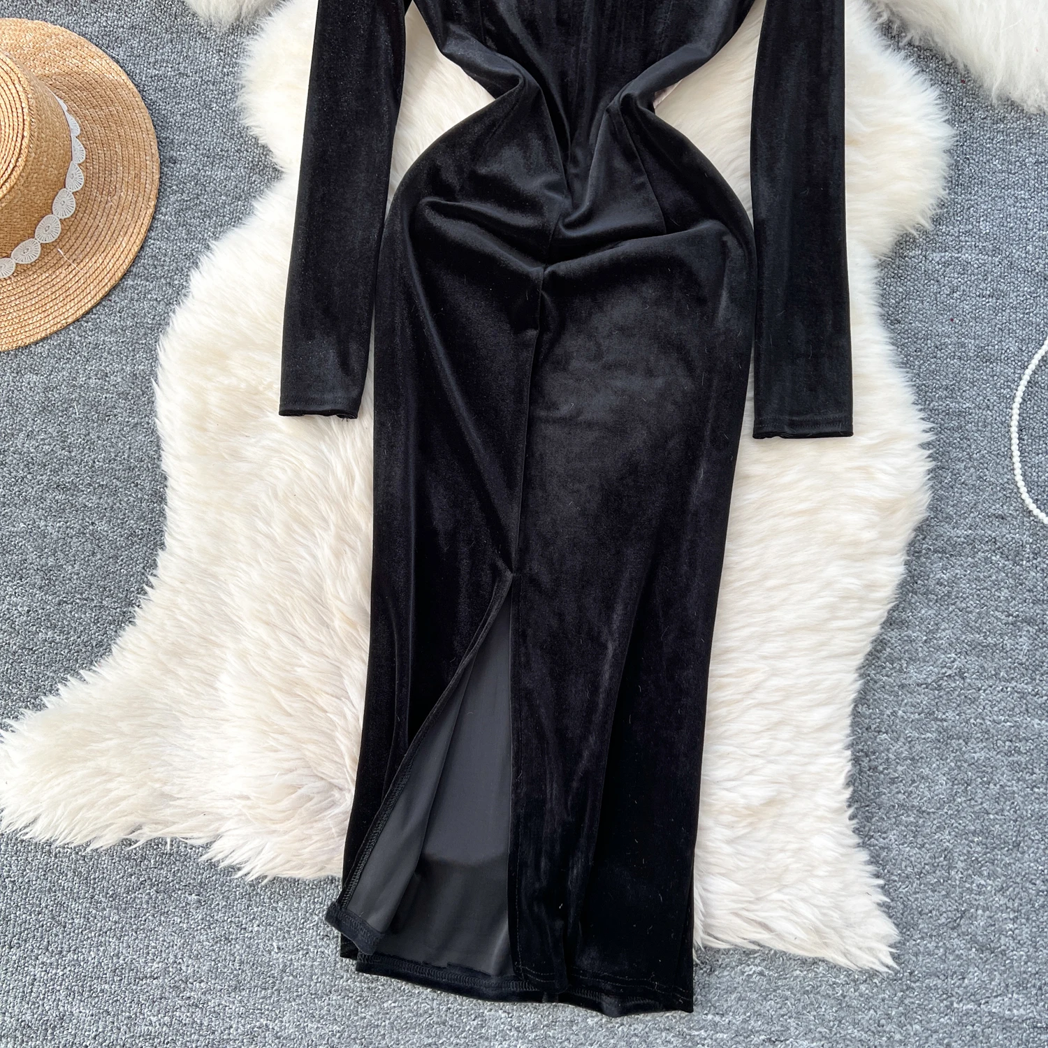 Amay Elegant Long Sleeves Vintage Stand Collar Chic Hollow Out Velour Slim Split Cheongsam Evening High Street Autumn Winter Dresses