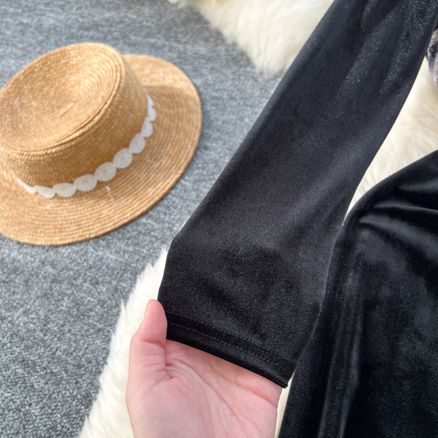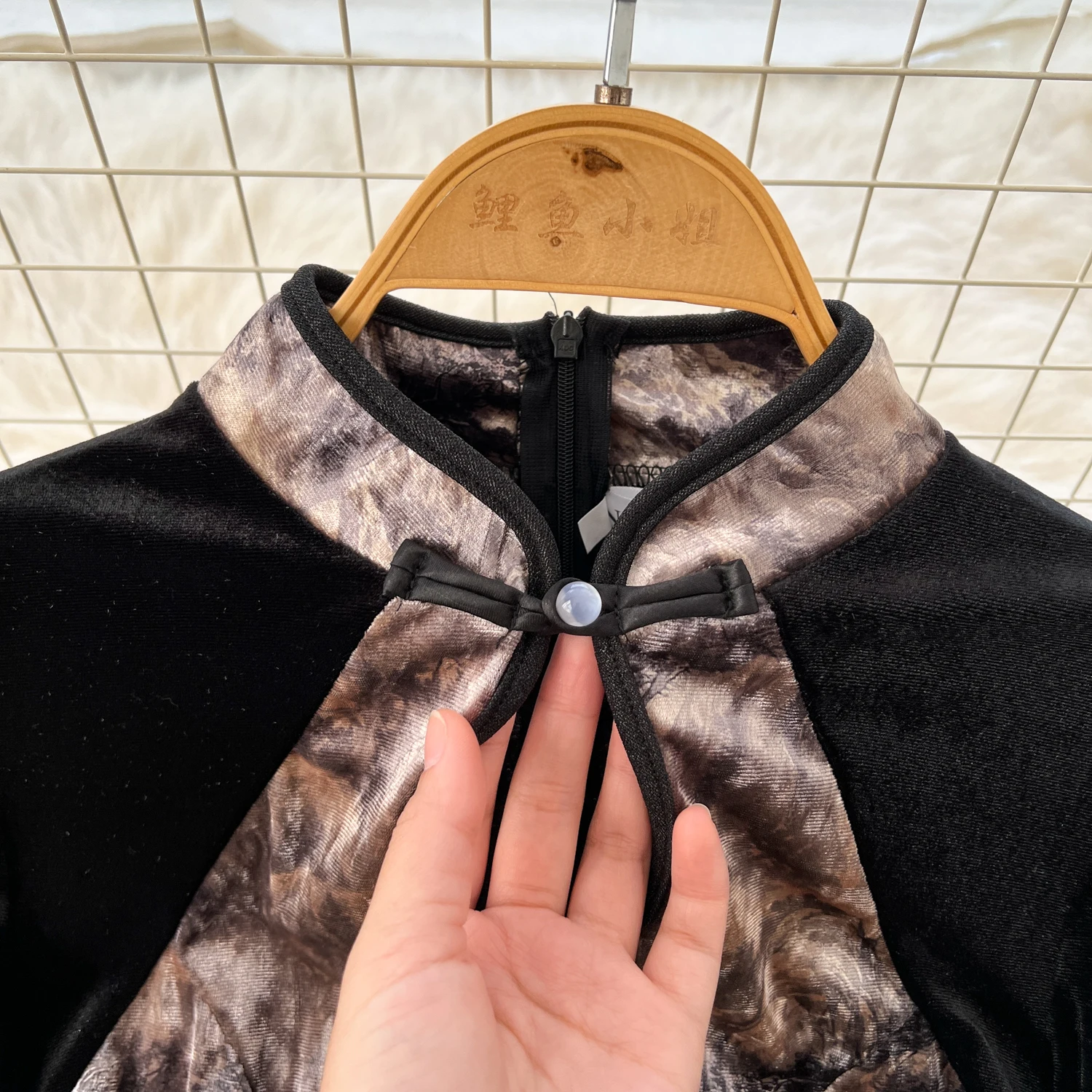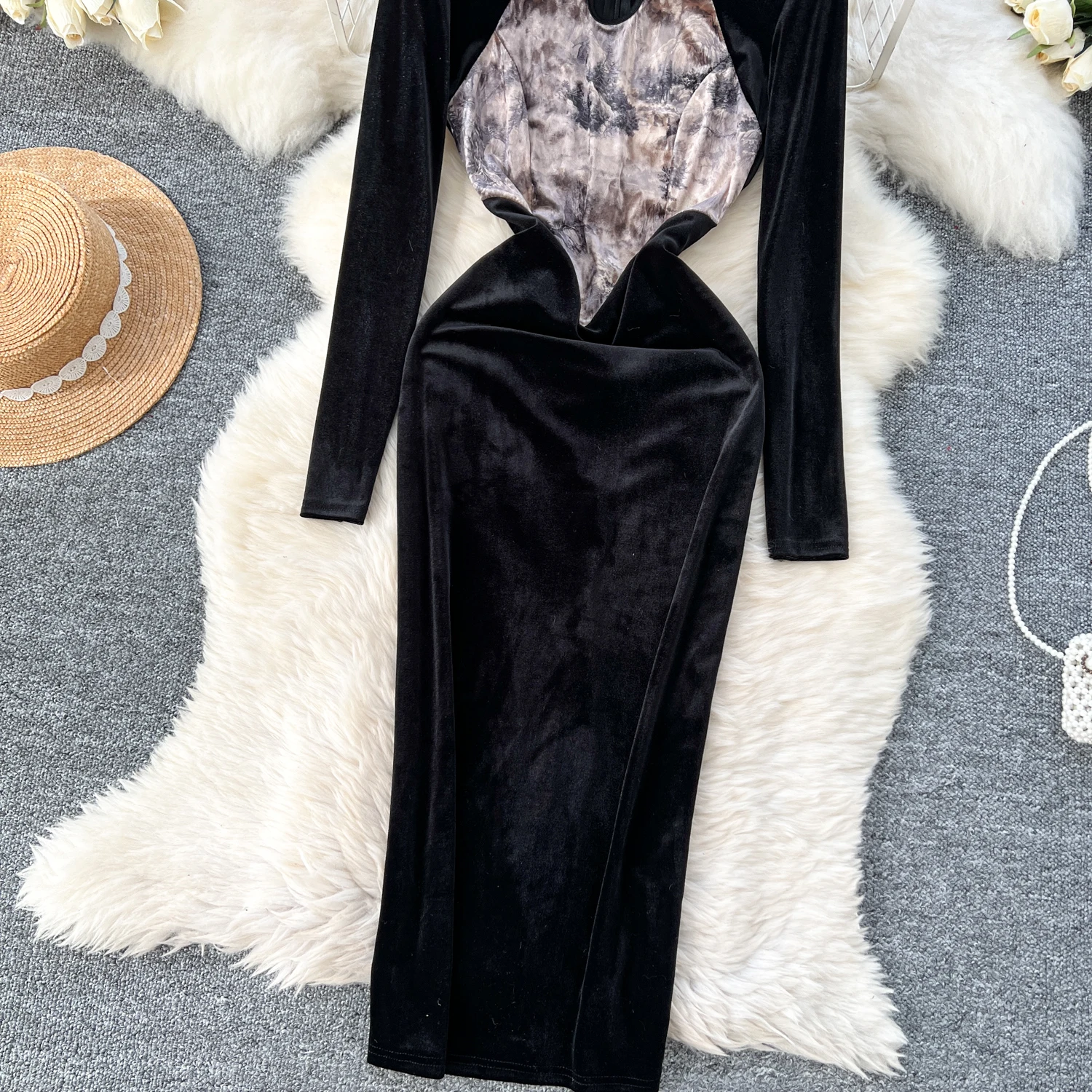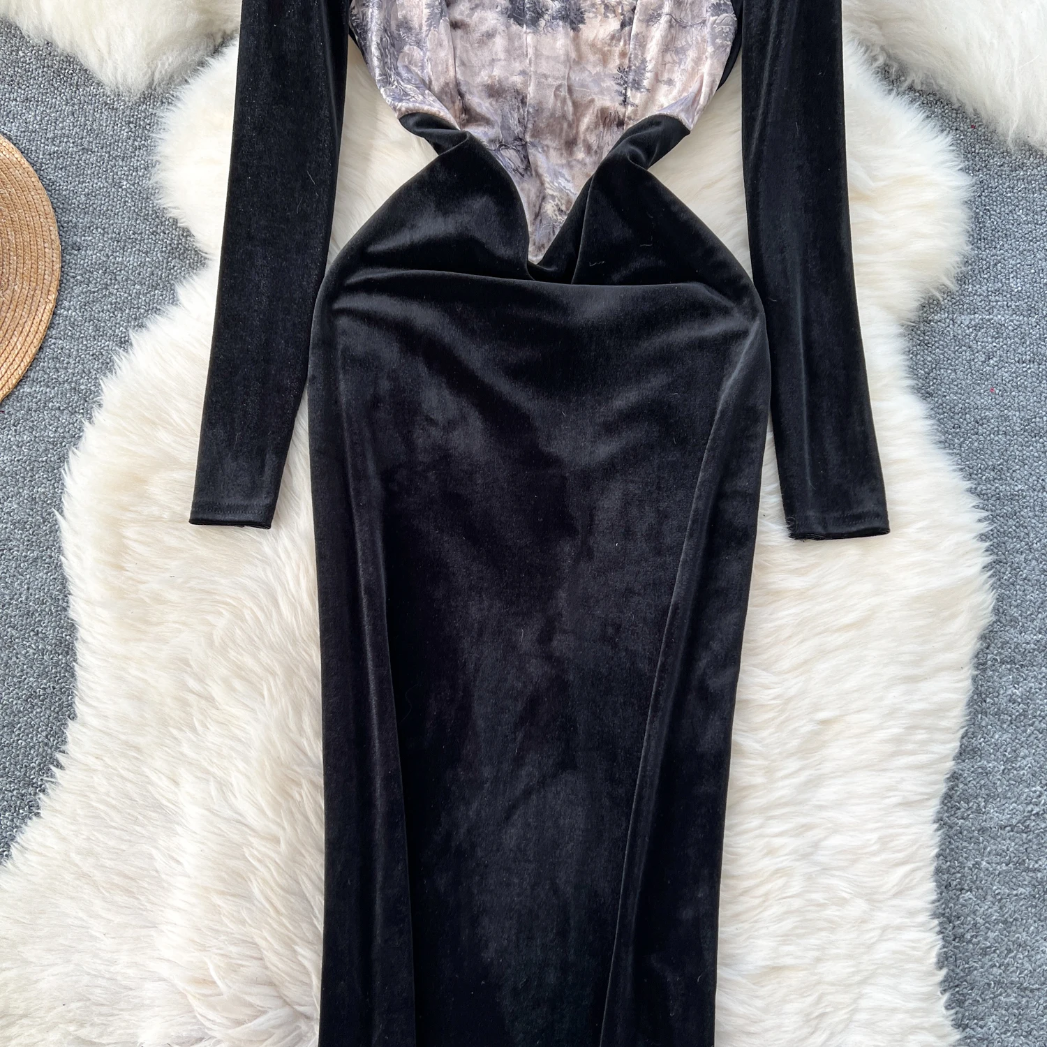 Amay Elegant Long Sleeves Vintage Stand Collar Chic Hollow Out Velour Slim Split Cheongsam Evening High Street Autumn Winter Dresses