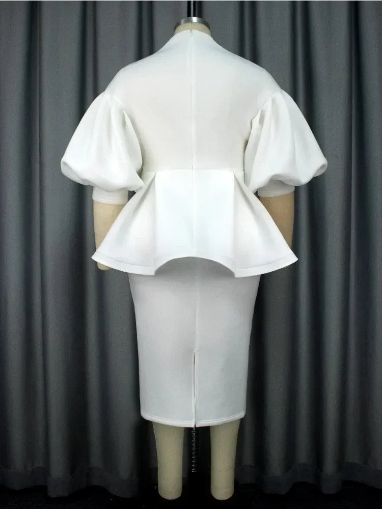 Amay Elegant Women White Dress Set 2 Piece Outfits Cute Peplum Ruffle Tops with Appliques Pencil Skirt Sets Office Work Wedding Guest