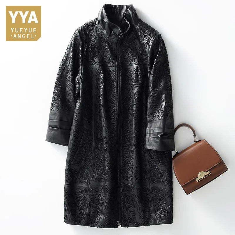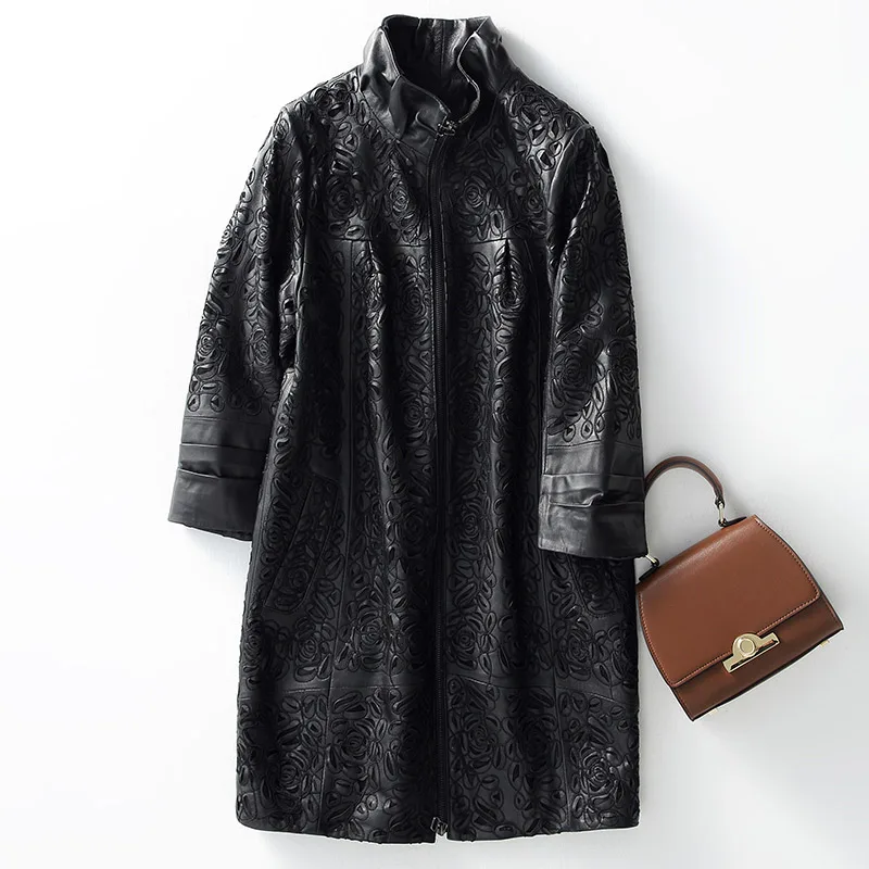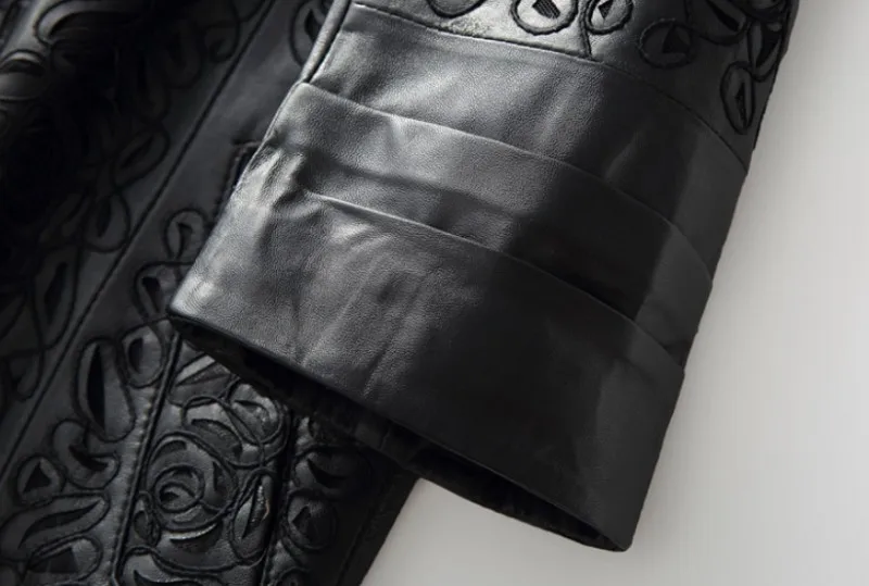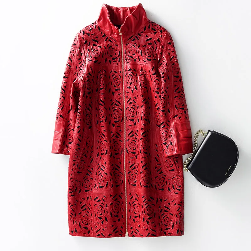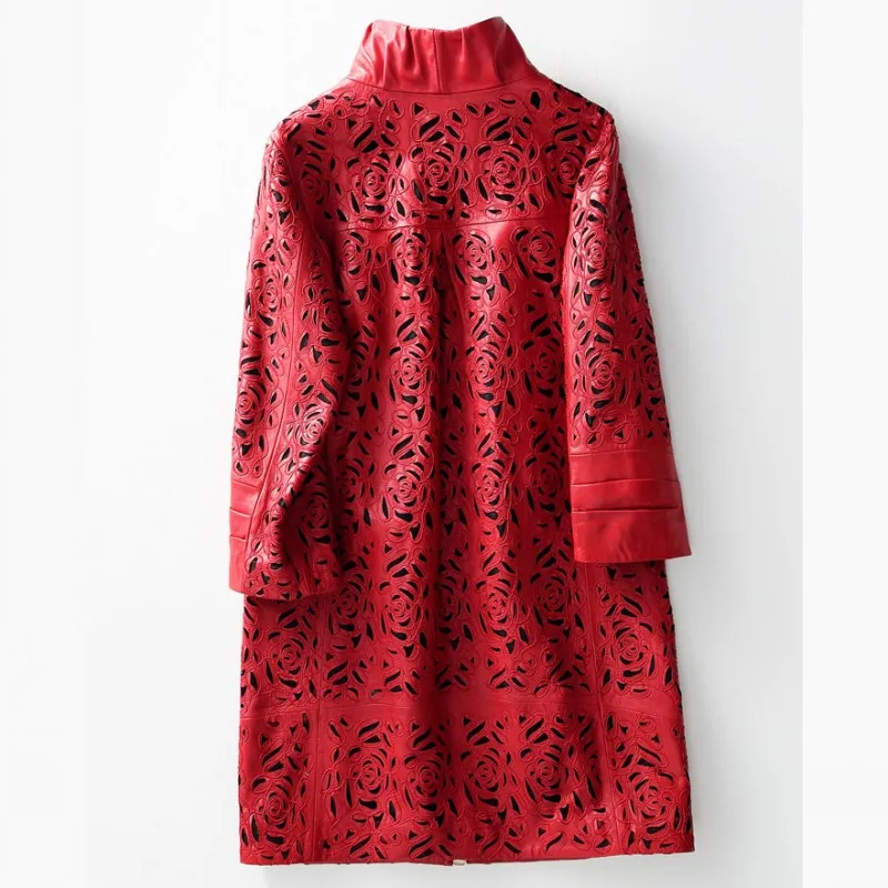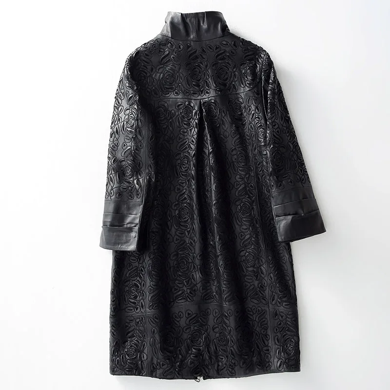 Amay Embroidery Hollow Out Sheepskin Windbreakers Female OL Style 100% Real Leather Medium Long Jacket Streetwear Stand Collar Coat