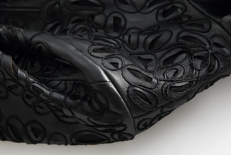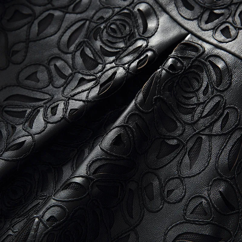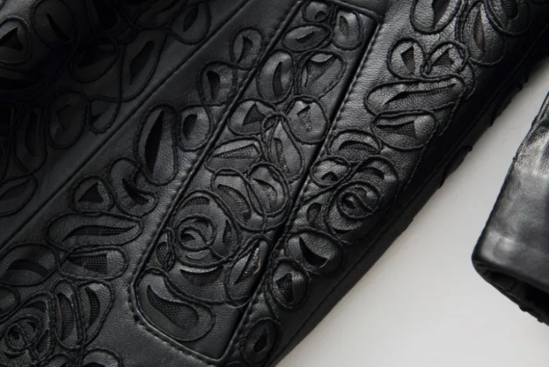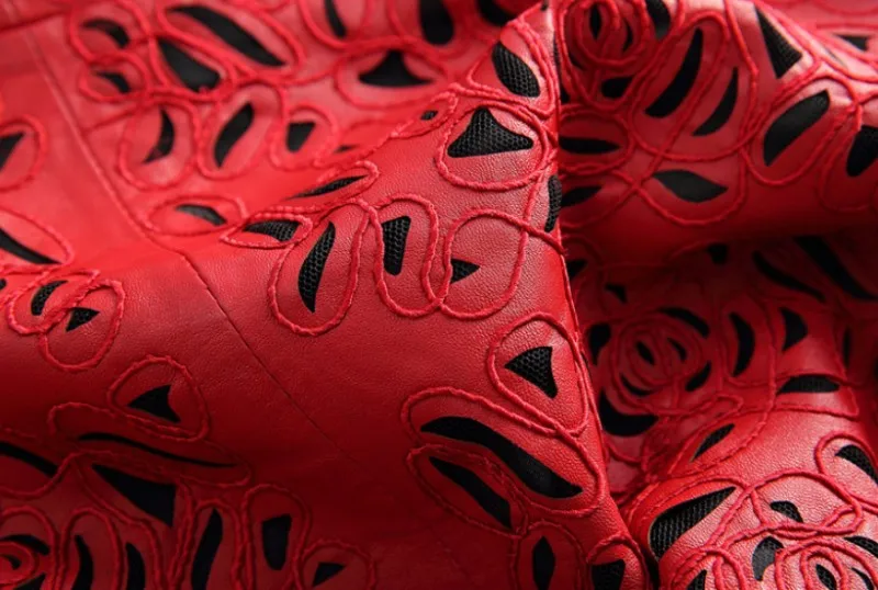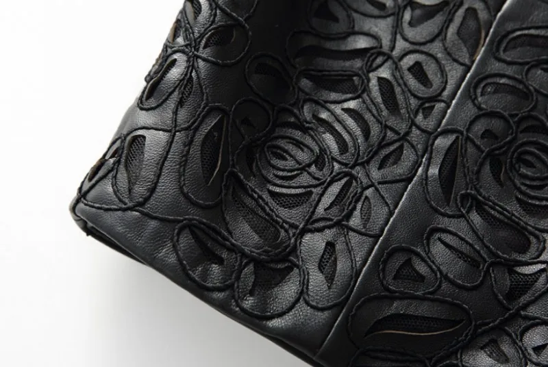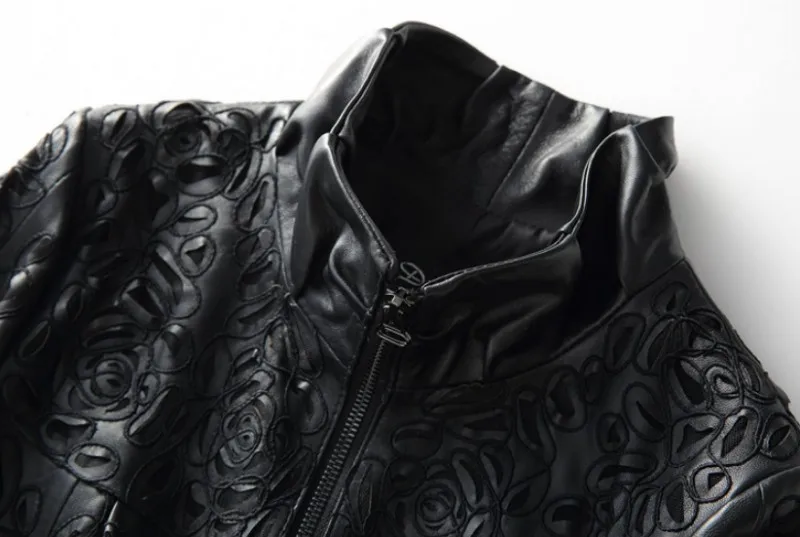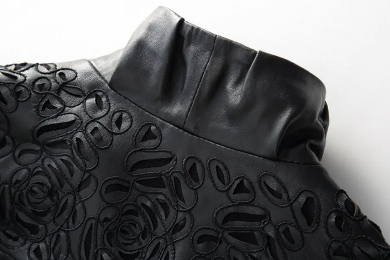 Amay Embroidery Hollow Out Sheepskin Windbreakers Female OL Style 100% Real Leather Medium Long Jacket Streetwear Stand Collar Coat