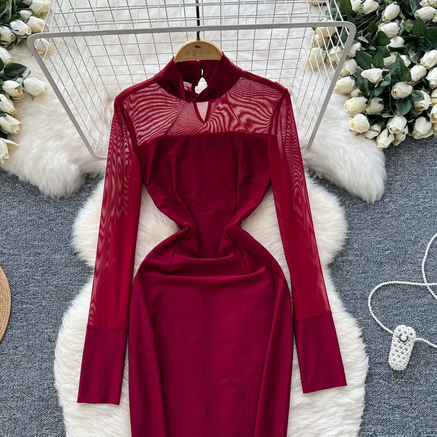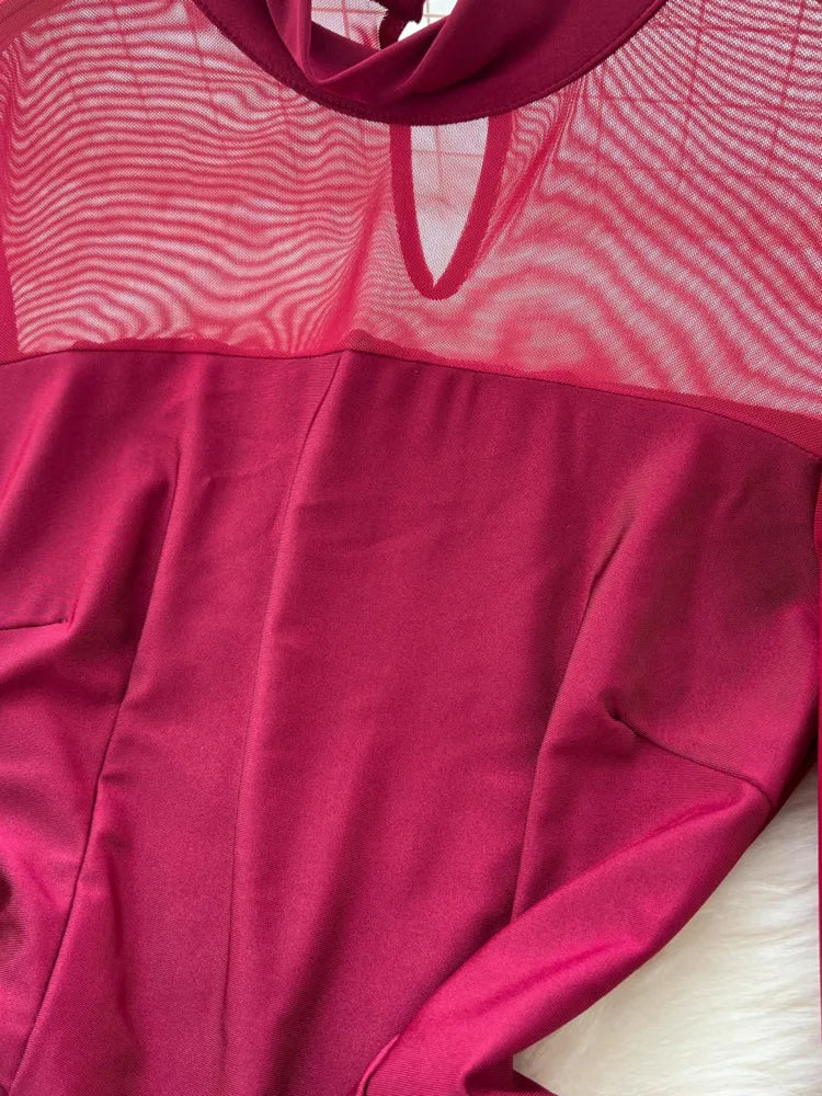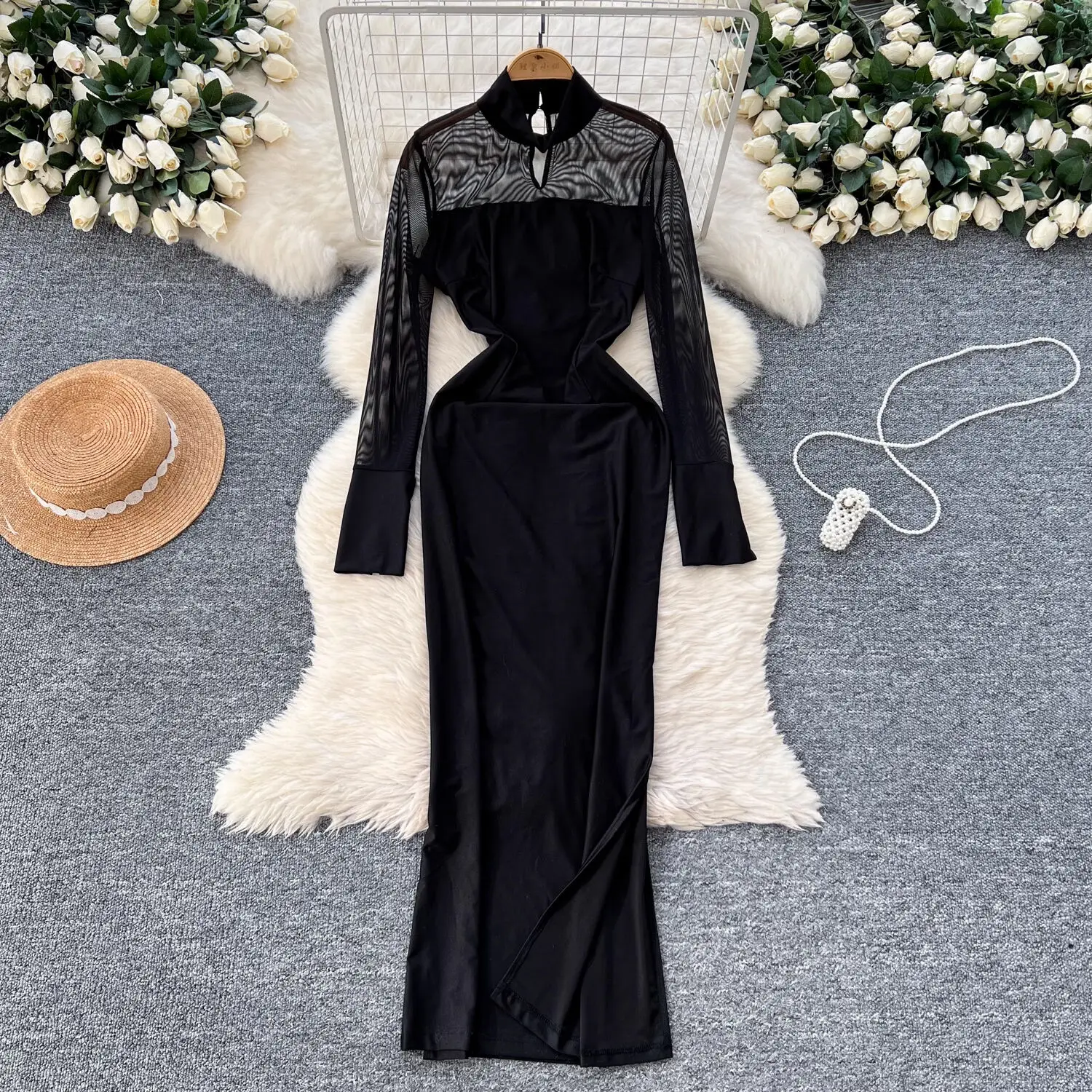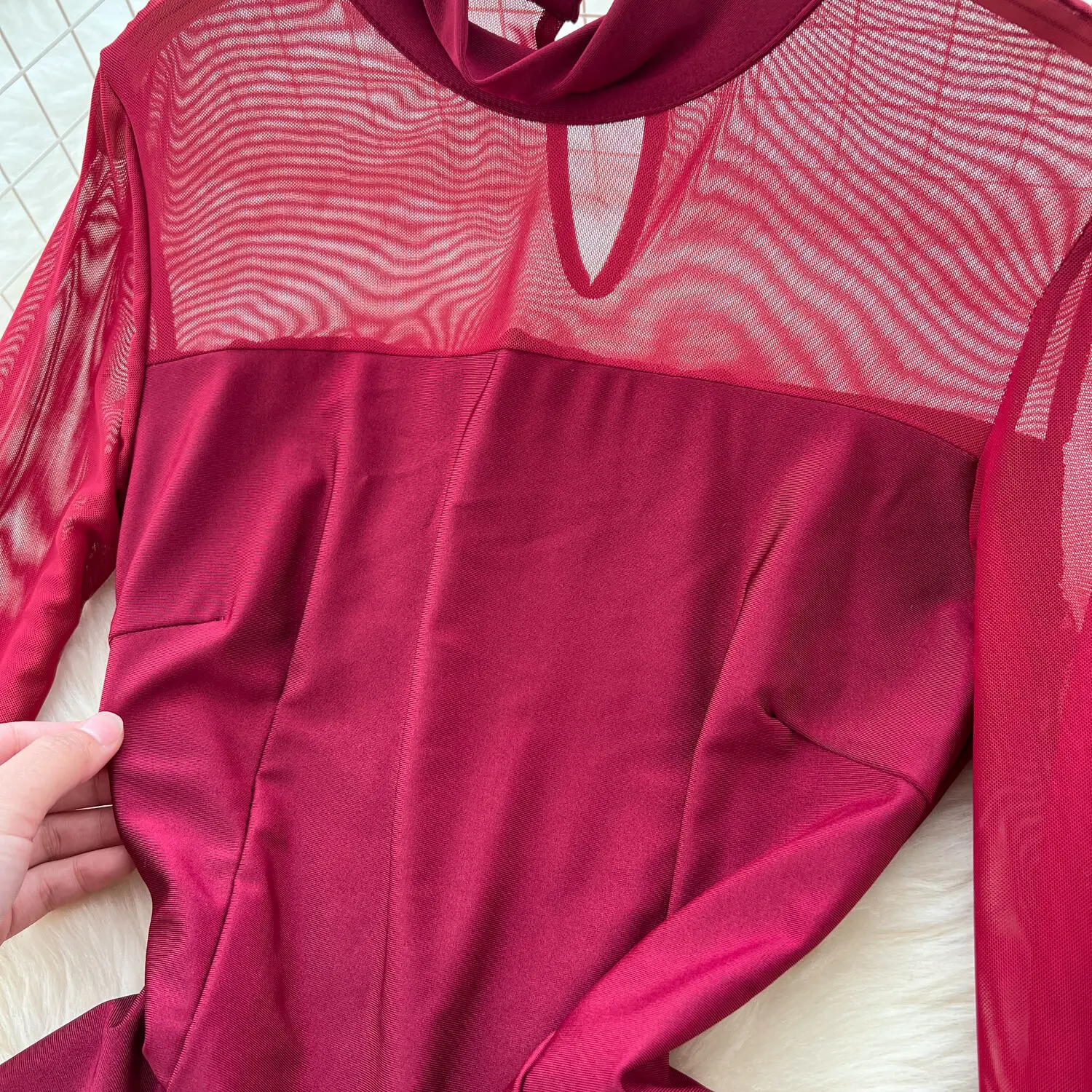 Amay Fashion Stand Collar Dress Women's Long Sleeves Hollow Out Gathered Waist Mesh Spliced Slim Dresses Autumn New 27X1903