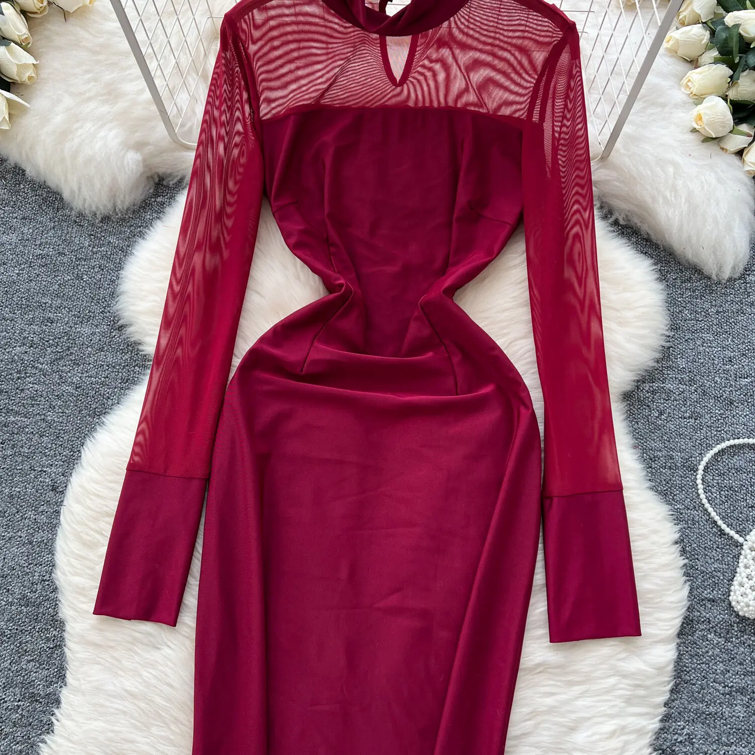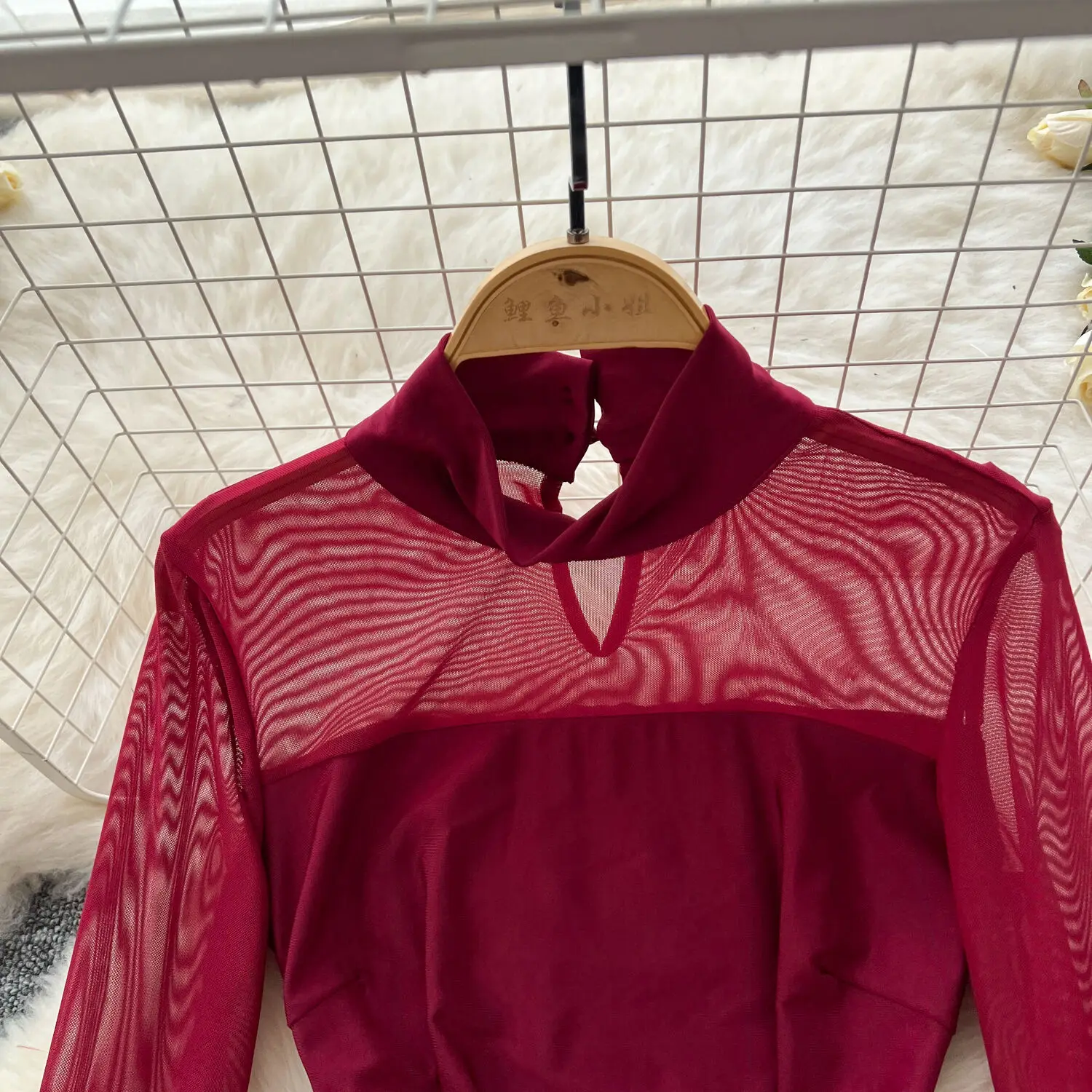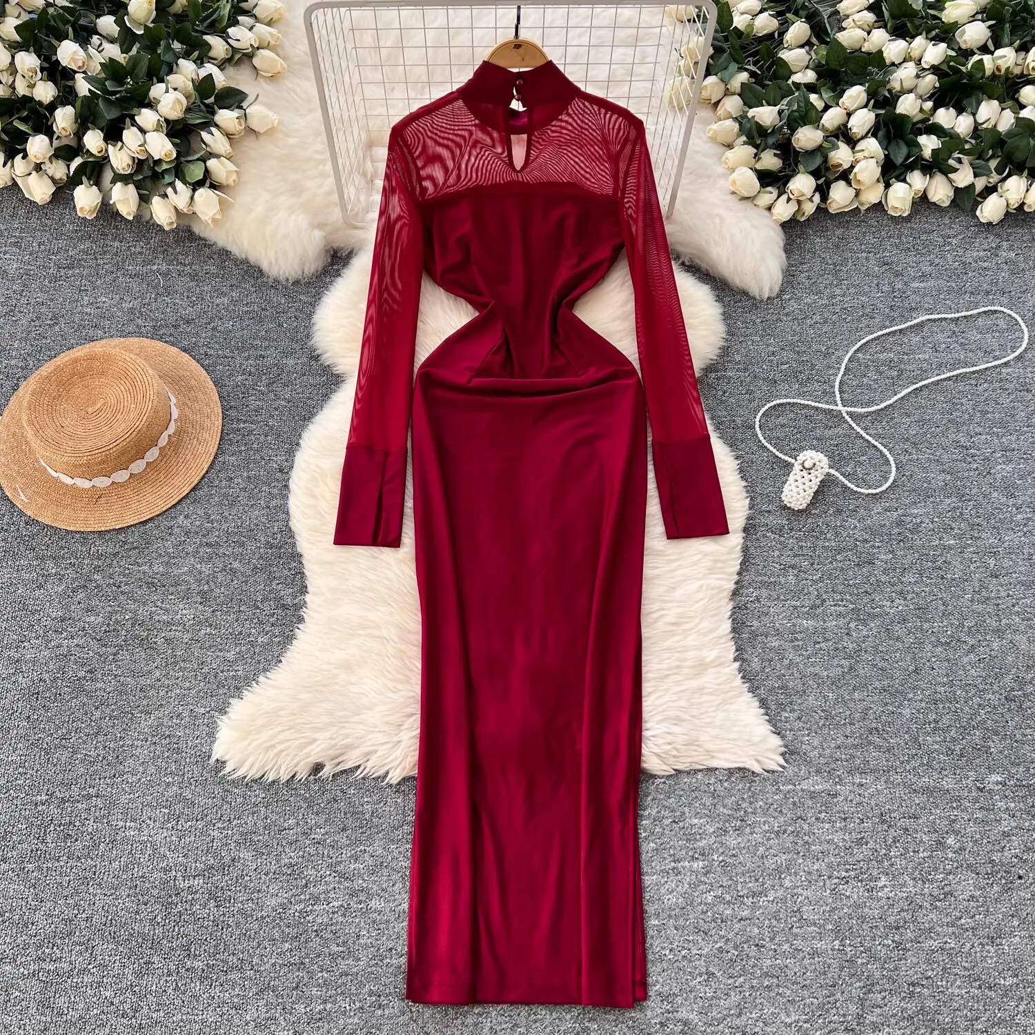Amay Fashion Stand Collar Dress Women's Long Sleeves Hollow Out Gathered Waist Mesh Spliced Slim Dresses Autumn New 27X1903