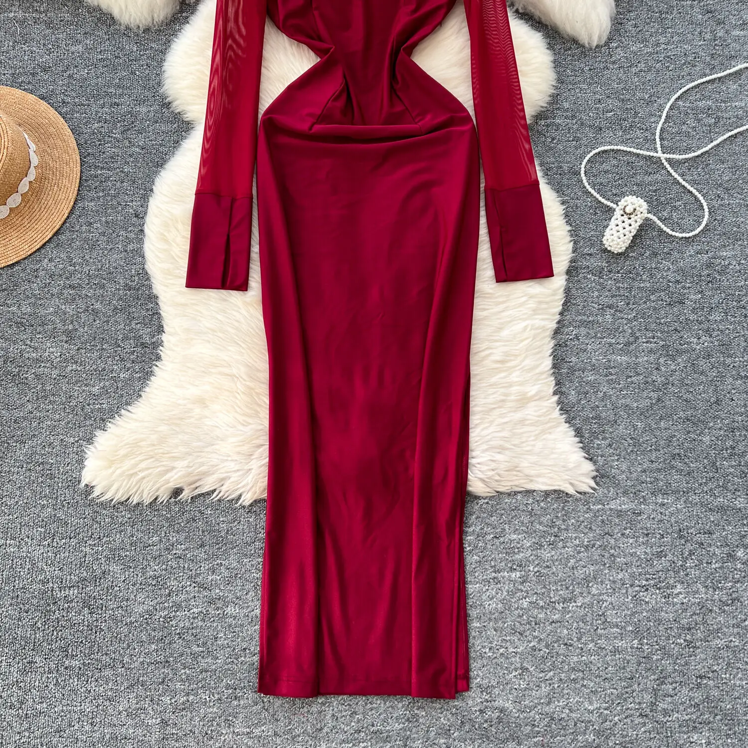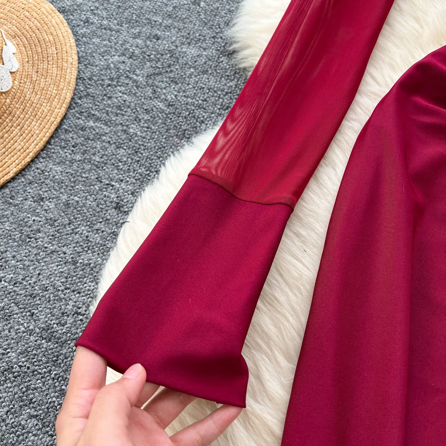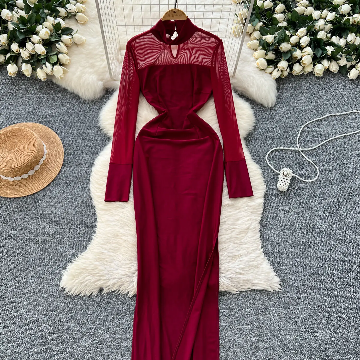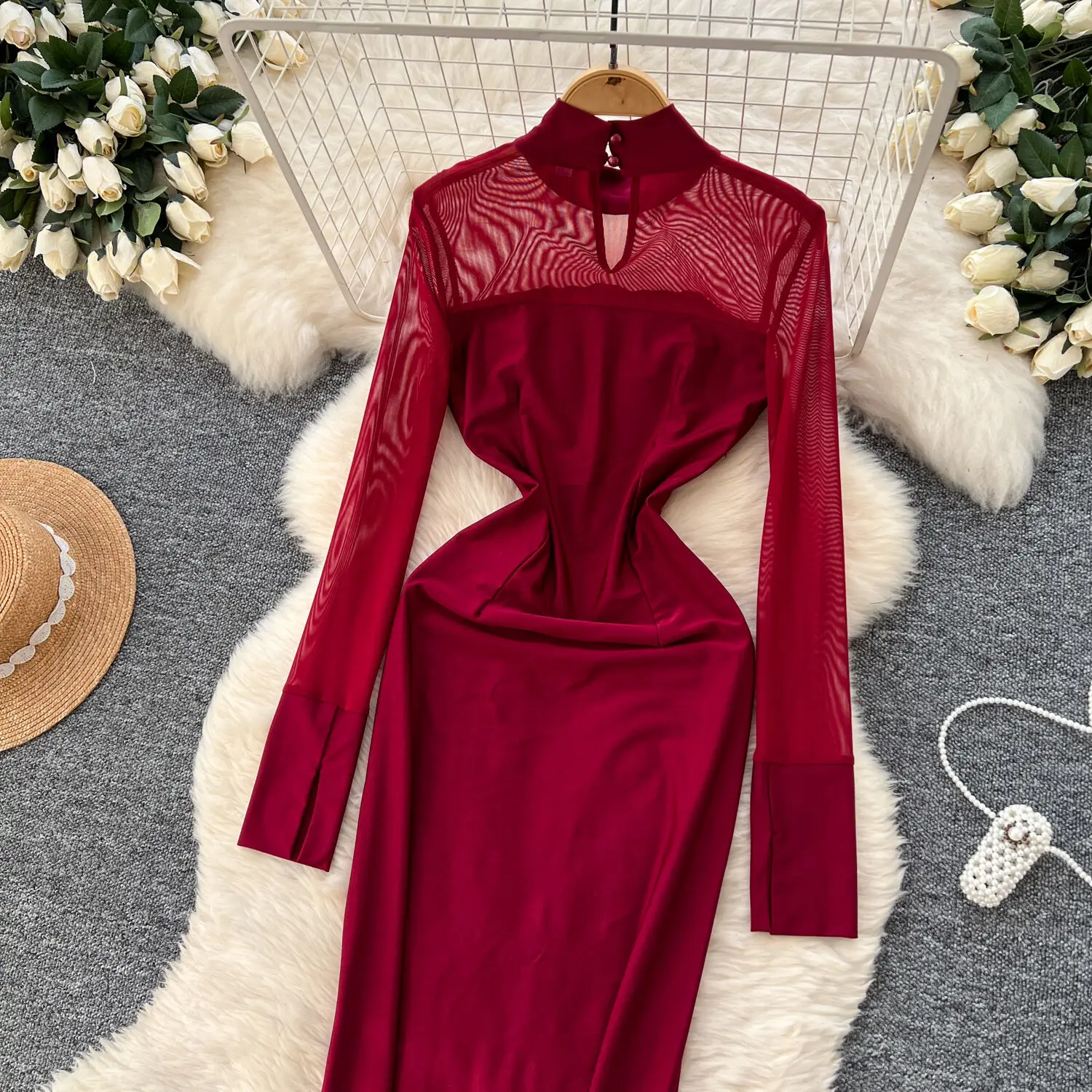 Amay Fashion Stand Collar Dress Women's Long Sleeves Hollow Out Gathered Waist Mesh Spliced Slim Dresses Autumn New 27X1903