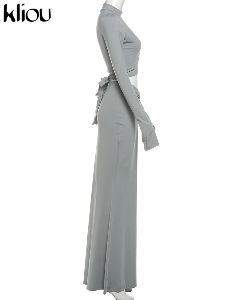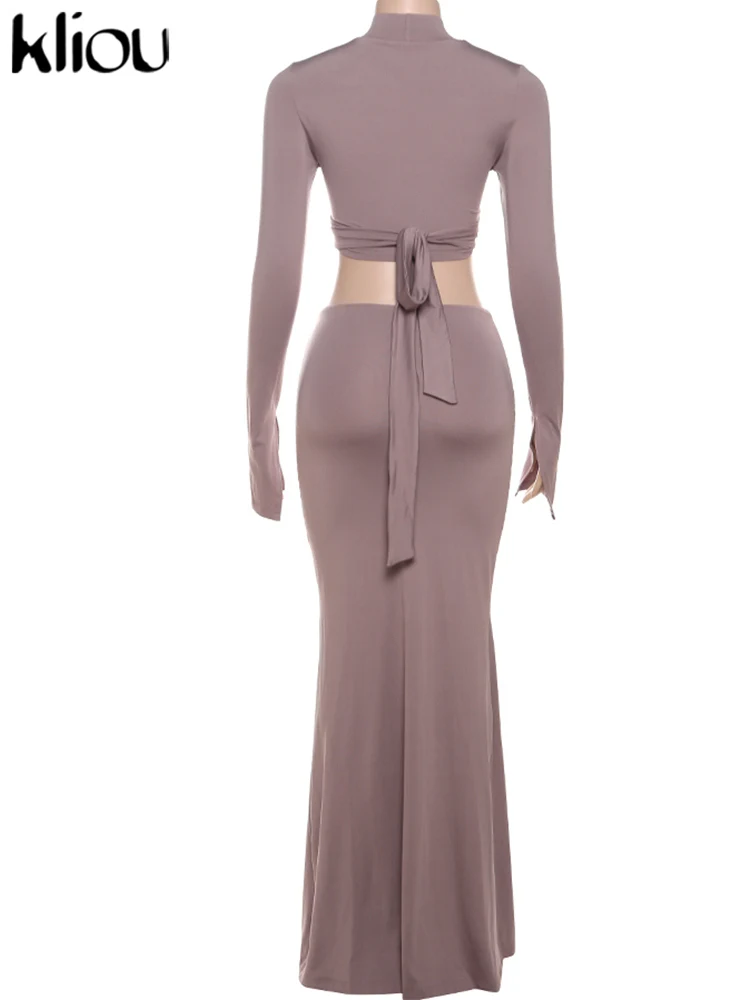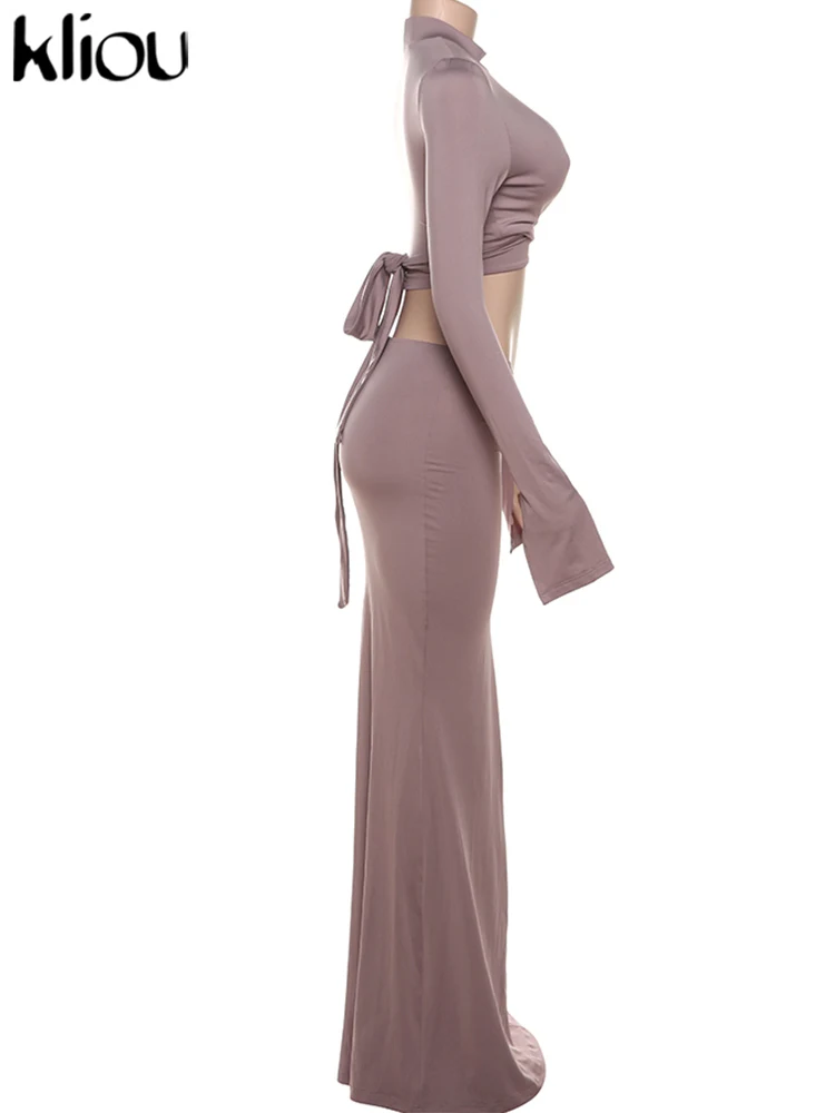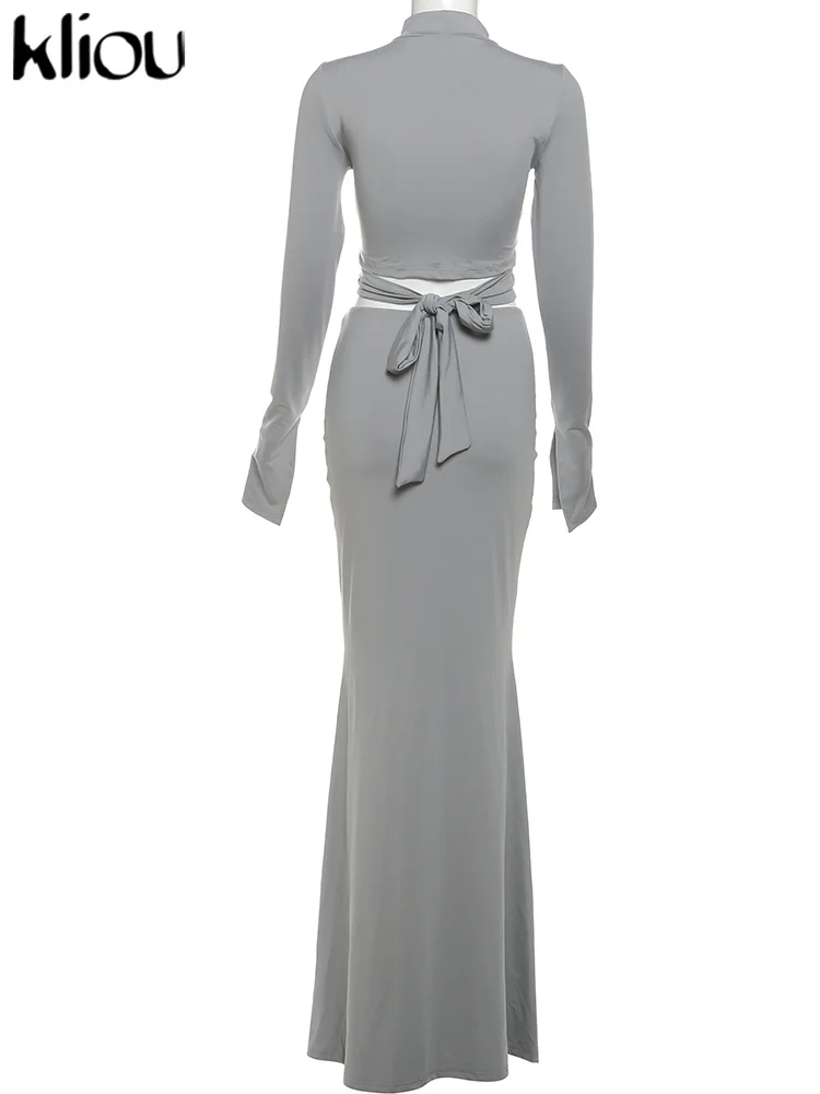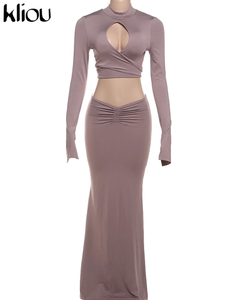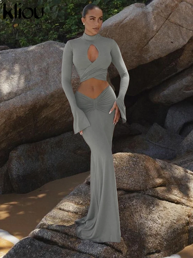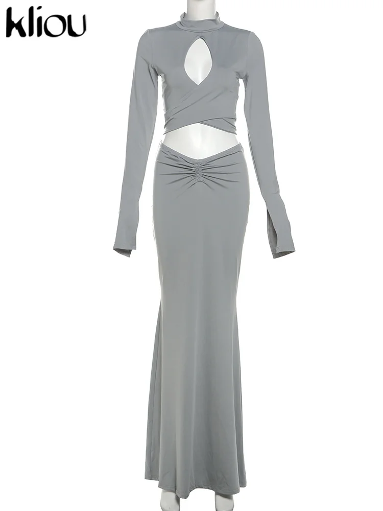 Amay Elegant Women 2 Piece Set Fall Hollow Bandage Stand Collar Tops +Shirring Maxy Skirts Female Matching High Street Outfits