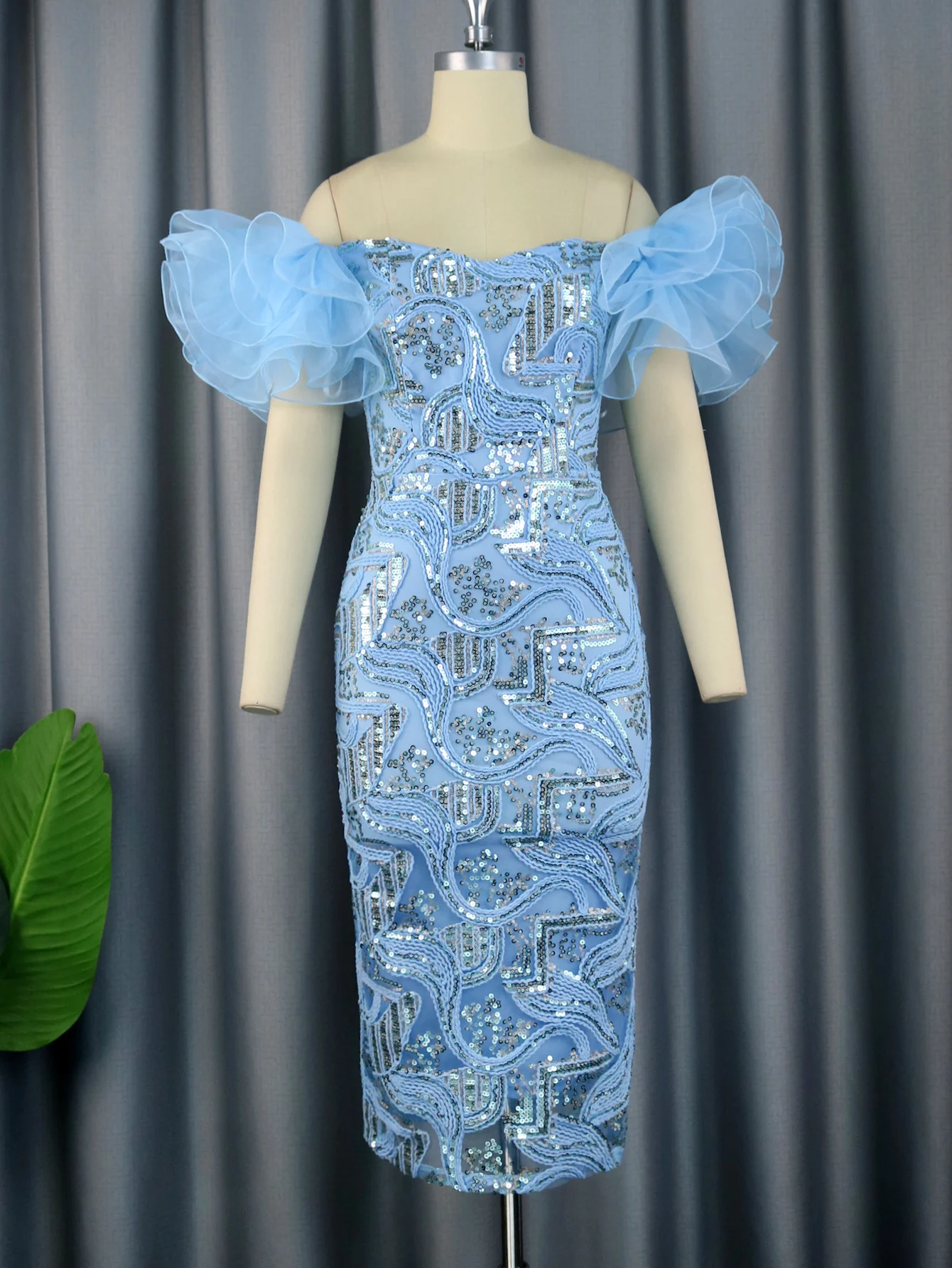 Amay Luxury Sequin Dresses Plus Size Backless Flower Sleeve Embroidery Midi Bodycon Party Prom Off Shoulder Fitted Glitter Robes