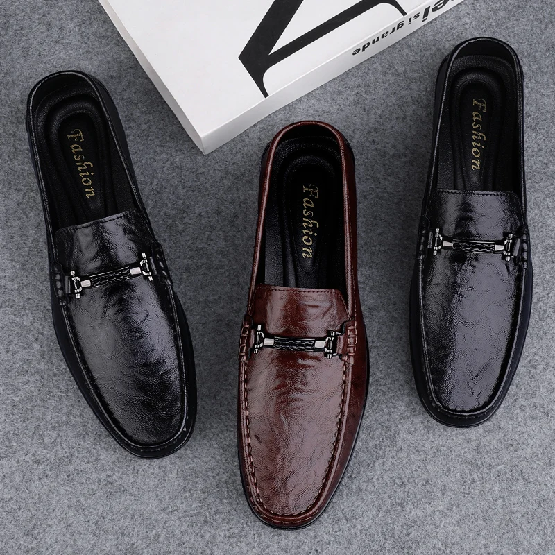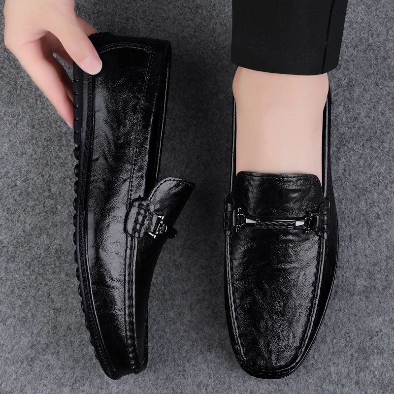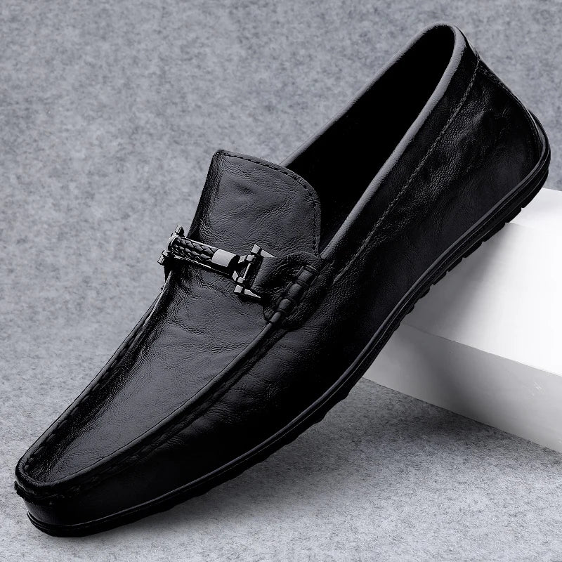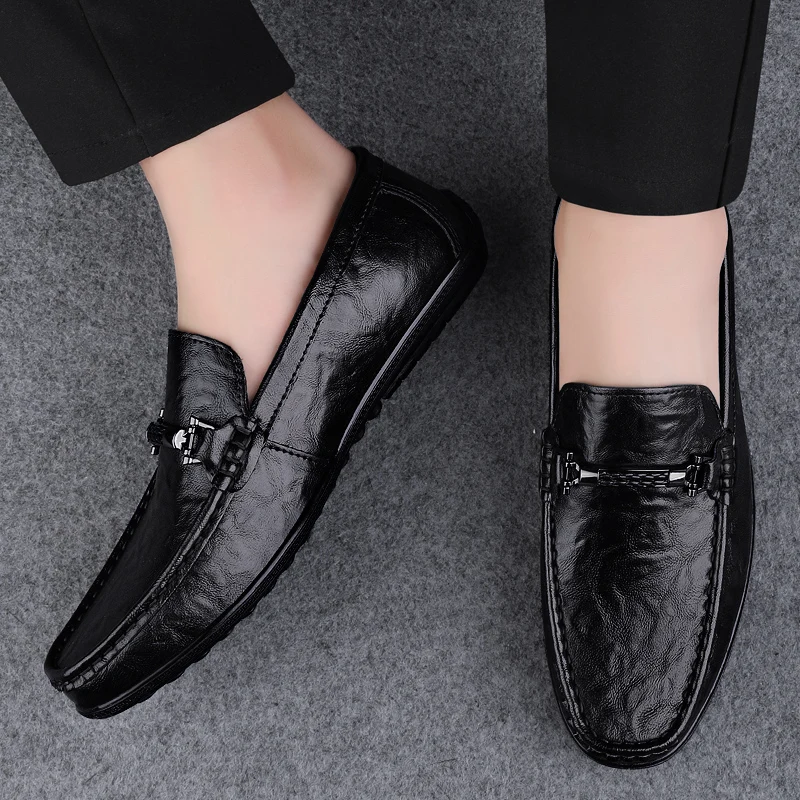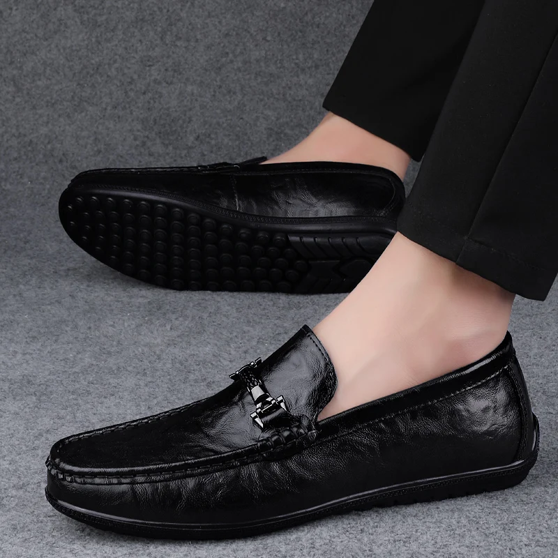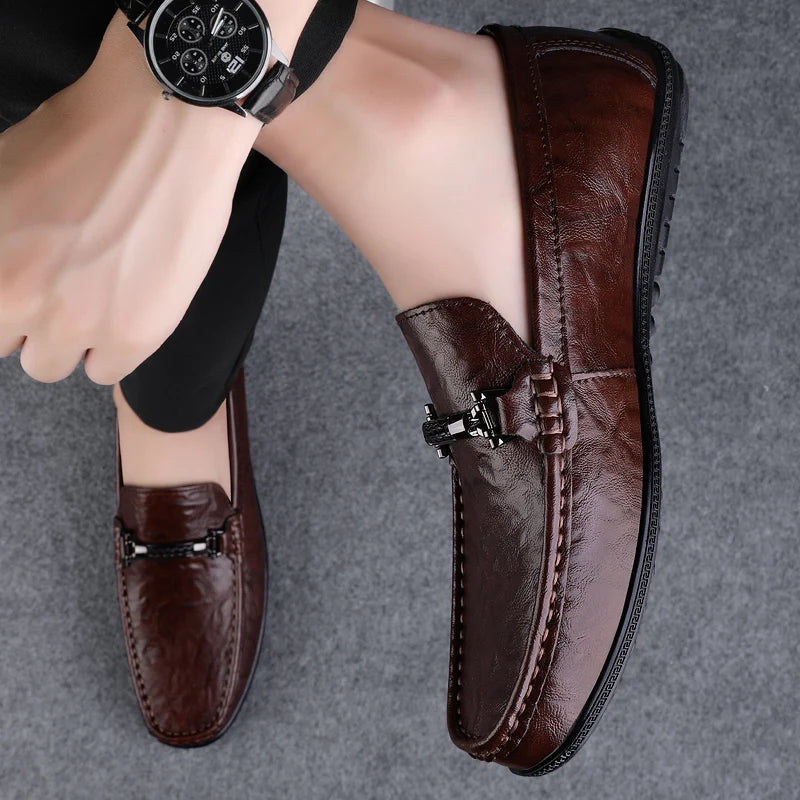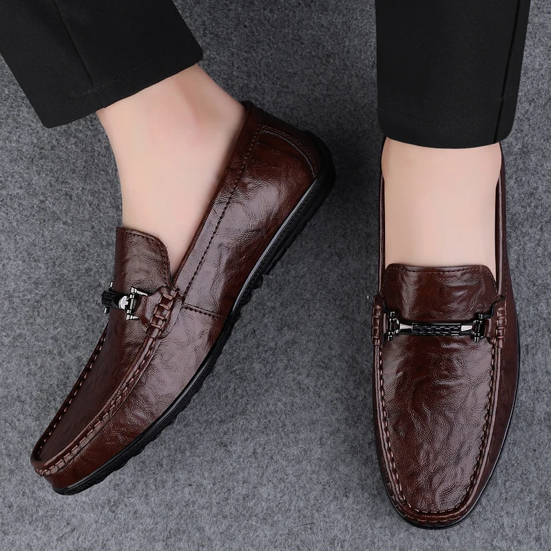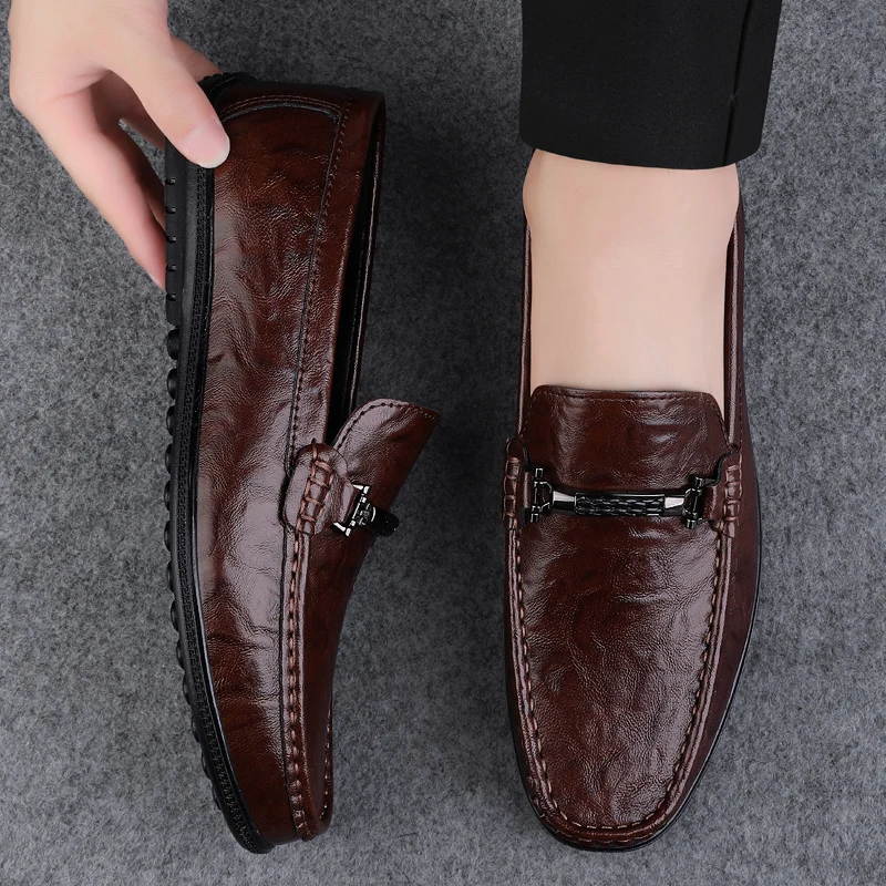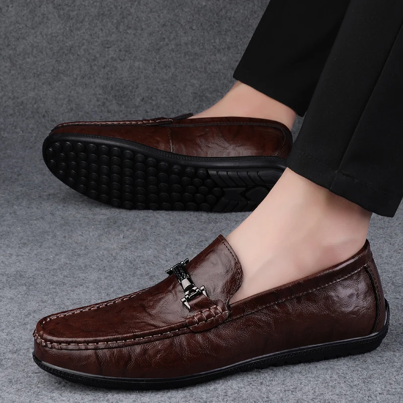 Amay Metal Buckle Brown Loafers Genuine Leather Mens Business Formal Shoes Comfortable Casual Shoes Driving Footwear Breathable Mens