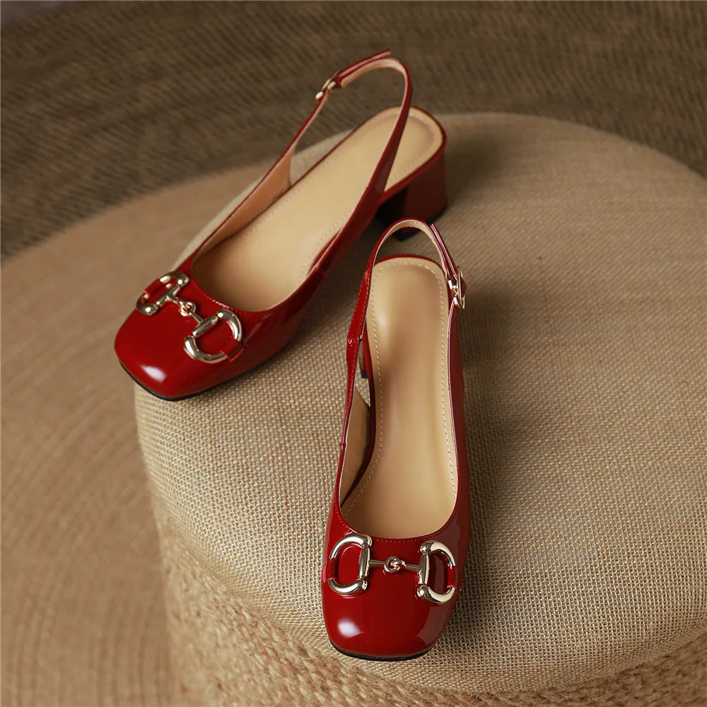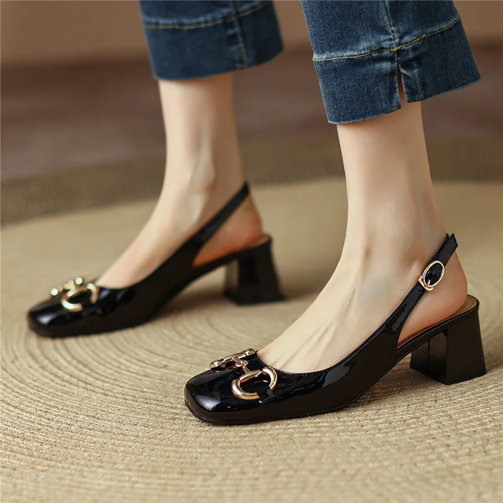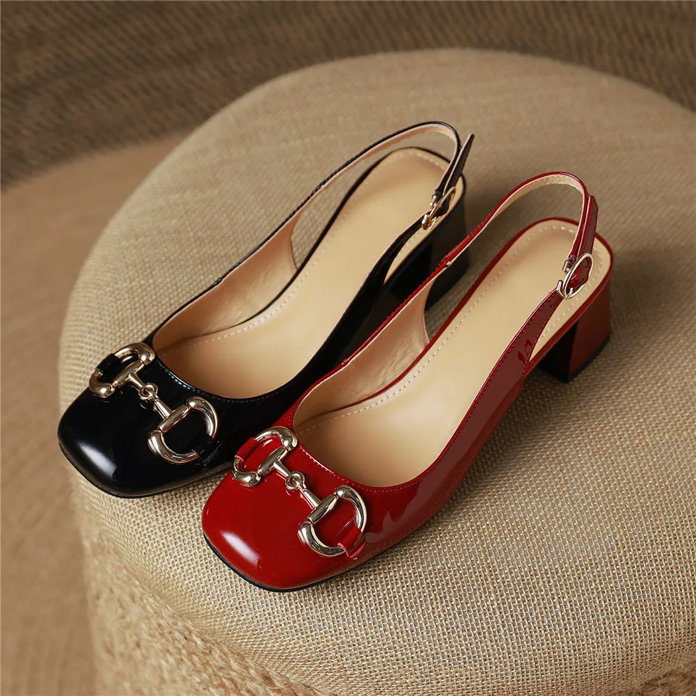 Amay new Women Classic Metal Buckle Women Patent Leather Pumps Round Toe Thick Heels Slip On Plus Size 34-43 Spring Autumn Shoes