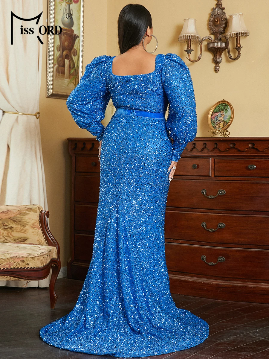 Amay Blue Sequin Plus Size Evening Dresses Elegant Women Lantern Sleeves Belt Bodycon Maxy Mermaid Party Dress Long Prom Gown