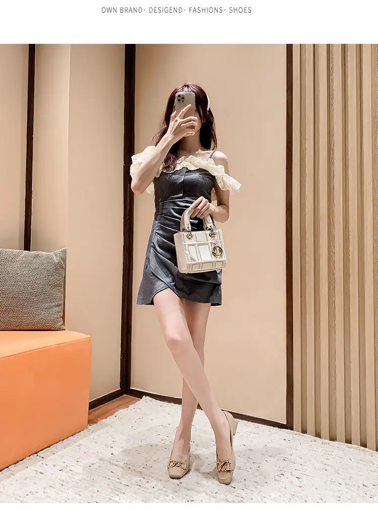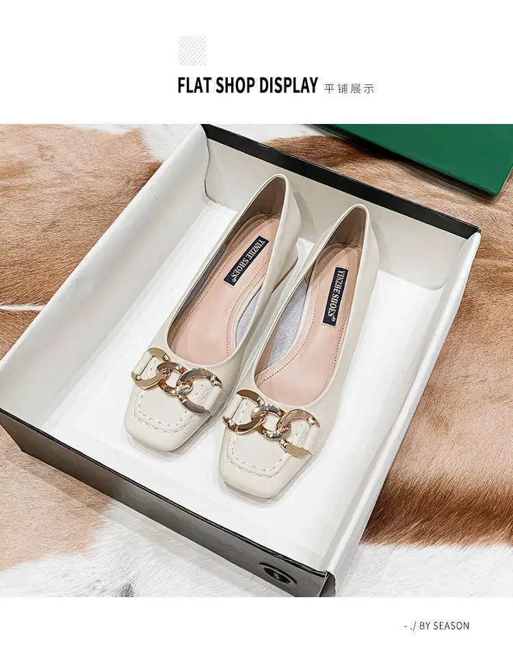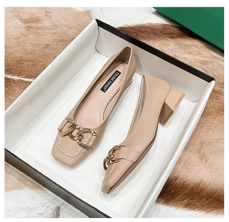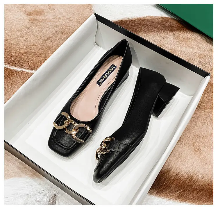 Amay New Women Med Heel Square Toe Pumps Office Lady Shoes Big Gold Metal Chain Soft Soles Slip on Leahter Shoes