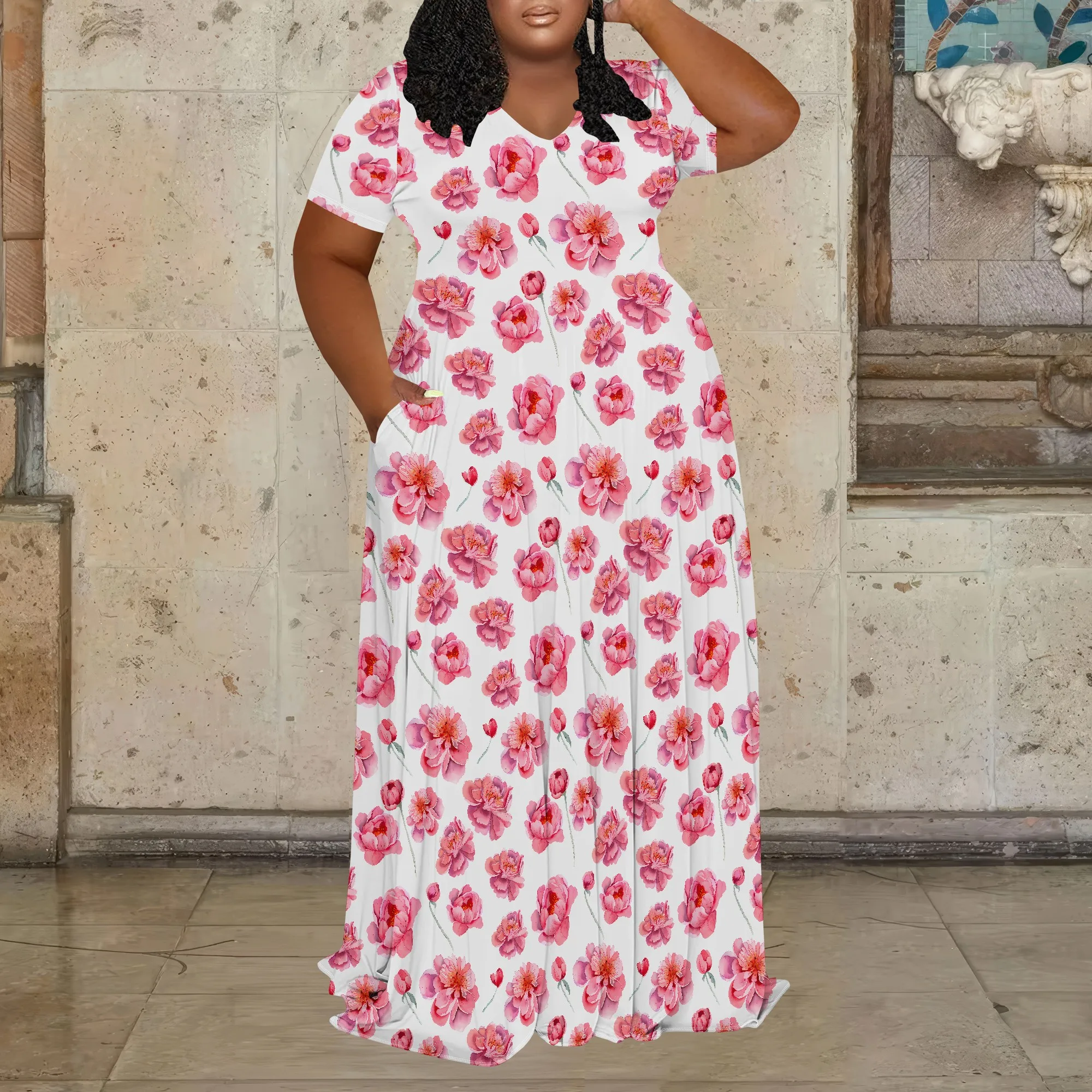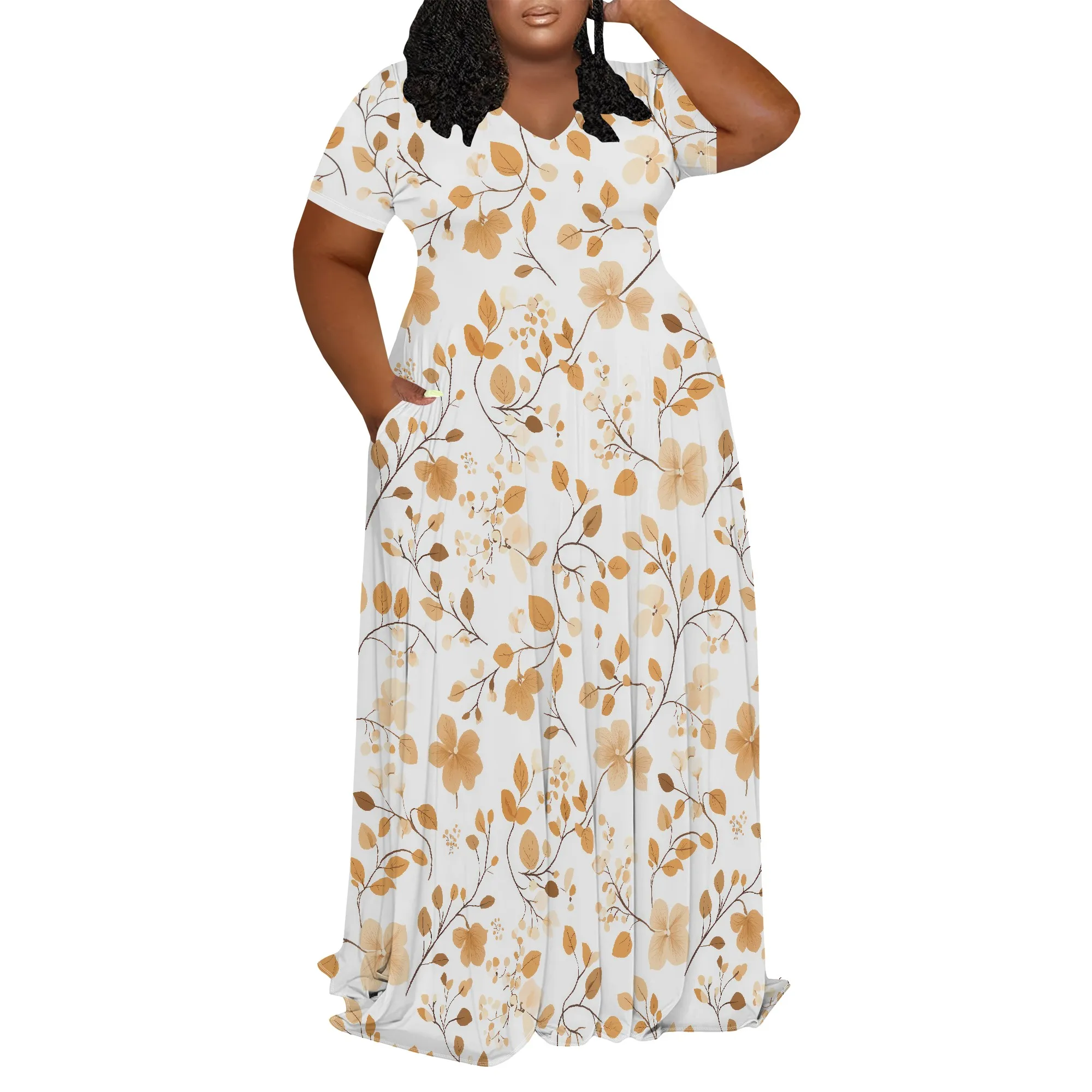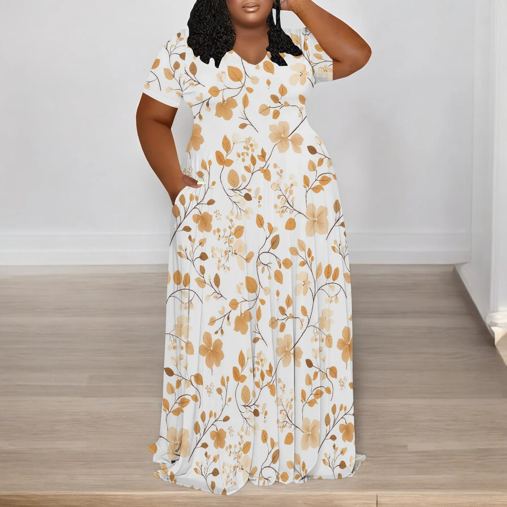 Amay Plus Size Dress for Women Casual V Neck Short Sleeve Empire Waist Maxy Dress Loose Oversize Flowy Long Dress with Pockets