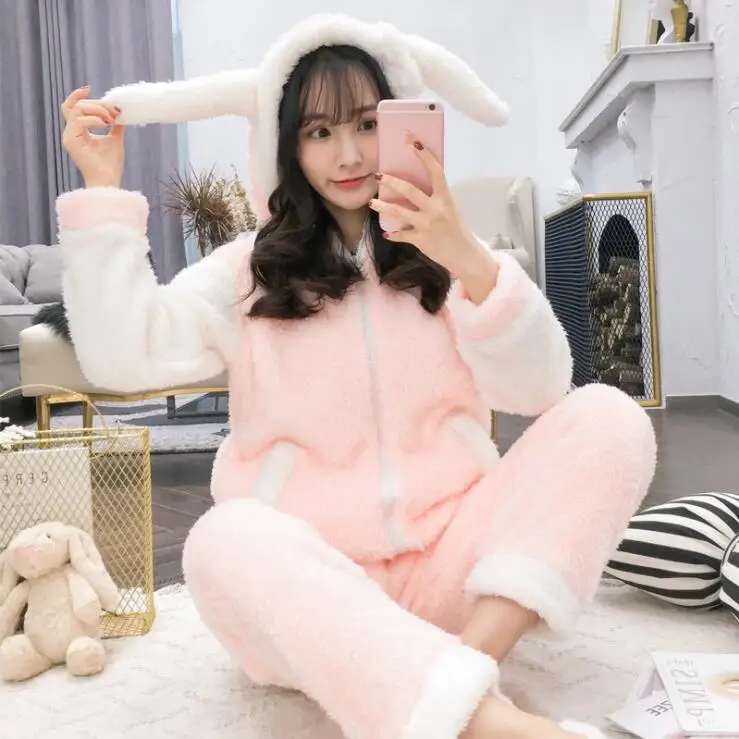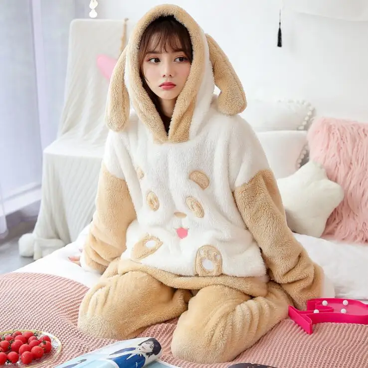 Winter Thick Warm Flannel Pajamas Sets For Women Sleepwear Pajama Homewear Pyjamas Set Cartoon Cute Warm Hooded Rabbit Gowns