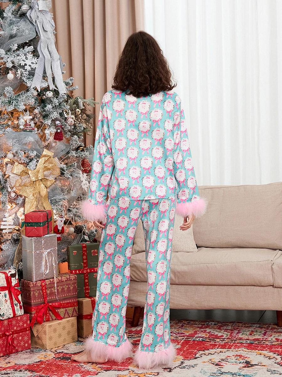 Santa Claus/bow print, plush cuffs, bright colors, casual style; Women's shirts with long sleeves, front buttons and lapels; Women's pants with elastic waist design; Fashionable streetwear, perfect for showing your curves