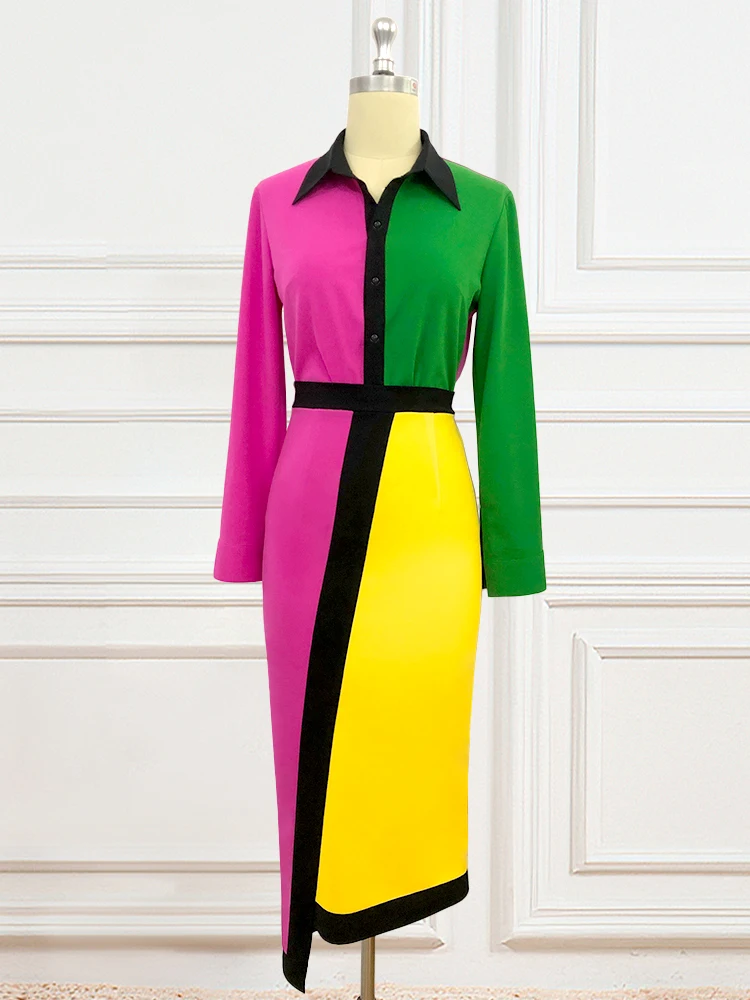 Women Dress Patchwork Turn Down Collar Long Sleeves Elegant Slim Autumn Fashion Office Ladies Classy New Contrast Color Gown New