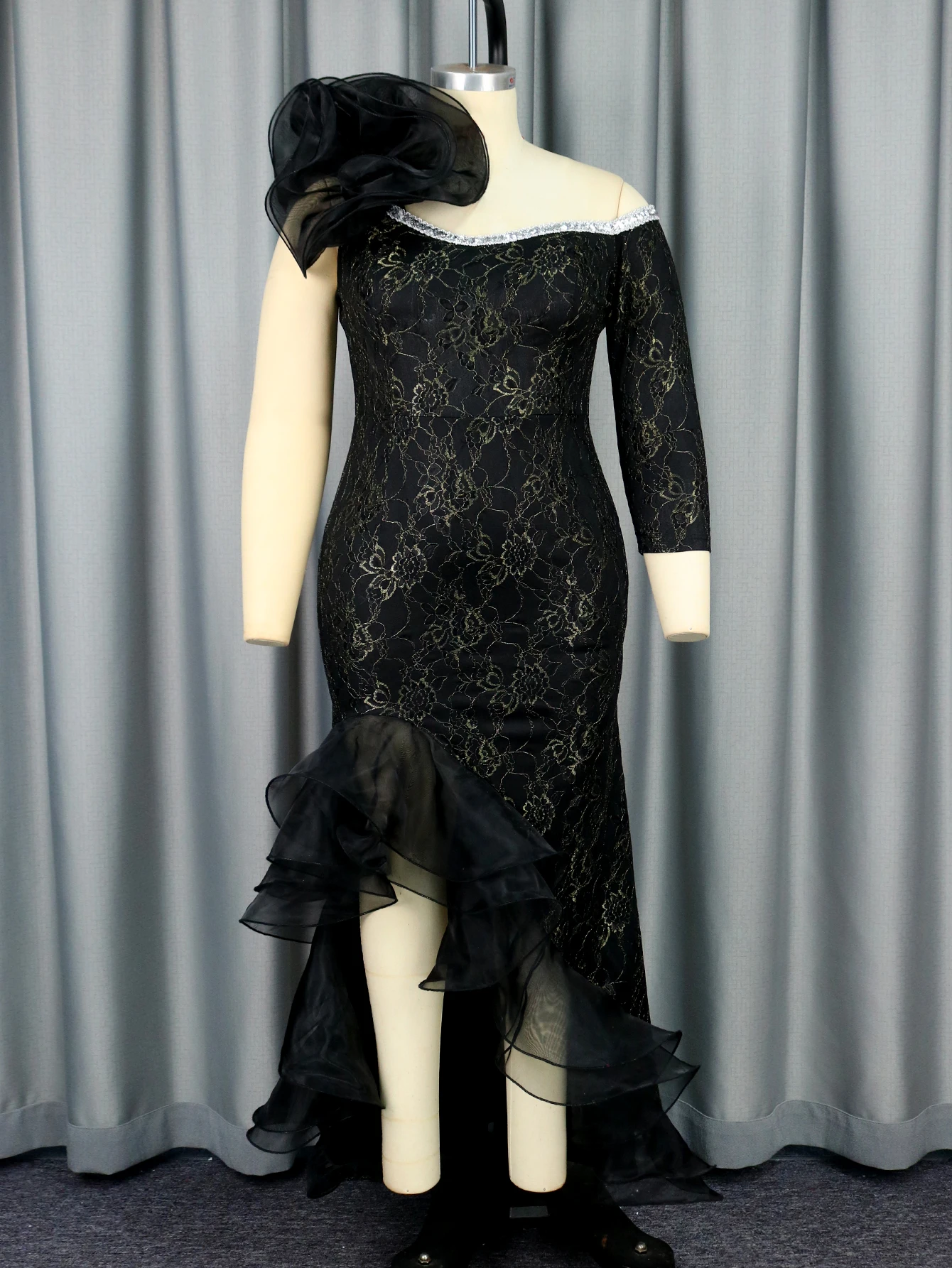Women Formal Party Dresses Curvy Off Shoulder One Sleeve Tiered Ruffle Slit Long Lace Dress Plus Size Elegant Prom Evening Gown
