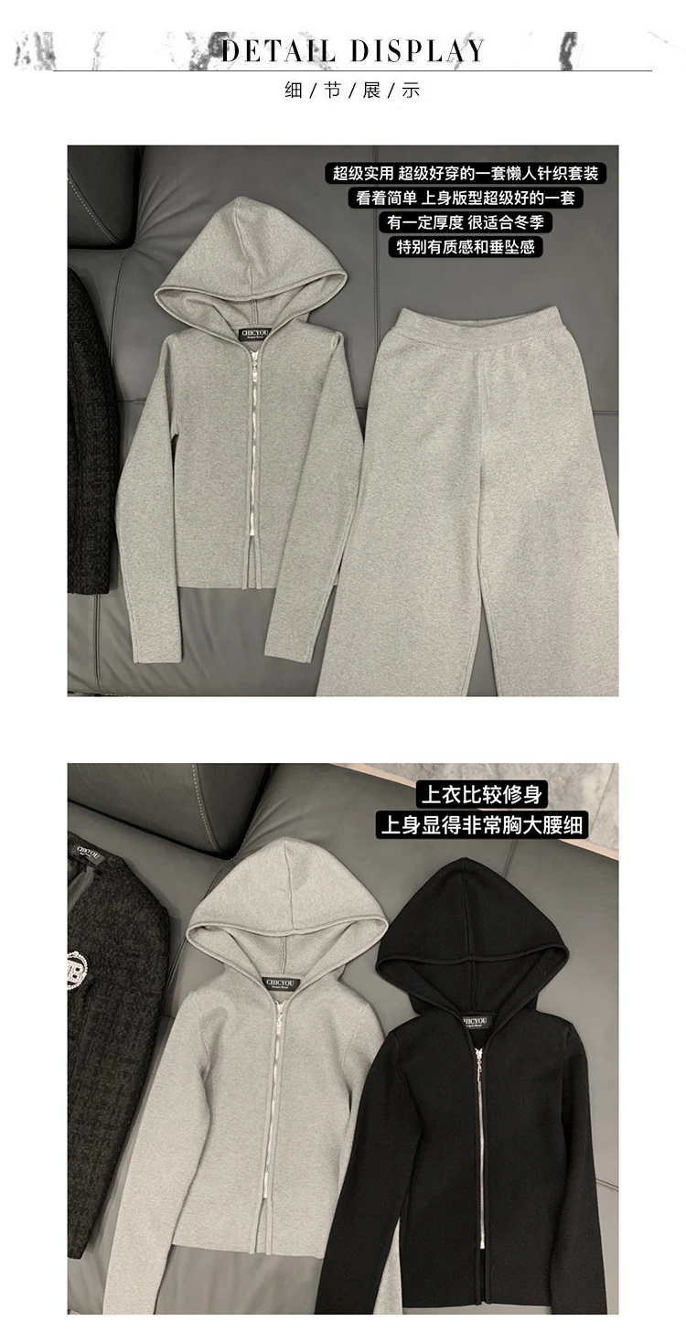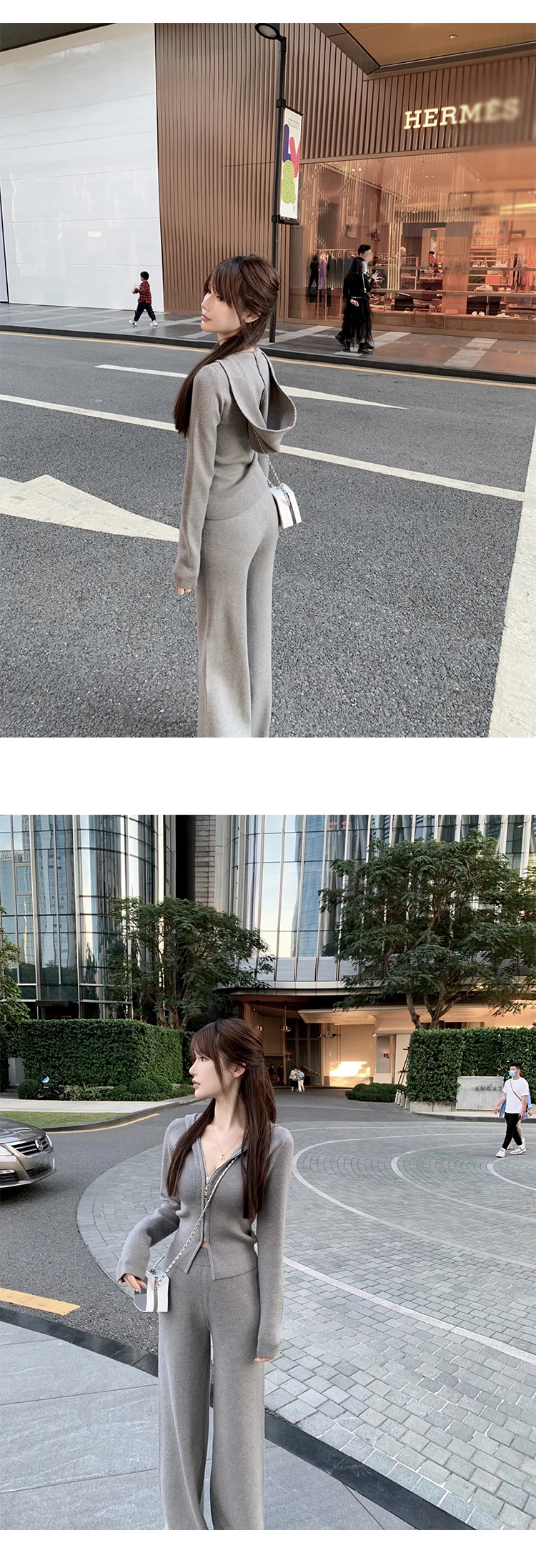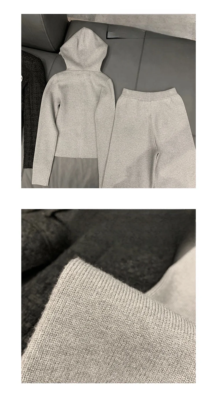 Women Knitted Tracksuits Autumn Winter Hooded Long Sleeve Short Jacket High Waist Wide Leg Pants Two Piece Set Fashion Outfits