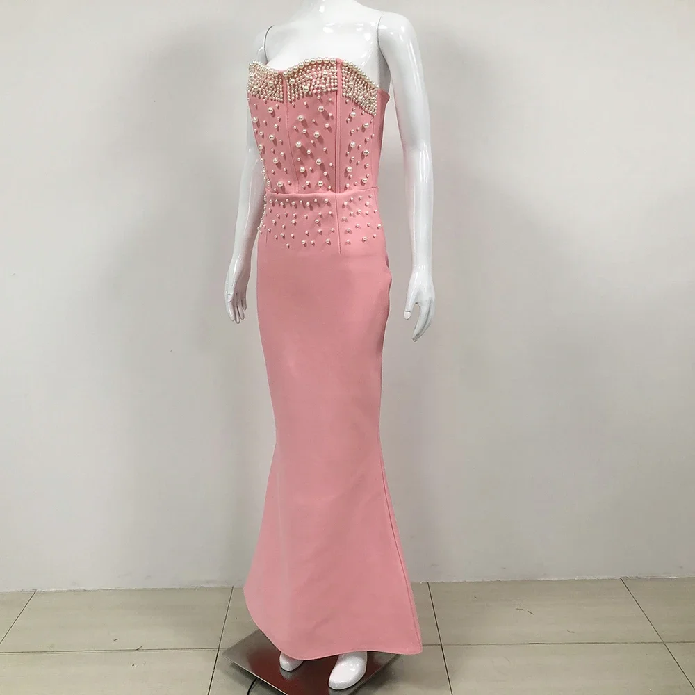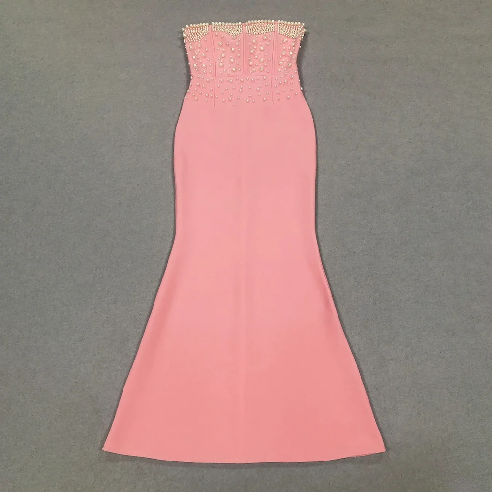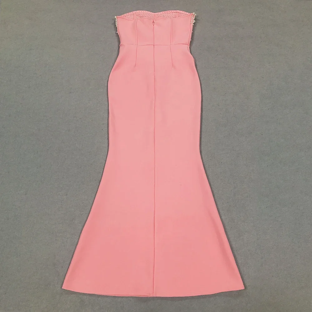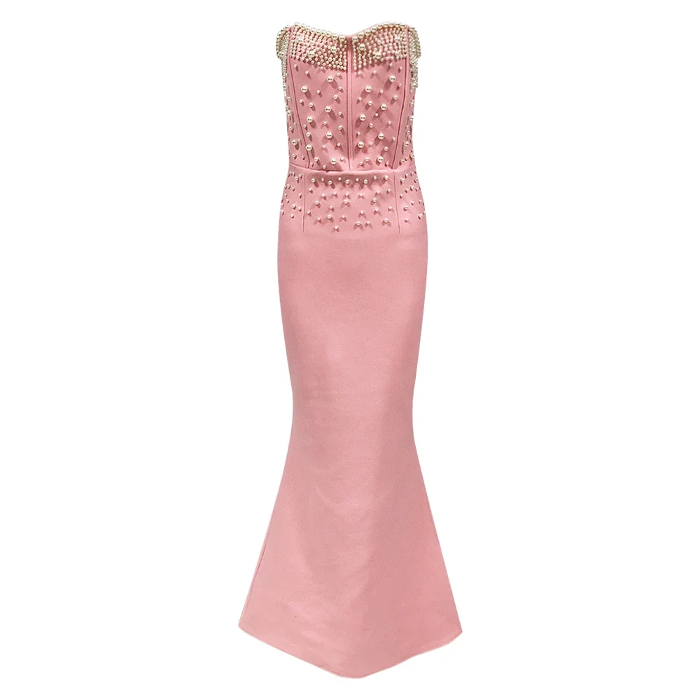 Women Pink Party Macy Mermaid Dress Elegant Strapless Pearl Beading Long Celebrity Evening Gowns Ladies High Fashion Gala Dress