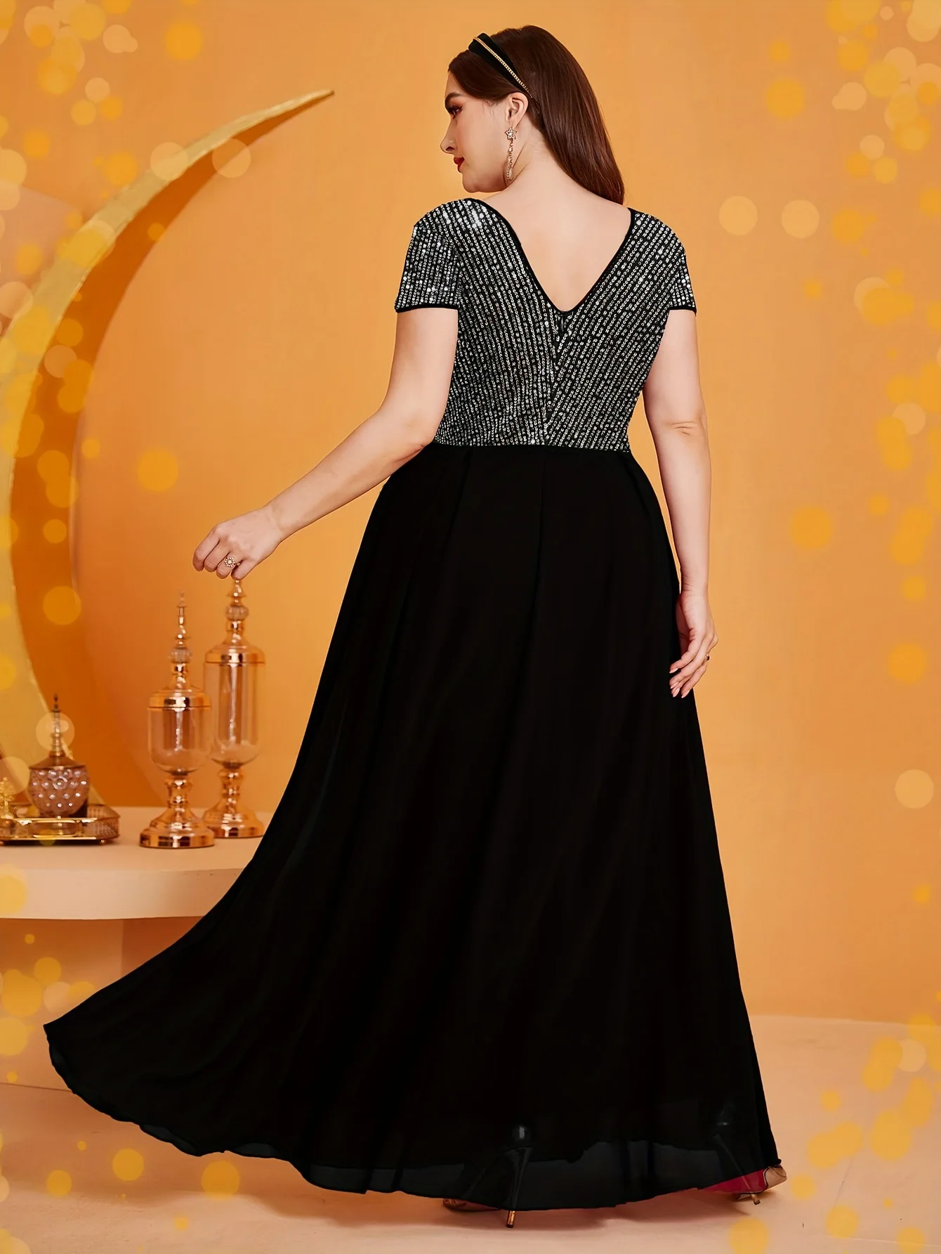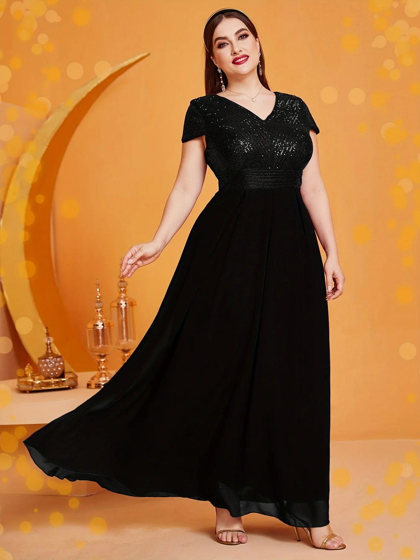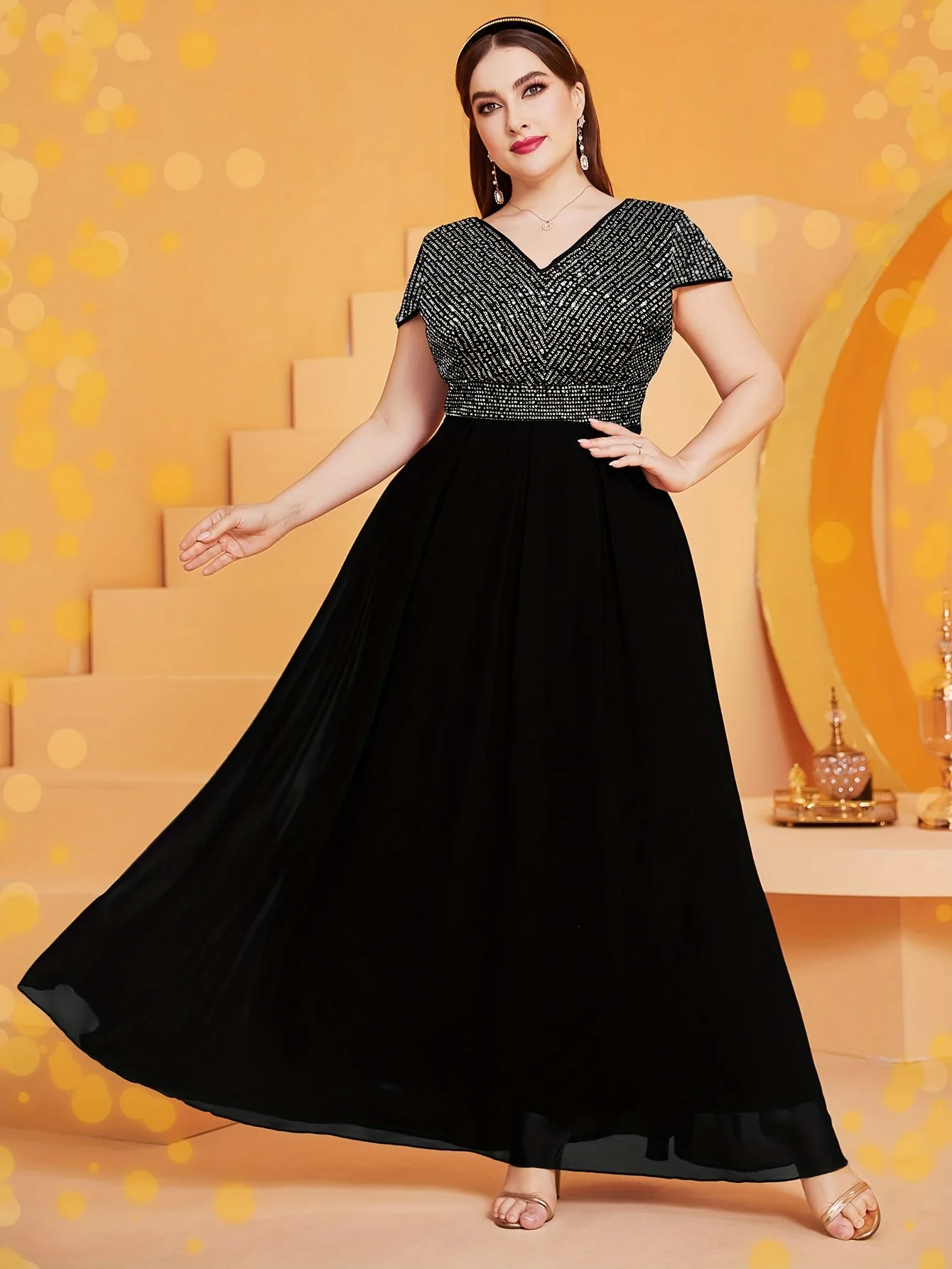 Women Plus Size Party Dresses 2024 New Fashion V-neck Short-sleeved Sequin Dress Fashion Temperament Elegant Evening Dresses