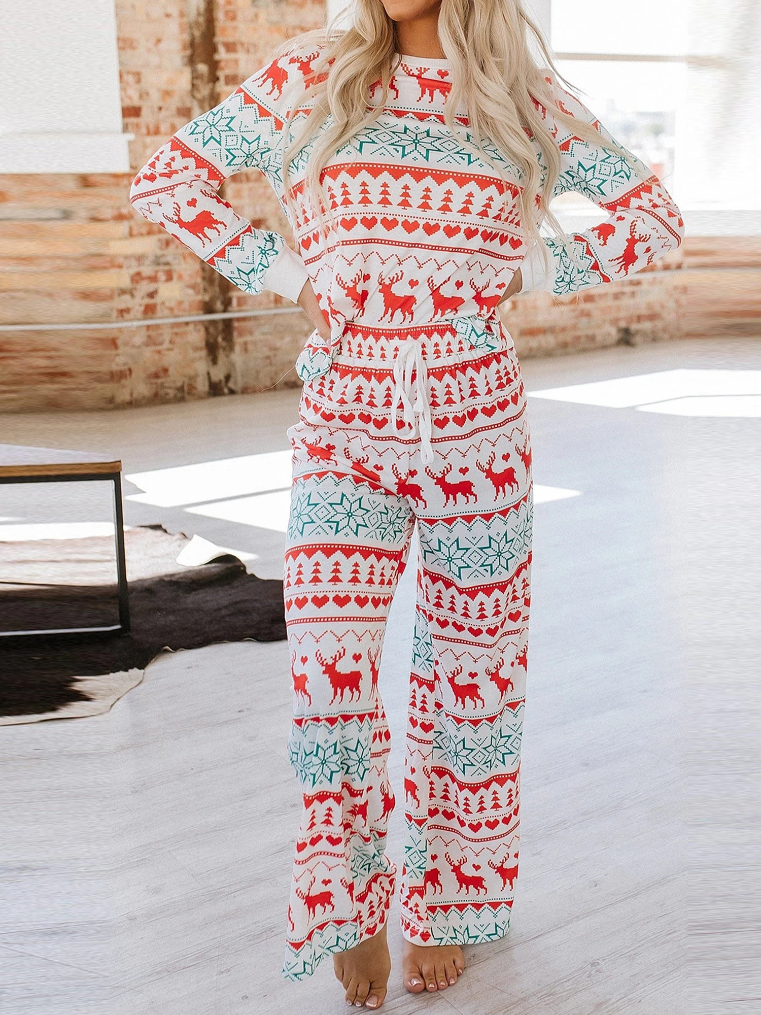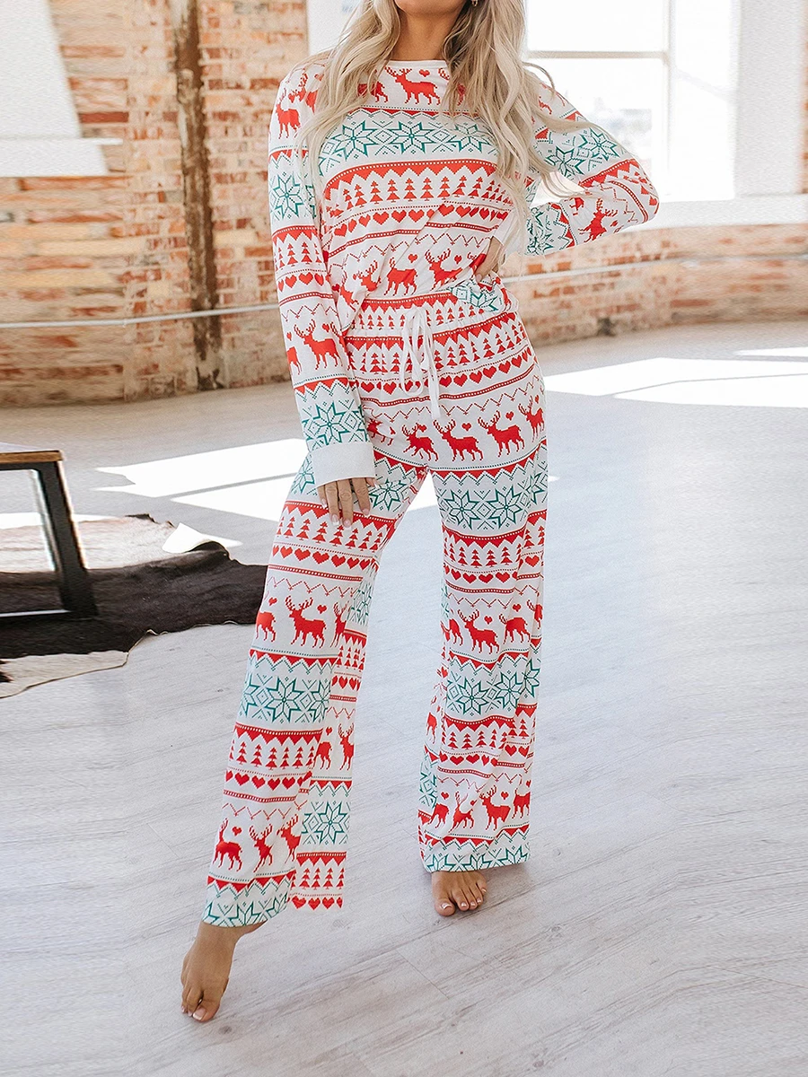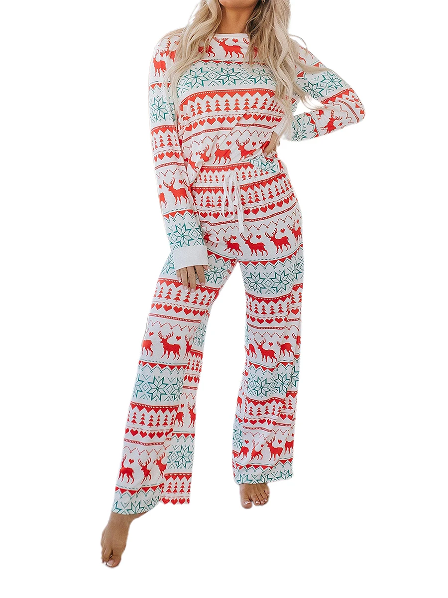 Women s Christmas Pajama Set Reindeer Print Round Neck Long Sleeve Tops Drawstring Long Pants