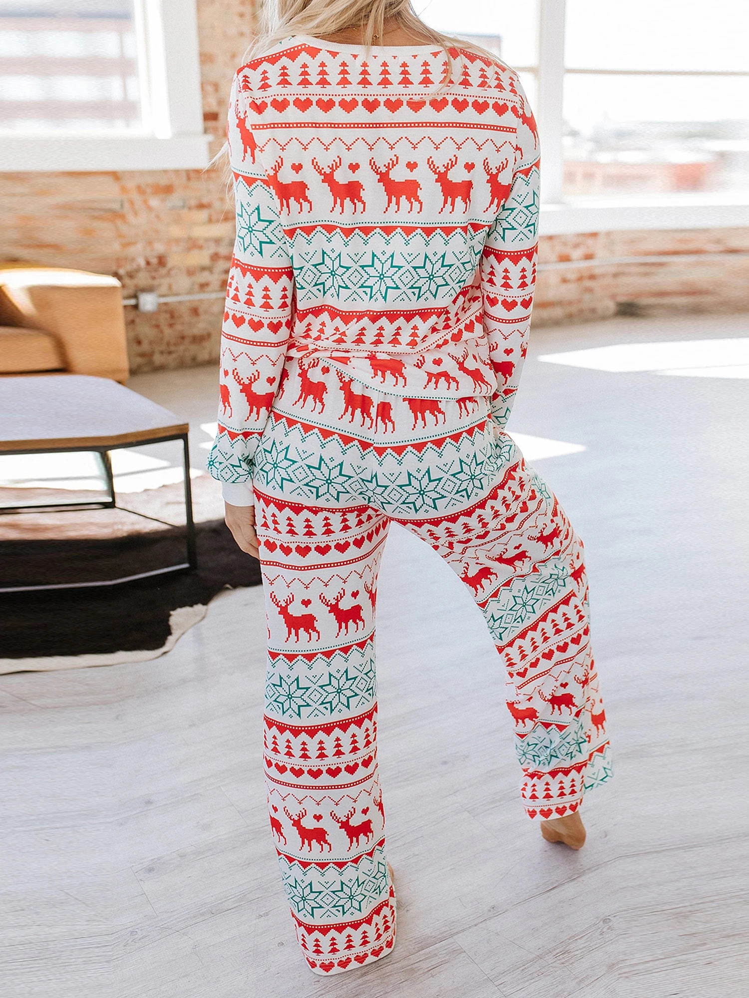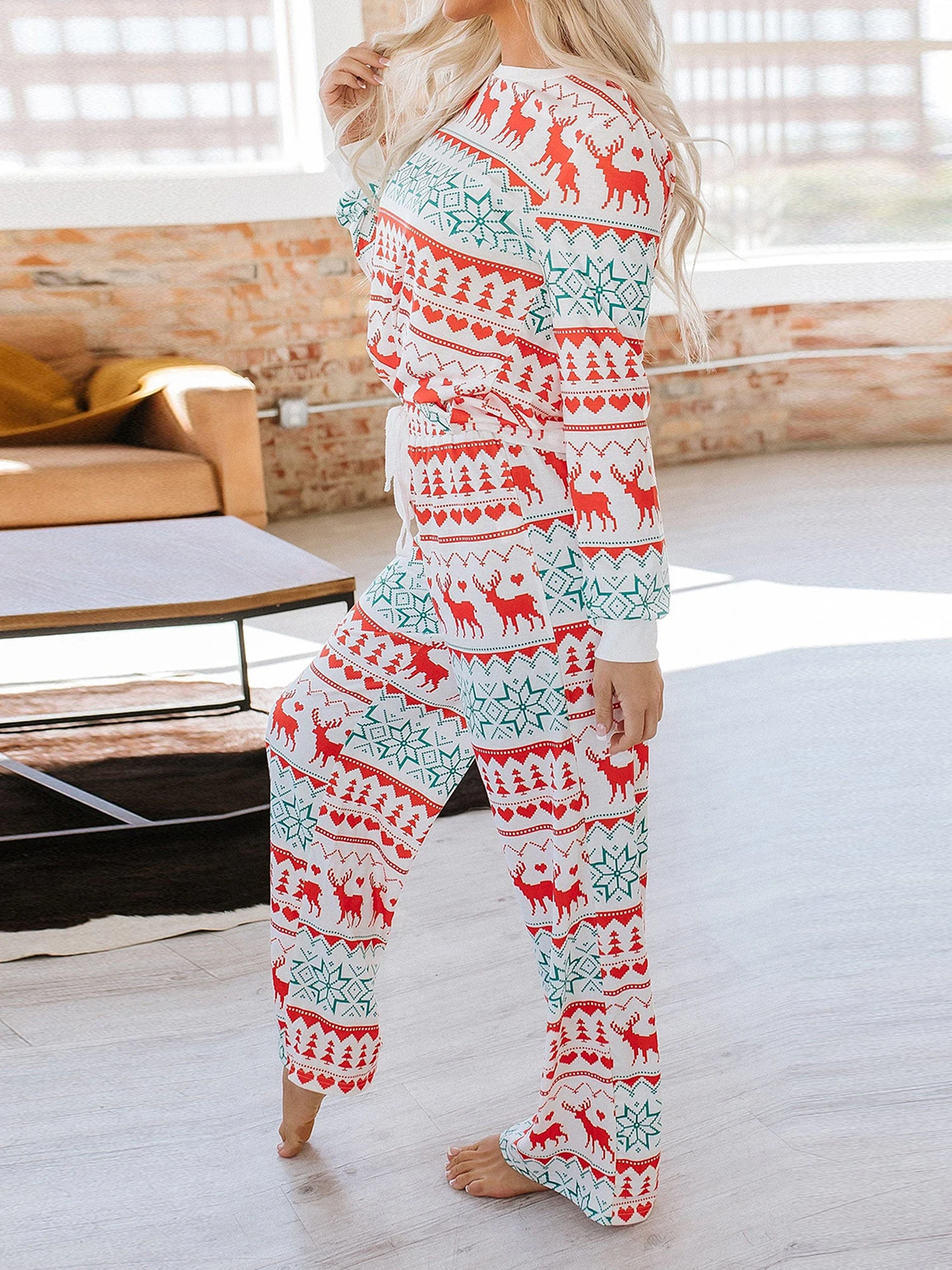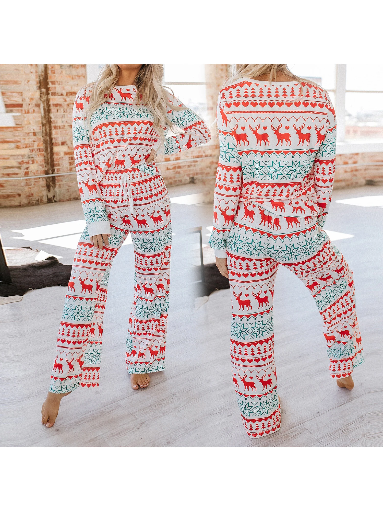 Women s Christmas Pajama Set Reindeer Print Round Neck Long Sleeve Tops Drawstring Long Pants