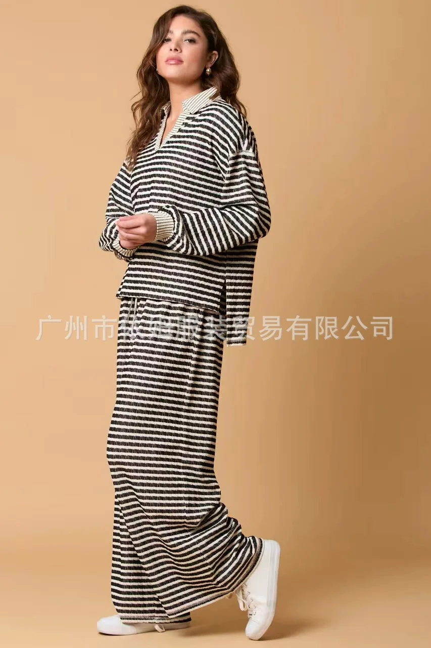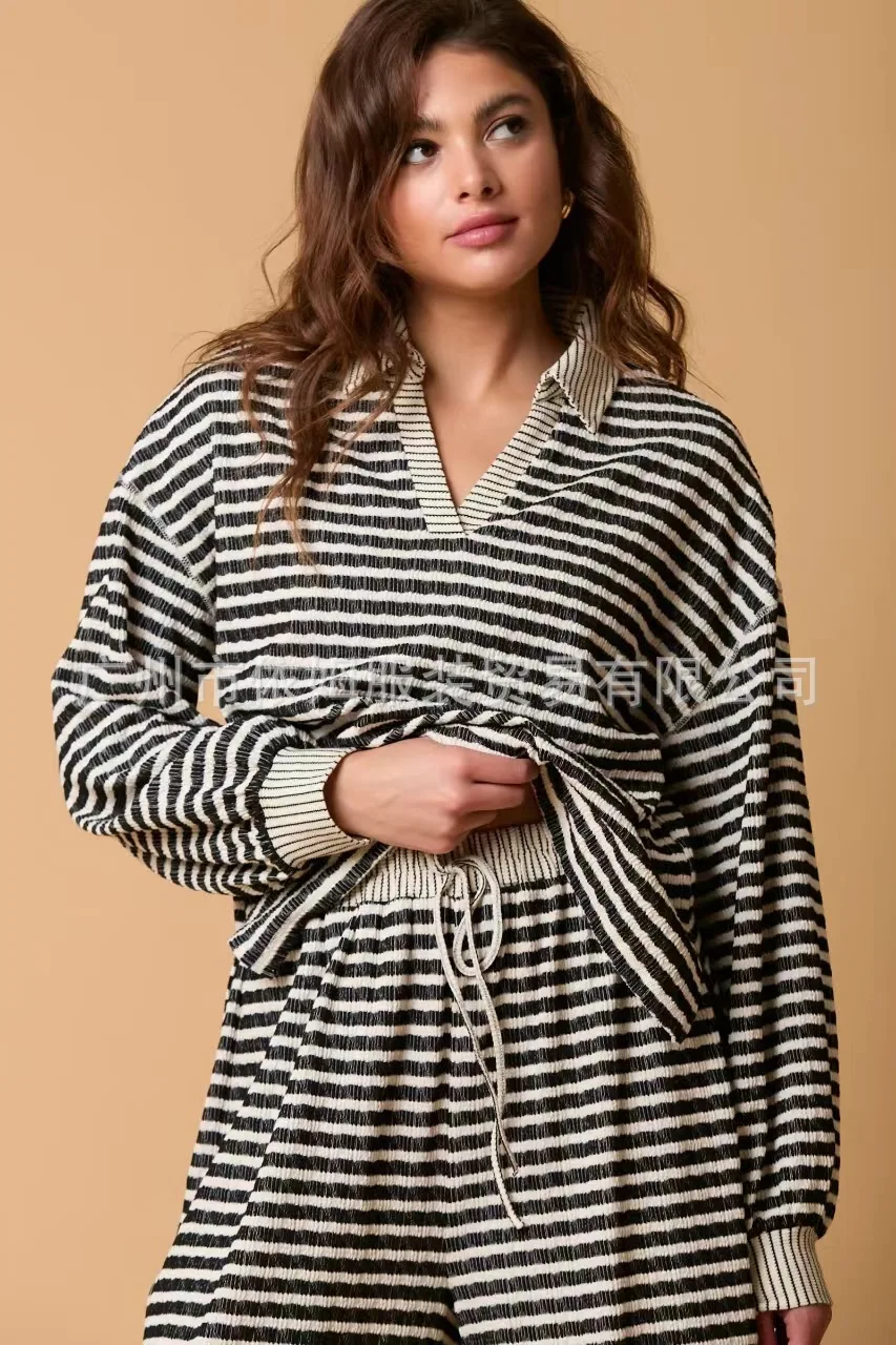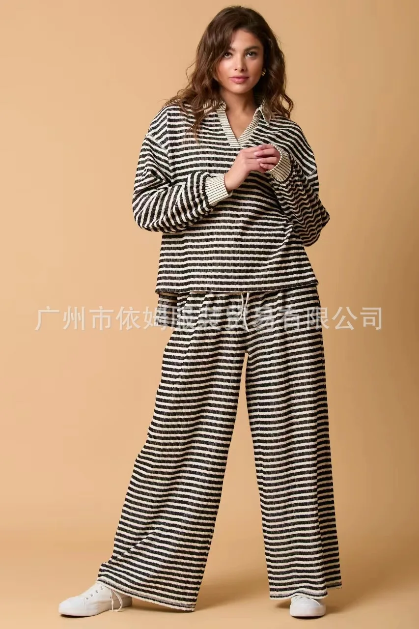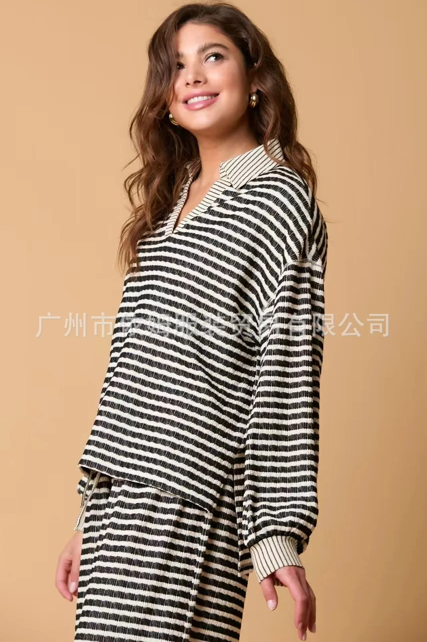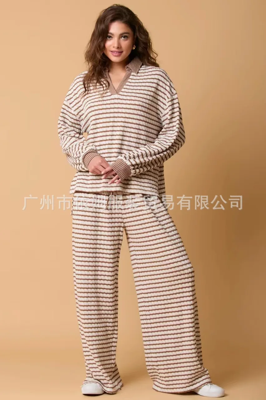 Zay Women's Autumn and Winter New Splicing Turn Down Collar Two-color Striped Long Sleeved Pants Two-piece Fashionable Casual Suit