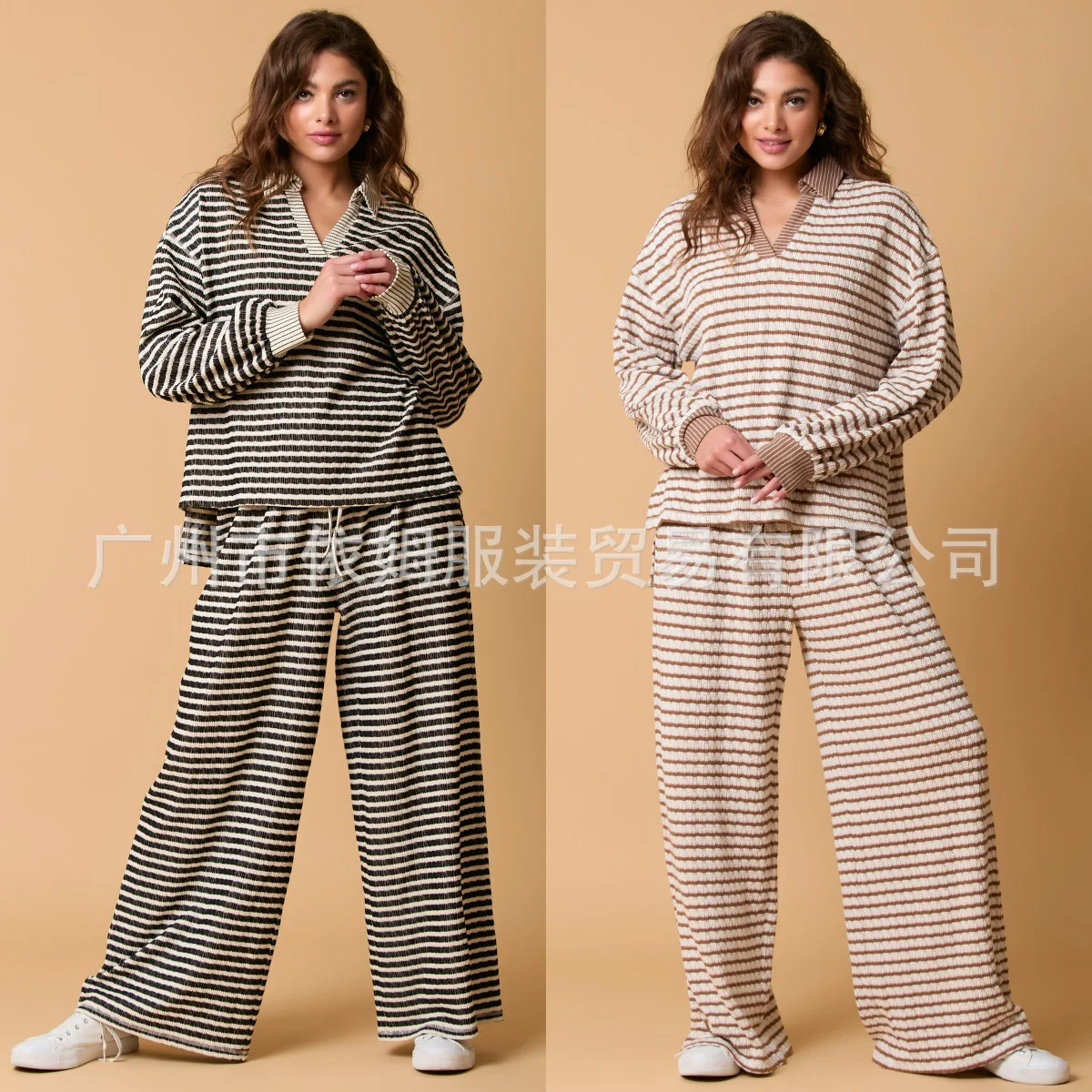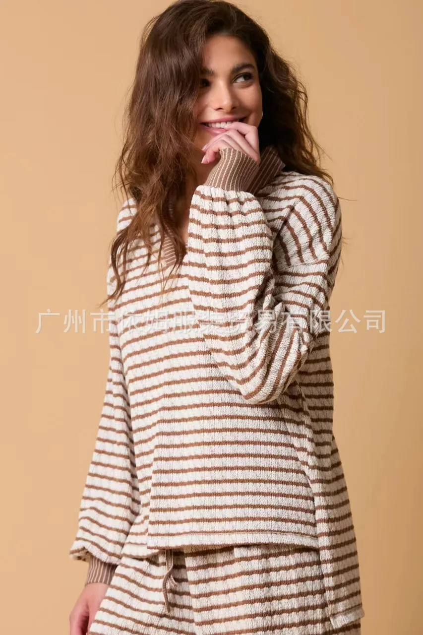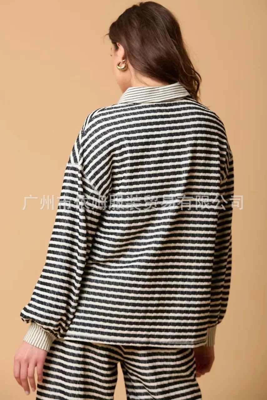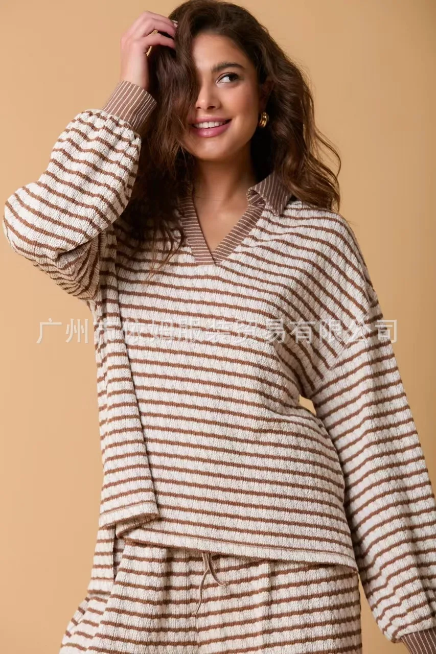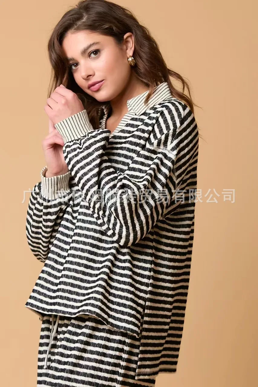 Zay Women's Autumn and Winter New Splicing Turn Down Collar Two-color Striped Long Sleeved Pants Two-piece Fashionable Casual Suit