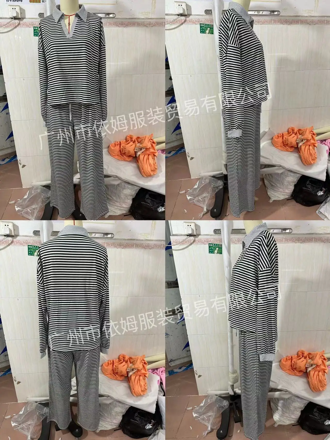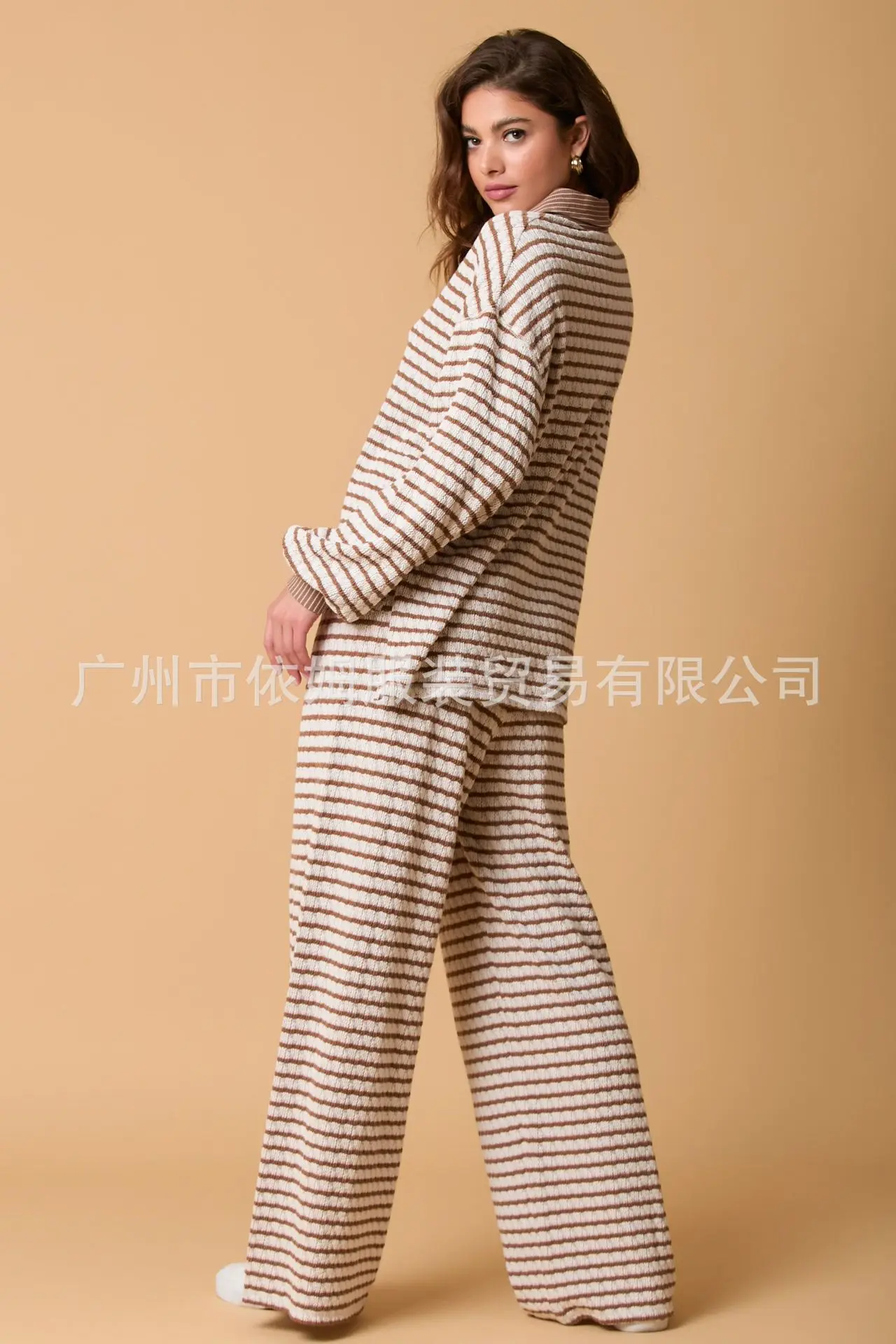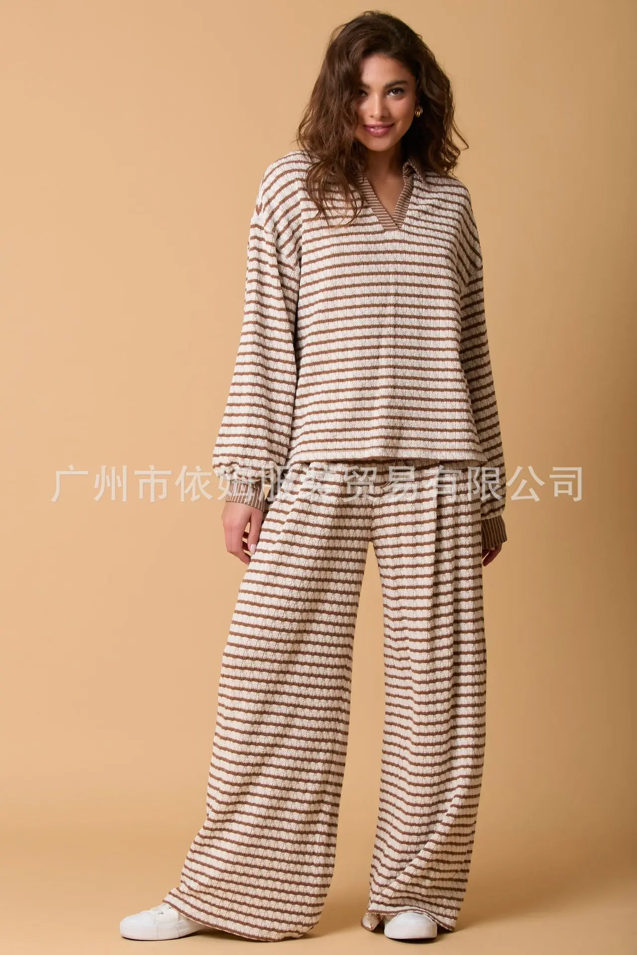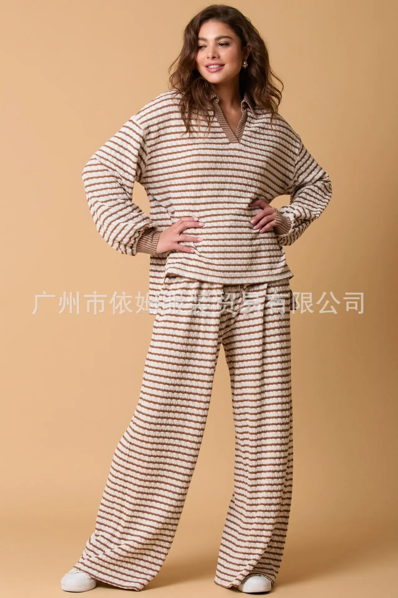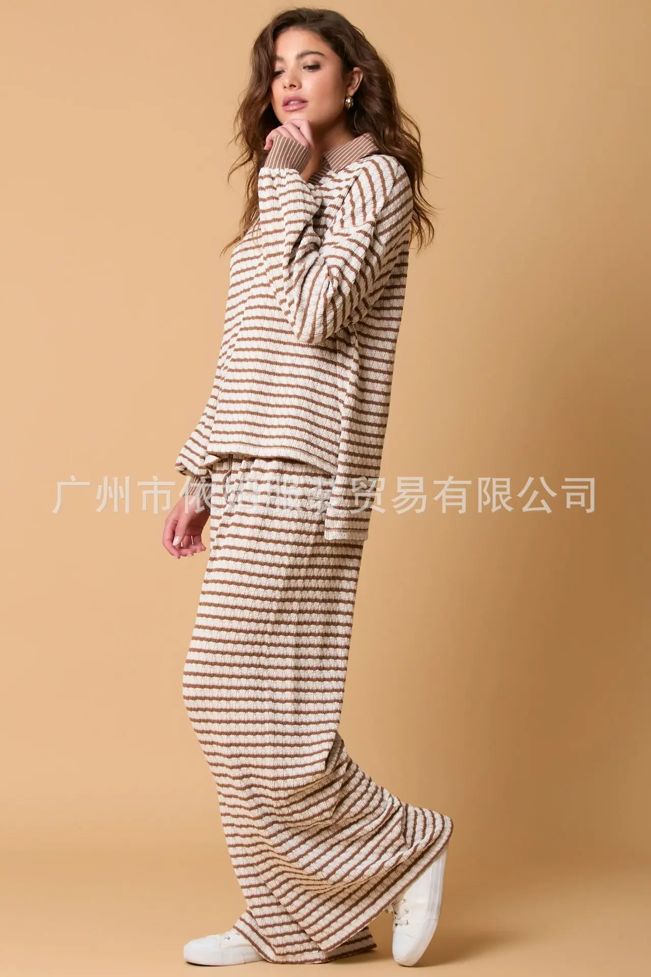 Zay Women's Autumn and Winter New Splicing Turn Down Collar Two-color Striped Long Sleeved Pants Two-piece Fashionable Casual Suit