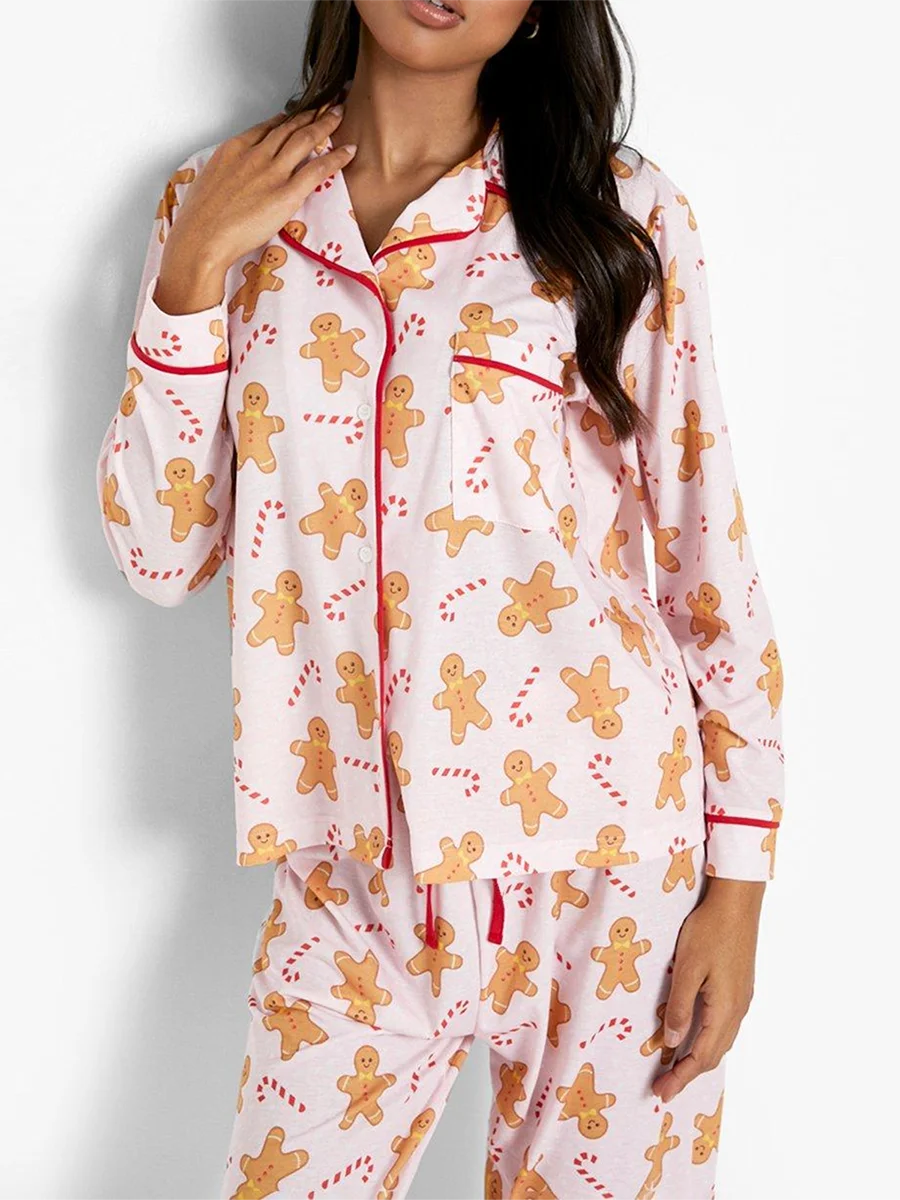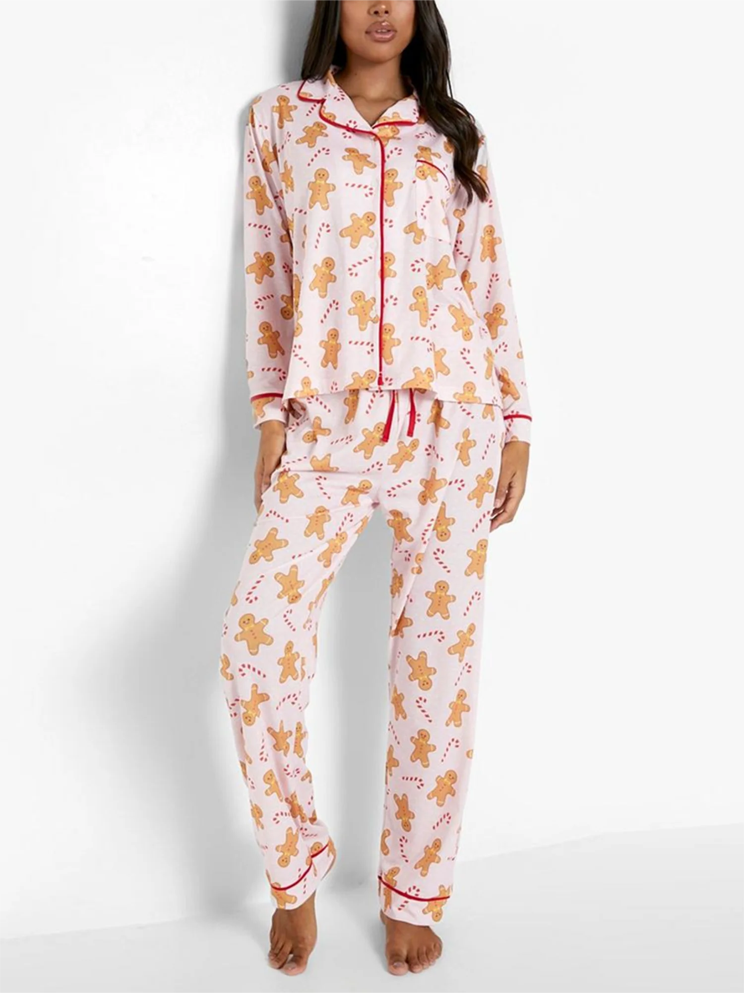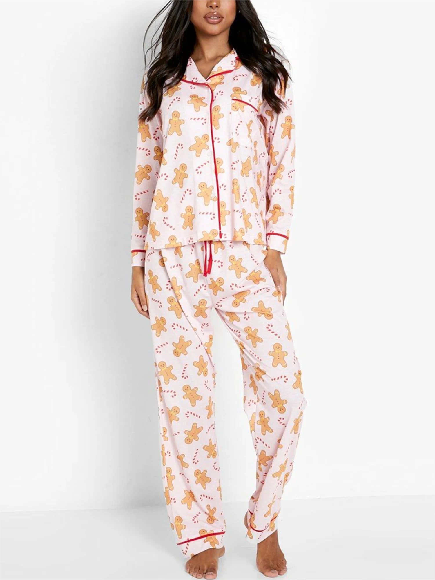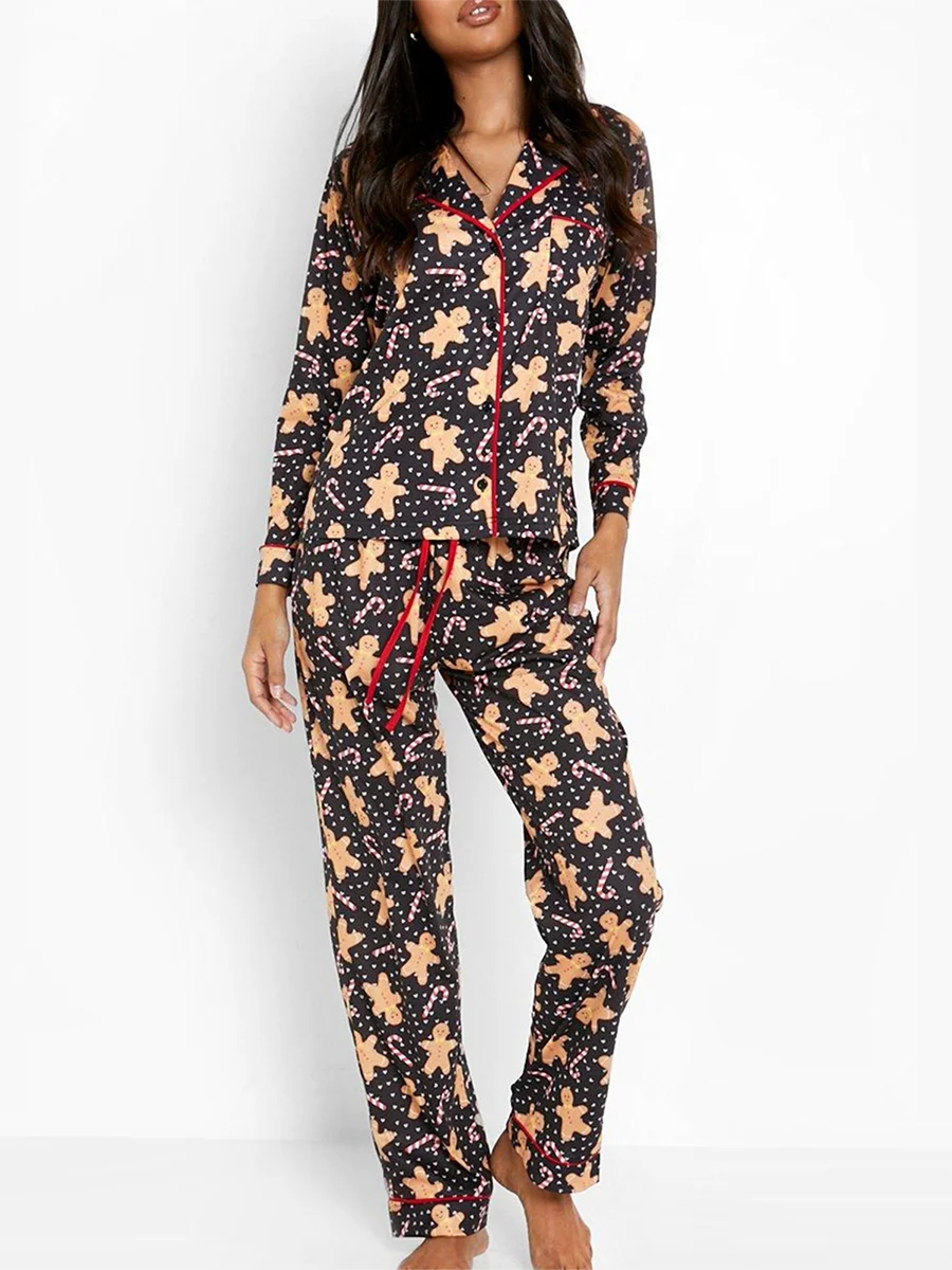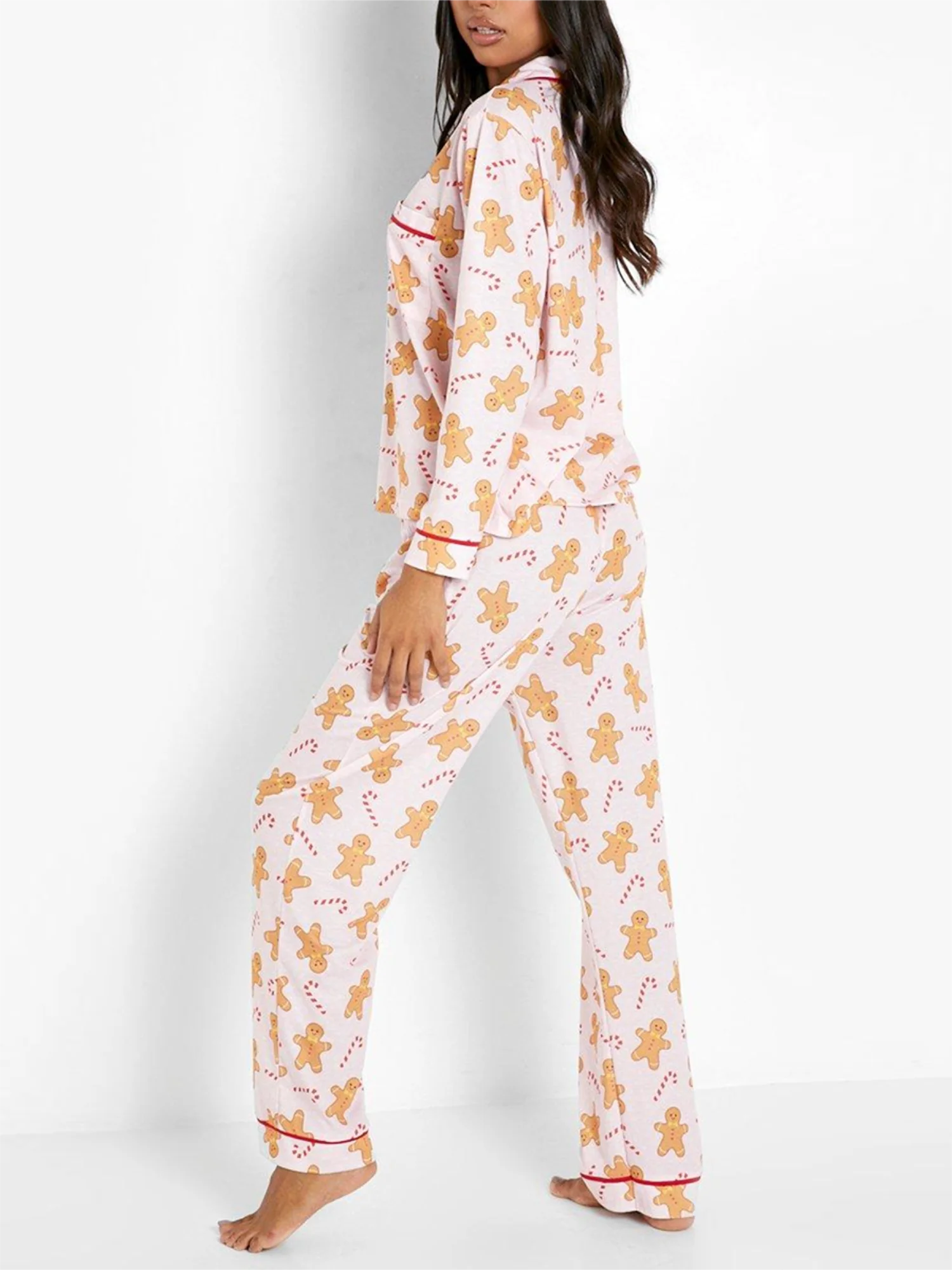 Womens Christmas Print Pajamas Set Long Sleeve Turn-down Collar Tops and Pants Loungewear Set