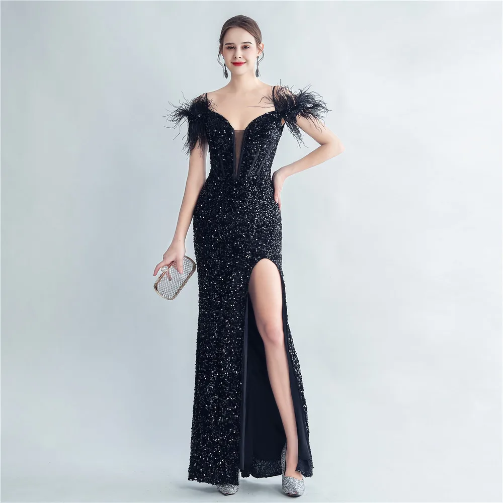 Zay Women's Elegant Long Dresses with A Bling and Feathers, Split Sequin Glitter, Evening, Wedding Guest, Special Events, High End,