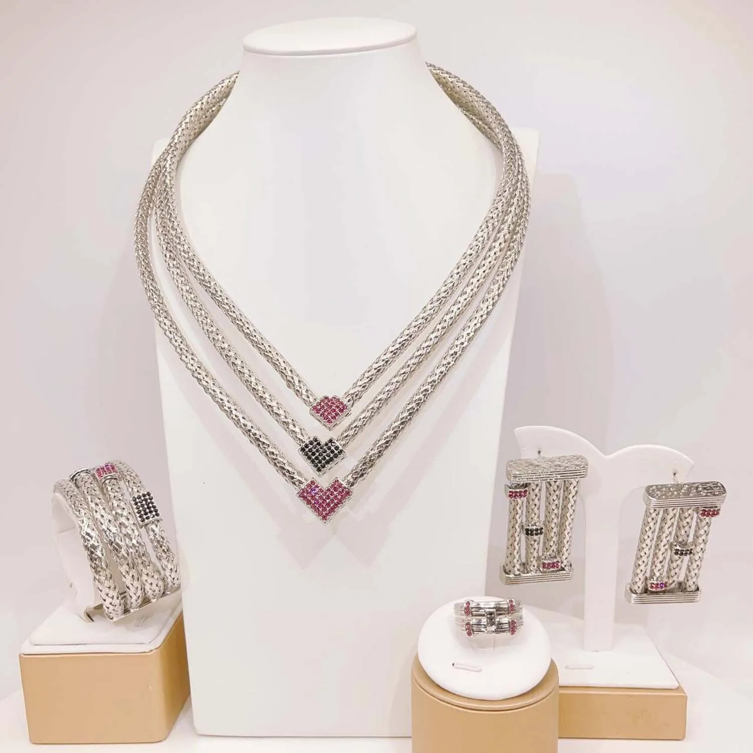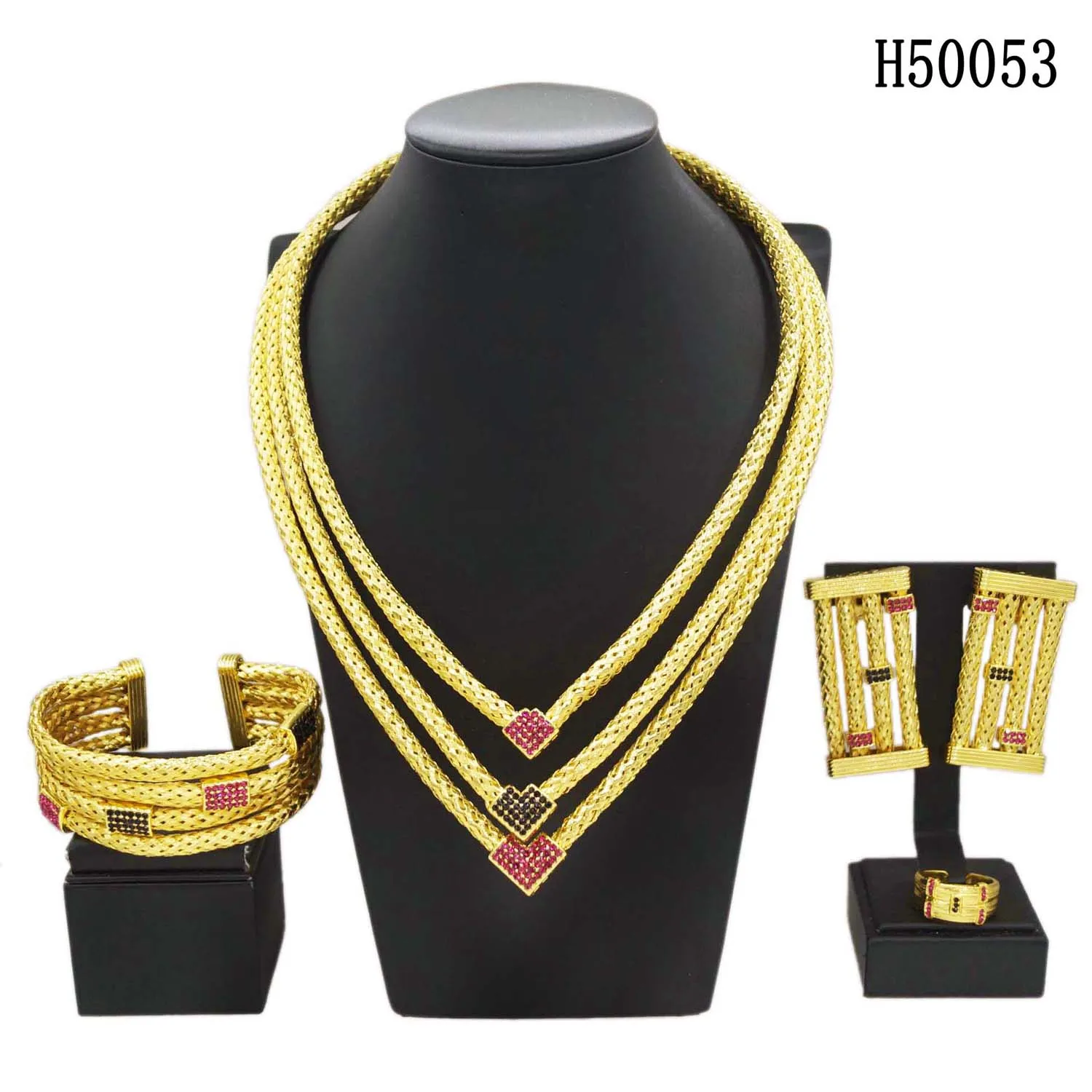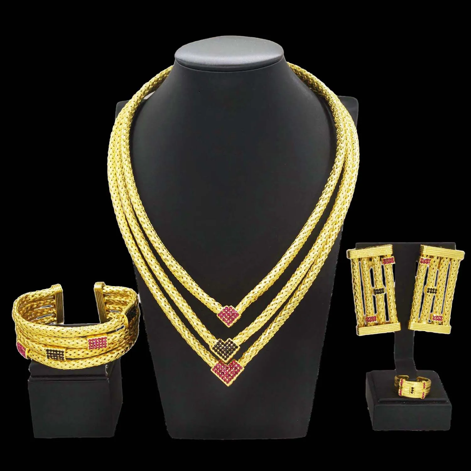 Yulaili's new unique design jewelry set Italian gold plated three layer copper ring advanced African Dubai bride wedding necklace ring